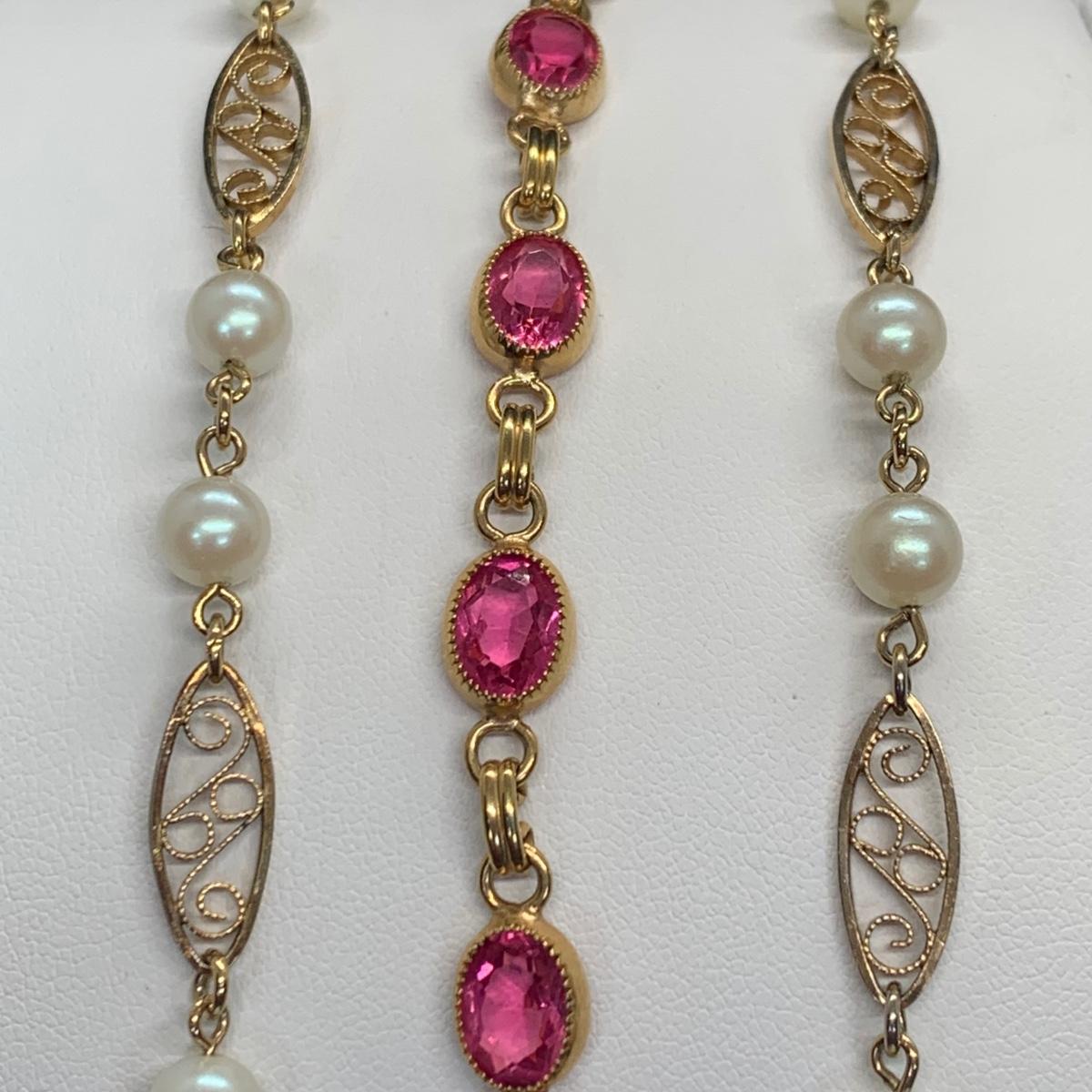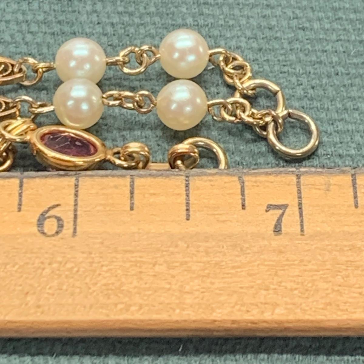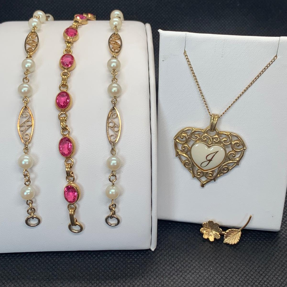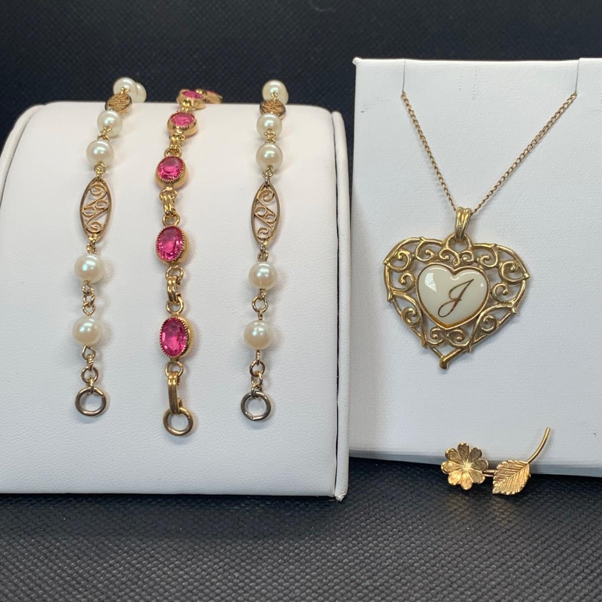 Lot 188: Lenox Gold Vermeil Pendant w/16" Gold Fill Chain, Catamore 12K Gold Fill Pink Crystal Bracelet 7", Pearl Bracelets 1/20 12K Gold Fill 7" and Wells 14K Gold Fill Brooch