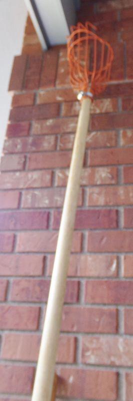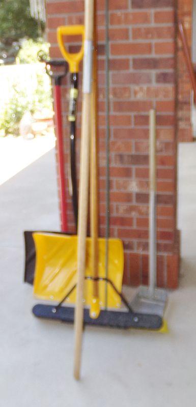 2 SNOW SHOVELS, PUSH BROOM, FRUIT PICKING TOOLS