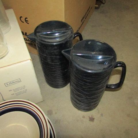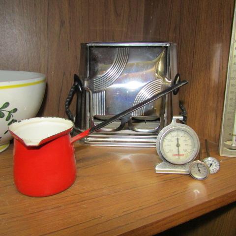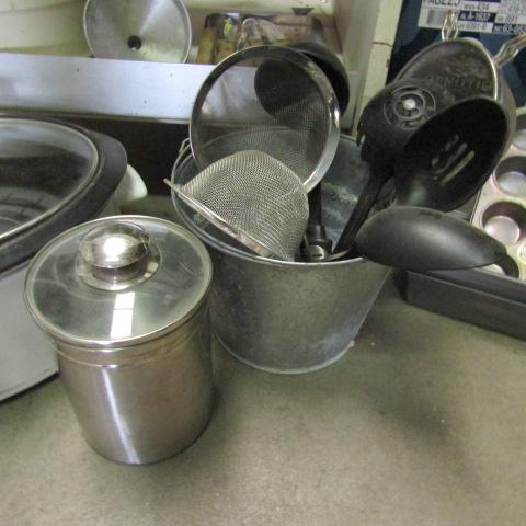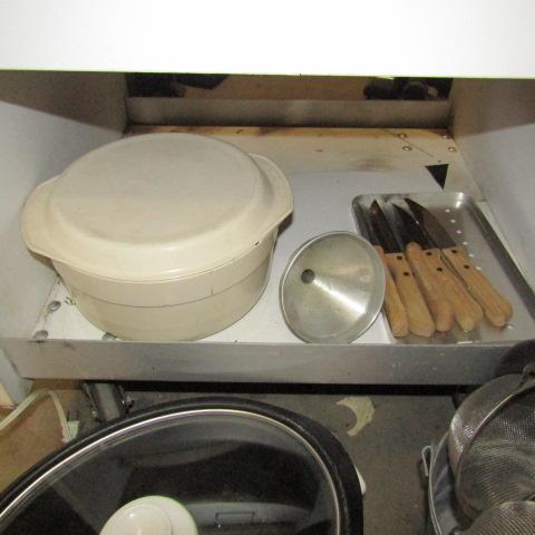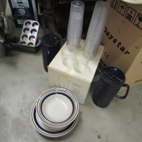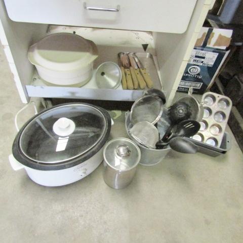 UTENSILS, BAKING PANS, CROCKPOT (SHOWS WEAR), PLASTIC DRINKING GLASSES, DINNERWARE, SERVING BOWL, THERMOMETERS, MUSTACHE CUP AND MORE