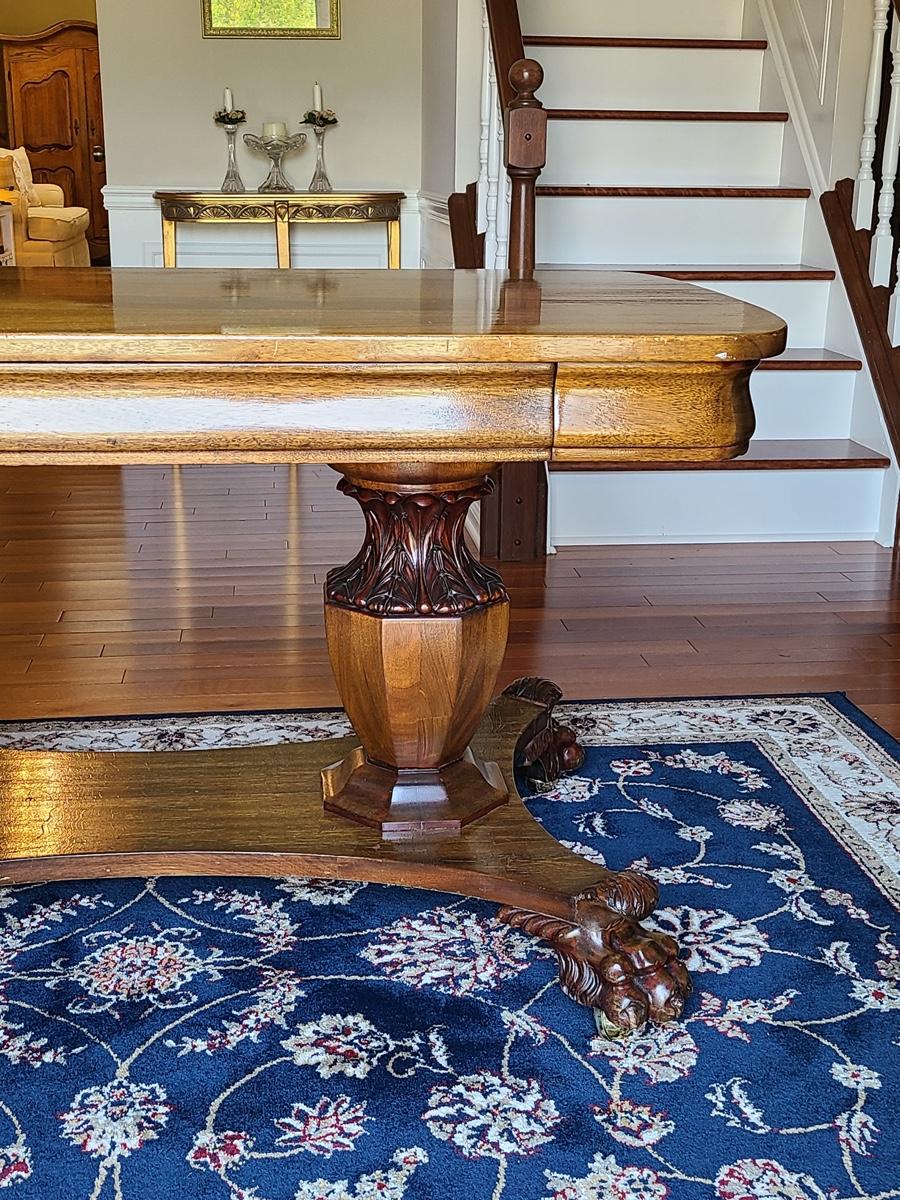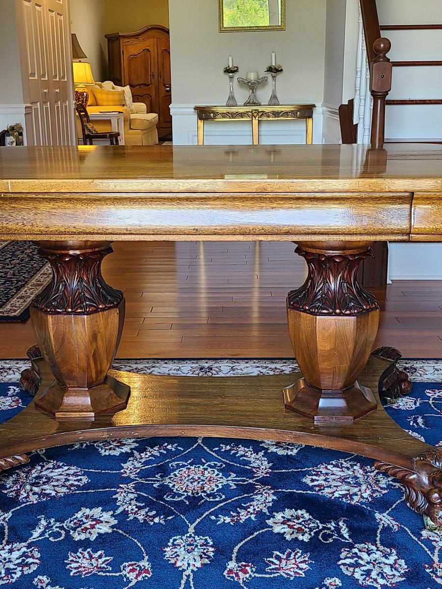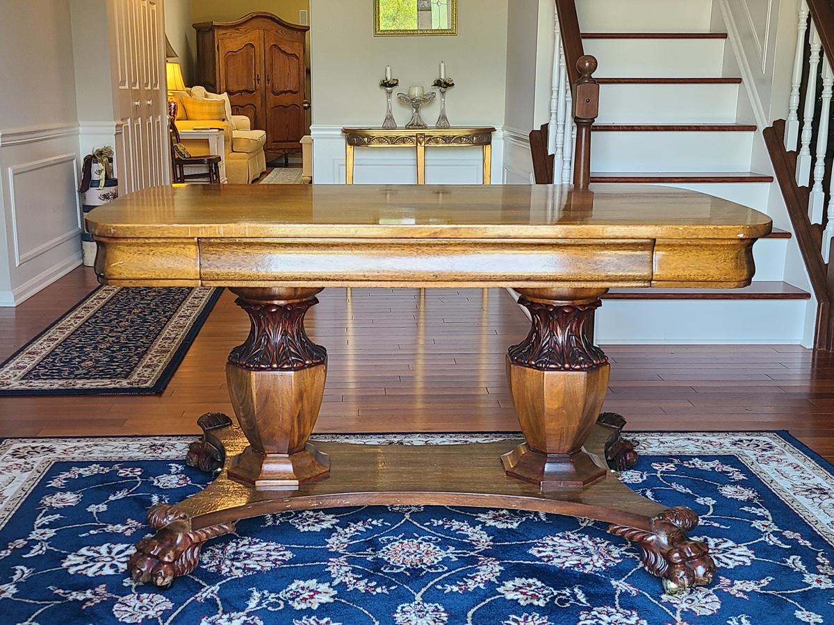 52x32x30 inches tall. This piece is stunning and is perfect for any room. Can be used as an entryway piece such as the pictures show, or as a sofa table in a large living room. The caved pedestal bases and claw feet are true character of this piece! Solid, with a drawer in front! Please see all pictures as they are the best representation of the items in the lot, the condition of the lot, and will show measurements if taken. If purchasing furniture you must be able to move yourself with your own help, and truck. This is located on the first floor.