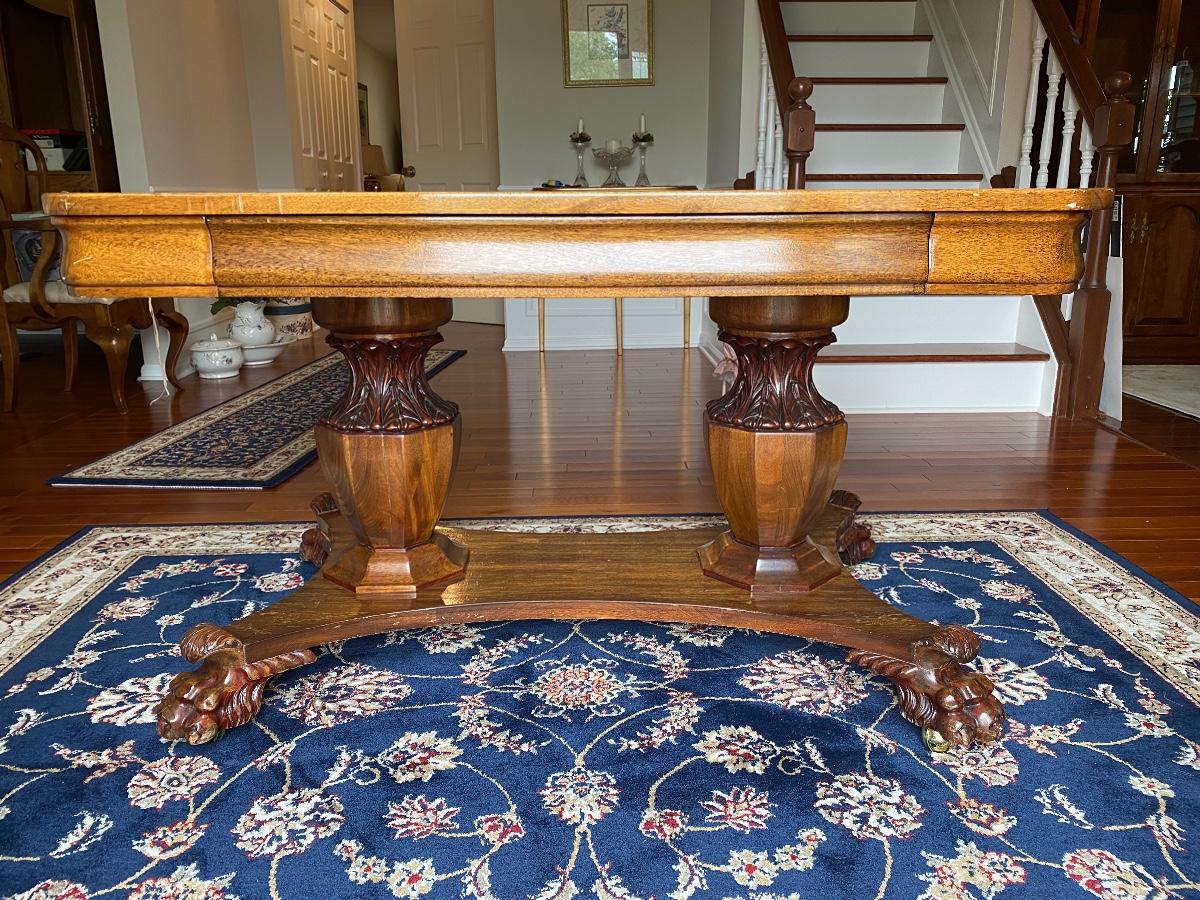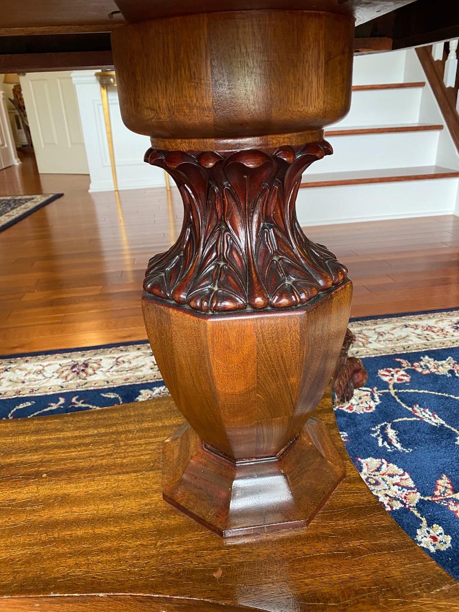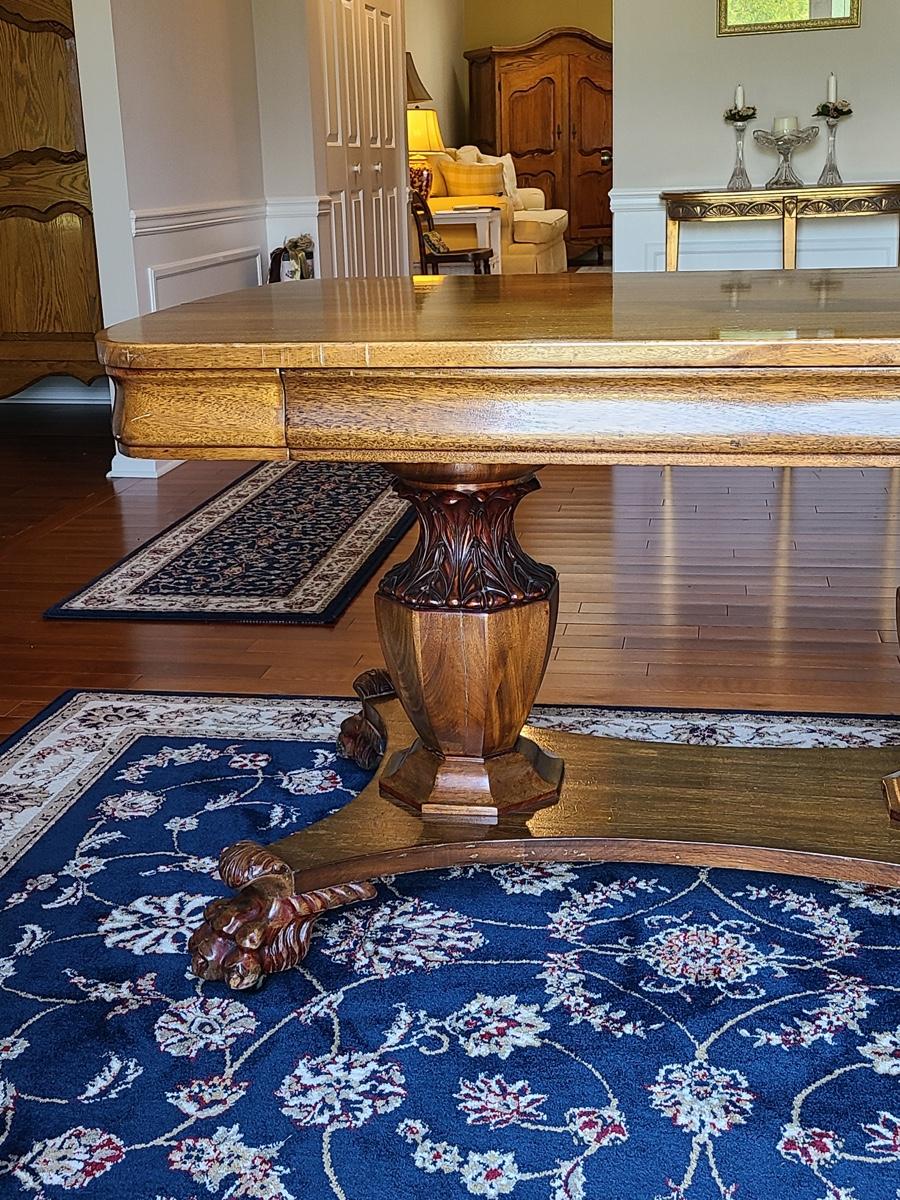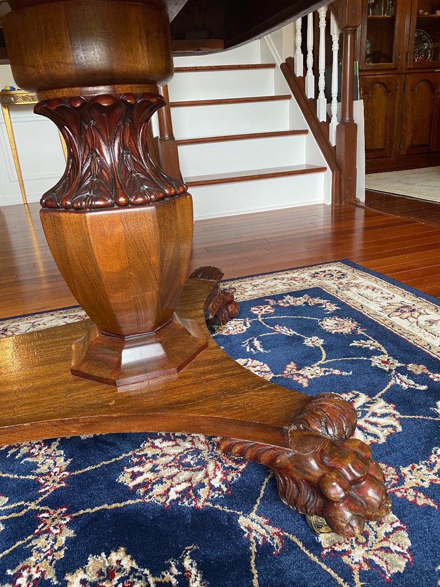 52x32x30 inches tall. This piece is stunning and is perfect for any room. Can be used as an entryway piece such as the pictures show, or as a sofa table in a large living room. The caved pedestal bases and claw feet are true character of this piece! Solid, with a drawer in front! Please see all pictures as they are the best representation of the items in the lot, the condition of the lot, and will show measurements if taken. If purchasing furniture you must be able to move yourself with your own help, and truck. This is located on the first floor.