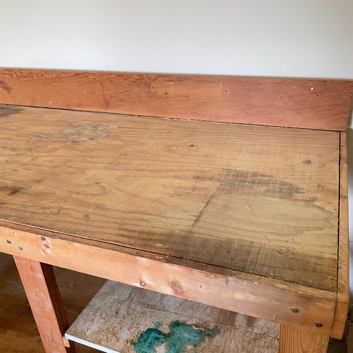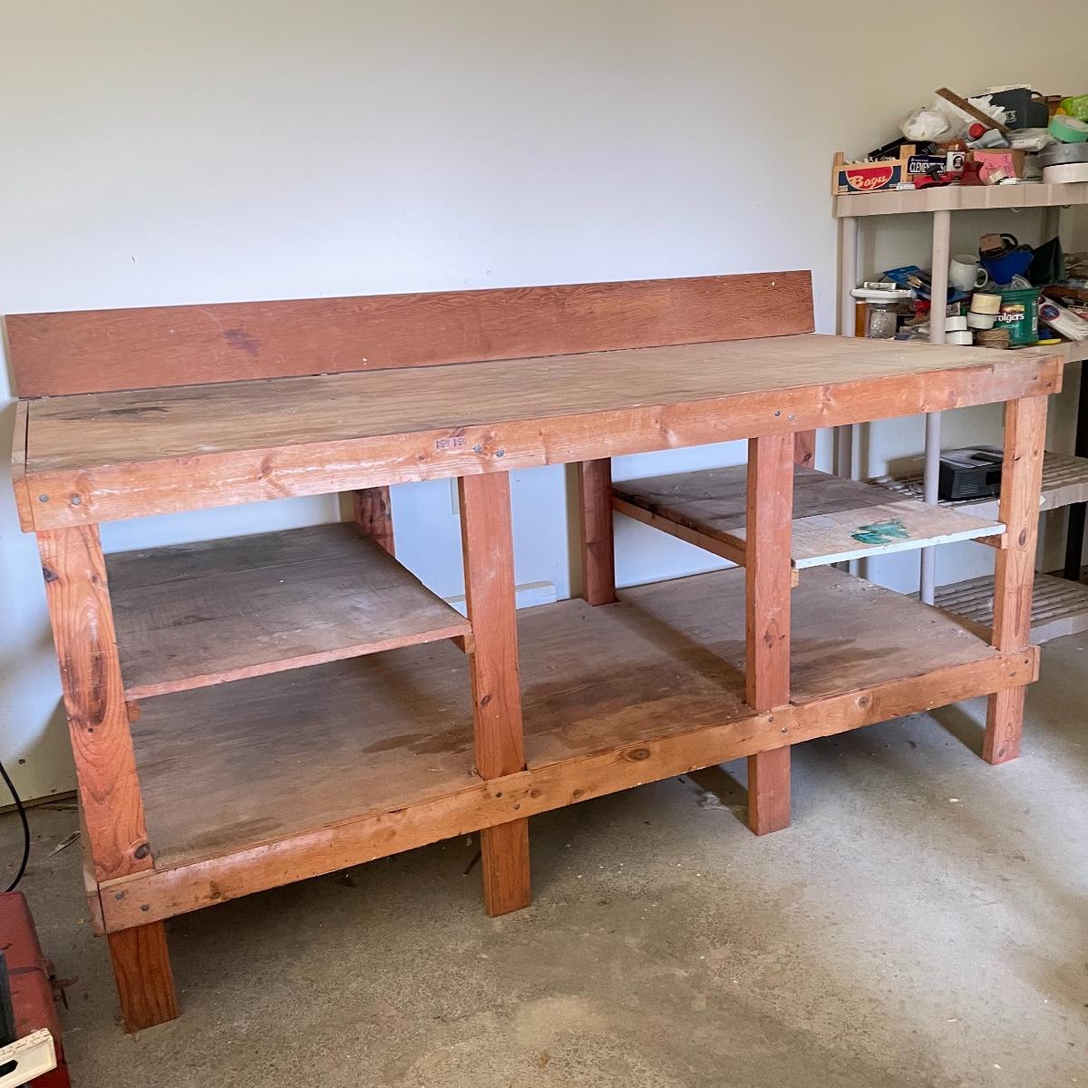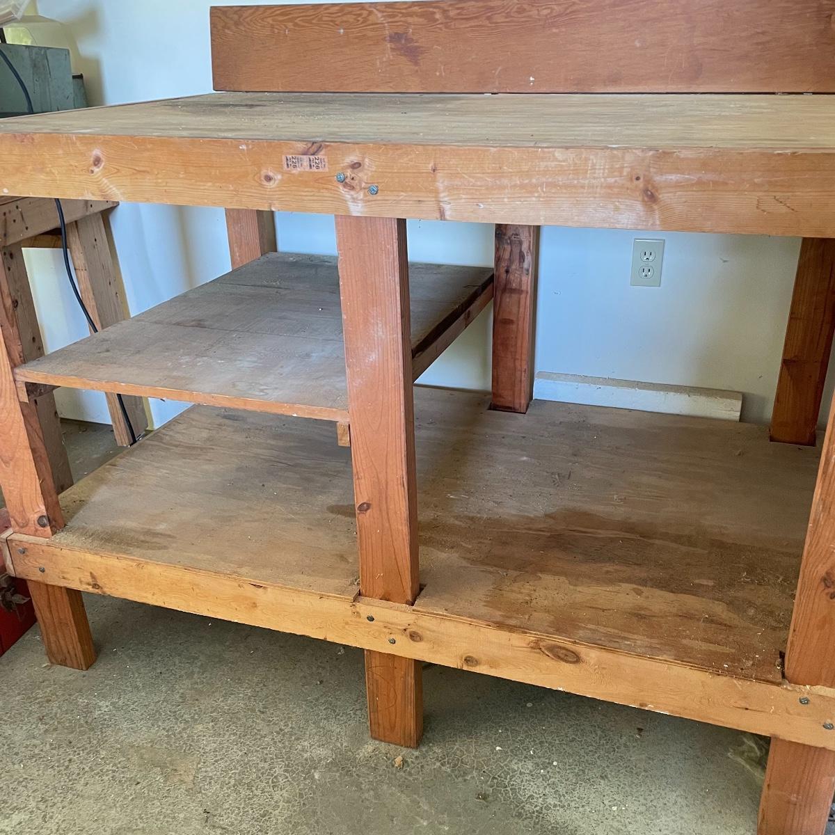 Grand wooden workbench for your shop. This handmade piece is large, measuring 85.5” x 36” x 47.5”. The table top is 40” high. It’s a mix of solid and ply wood secured with a variety of hardware. Please bring help to load, piece is conveniently located in garage. Local pick up only.