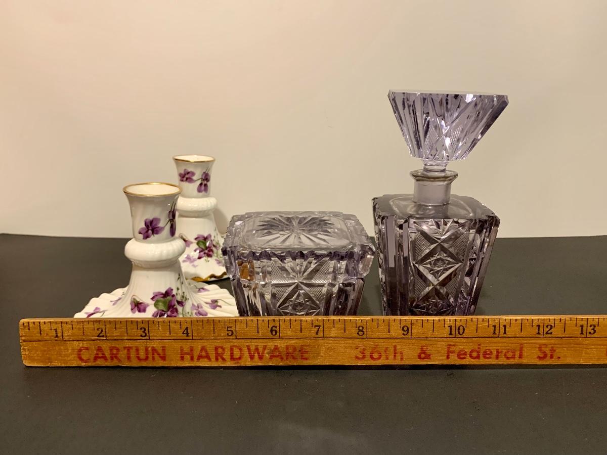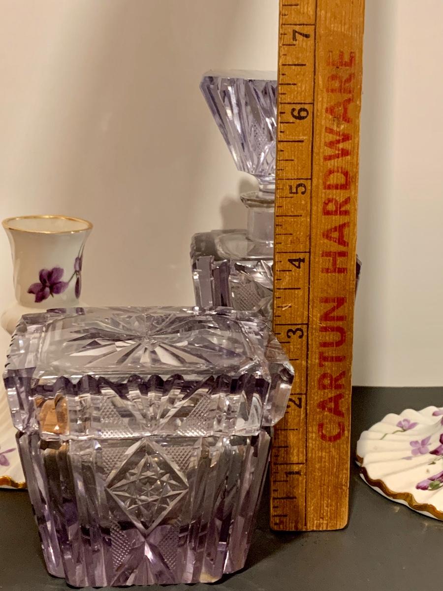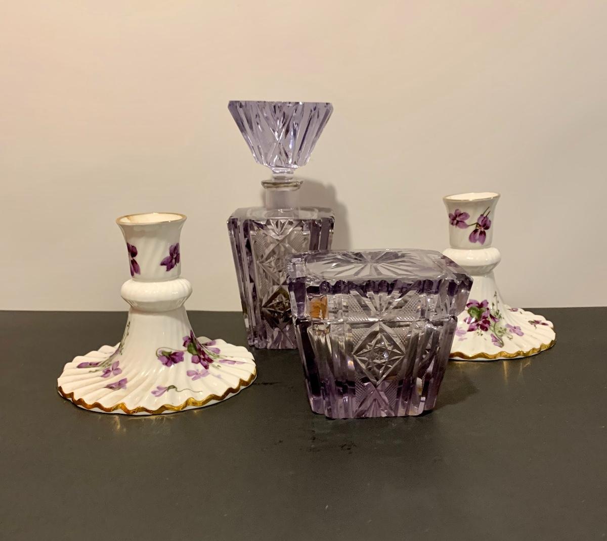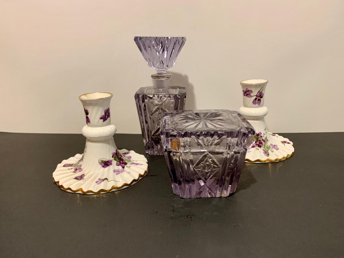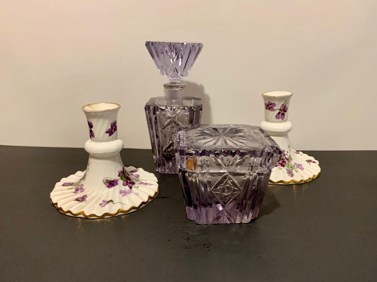 Fabulous pair of vintage "Victorian Violets" bone china candlesticks by Hammersley made in England. and beautiful colored Amethyst colored cut glass trinket box and perfume bottle. These are older and show some wear to the edges. Please see all pictures as they are the best representation of the items. The pictures show condition, measurements if taken, and what is included in the lot. Due to the large amount that we photograph and the time frame, we are not always able to take measurements. All items unless noted, are pre-owned and have been used. If you purchased furniture, you must bring help. We do not allow one person to carry large furniture out on their own. Bring help, tools and a truck for the safety of our client’s homes, and your personal safety. Company policy. Thank you.