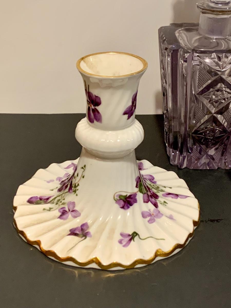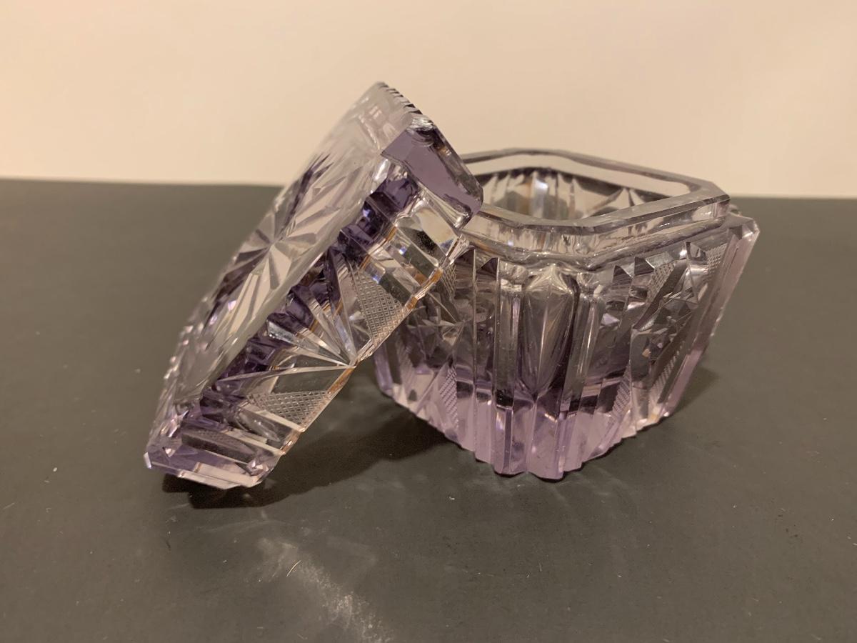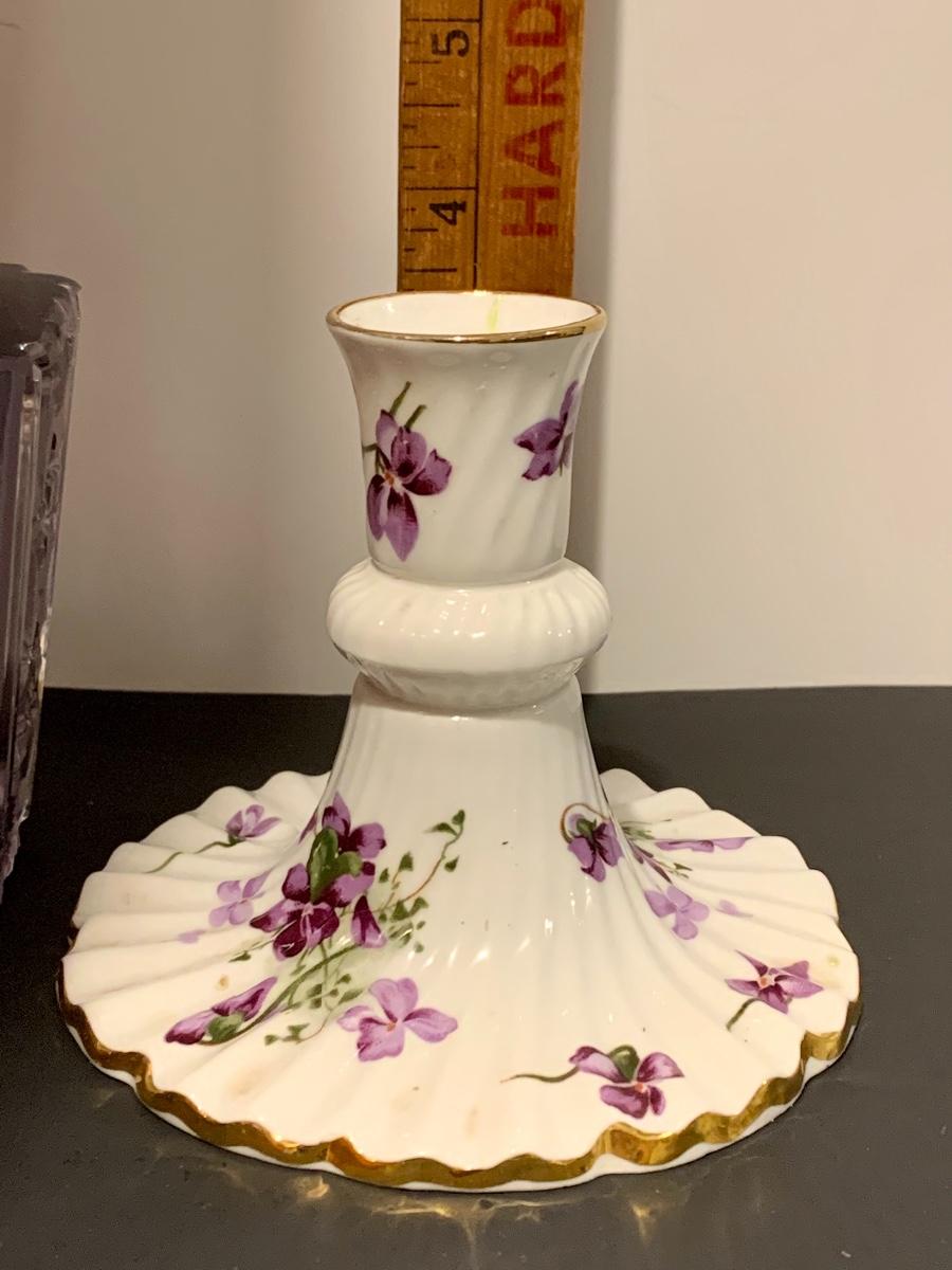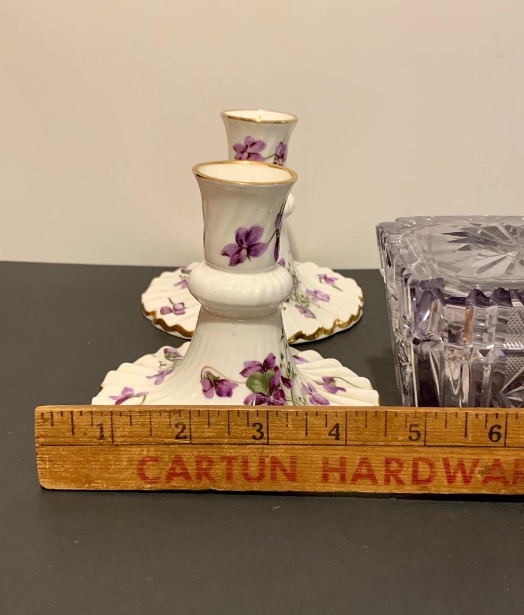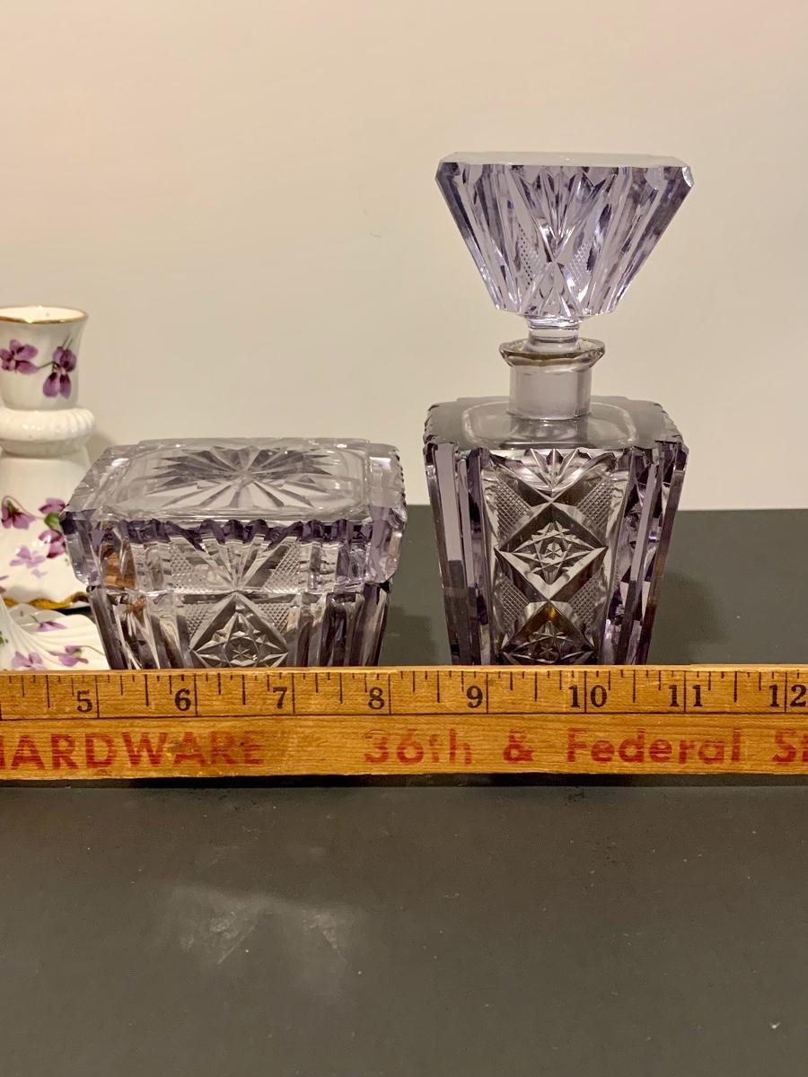 Fabulous pair of vintage "Victorian Violets" bone china candlesticks by Hammersley made in England. and beautiful colored Amethyst colored cut glass trinket box and perfume bottle. These are older and show some wear to the edges. Please see all pictures as they are the best representation of the items. The pictures show condition, measurements if taken, and what is included in the lot. Due to the large amount that we photograph and the time frame, we are not always able to take measurements. All items unless noted, are pre-owned and have been used. If you purchased furniture, you must bring help. We do not allow one person to carry large furniture out on their own. Bring help, tools and a truck for the safety of our client’s homes, and your personal safety. Company policy. Thank you.
