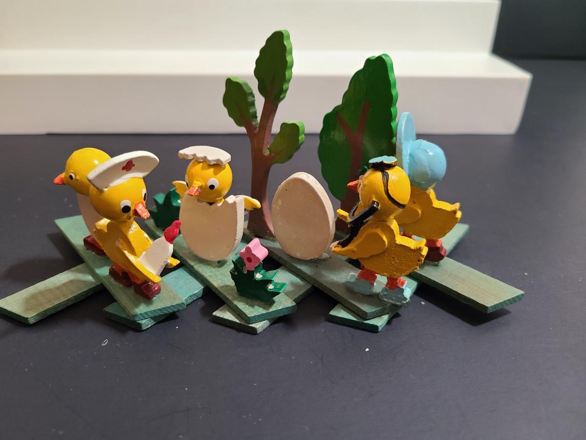 The one with the blue bunny had a repair and does not close all the way, could use some TLC to fix and one set has paint missing on a chick's head. The pictures show condition, measurements if taken, and what is included in the lot. Due to the large amount that we photograph and the time frame, we are not always able to take measurements. All items unless noted, are pre-owned and have been used. If you purchased furniture, you must bring help. We do not allow one person to carry large furniture out on their own. Bring help, tools and a truck for the safety of our client’s homes, and your personal safety. Company policy. Thank you.
