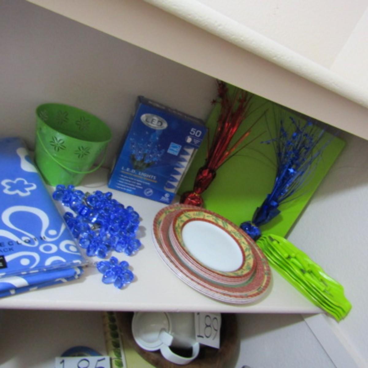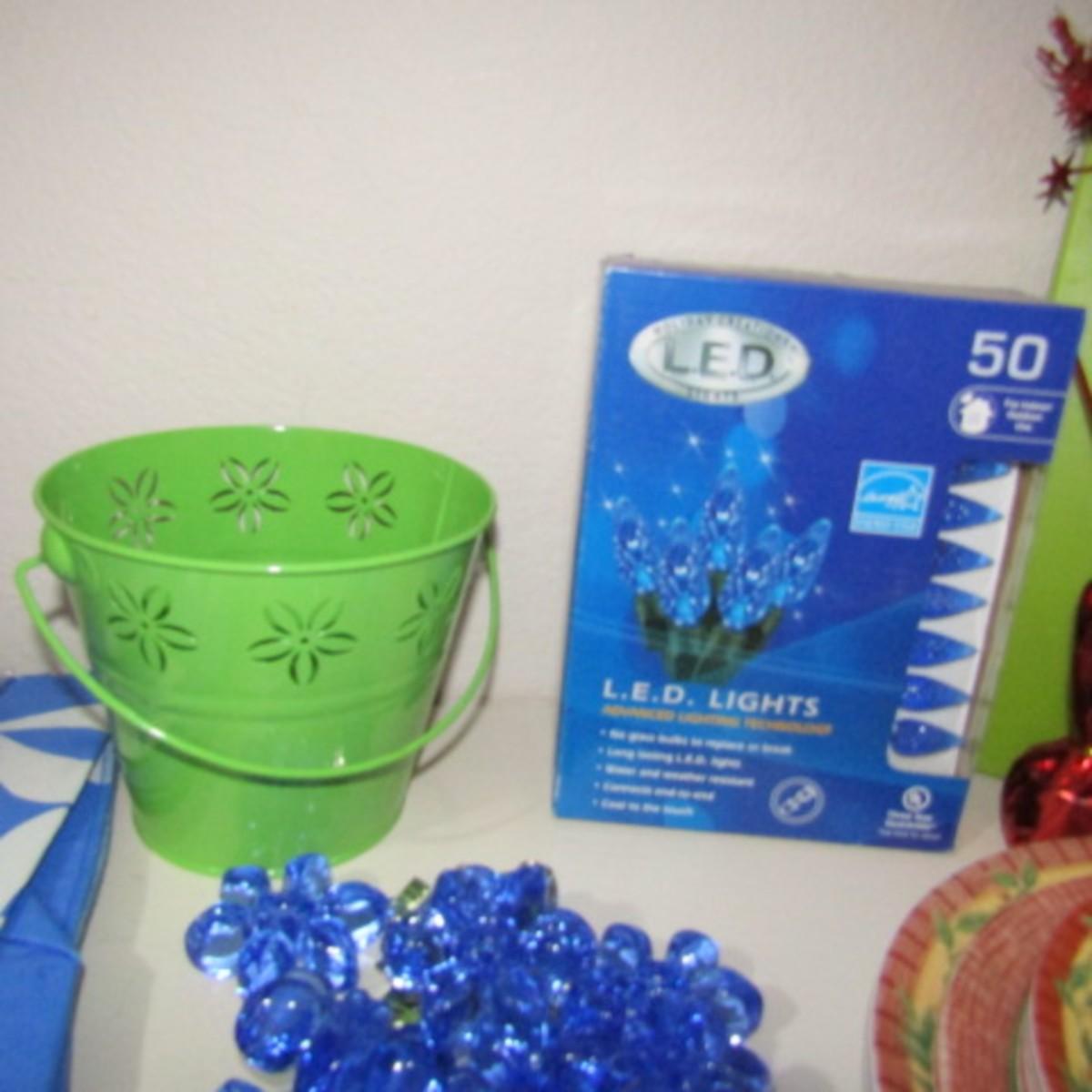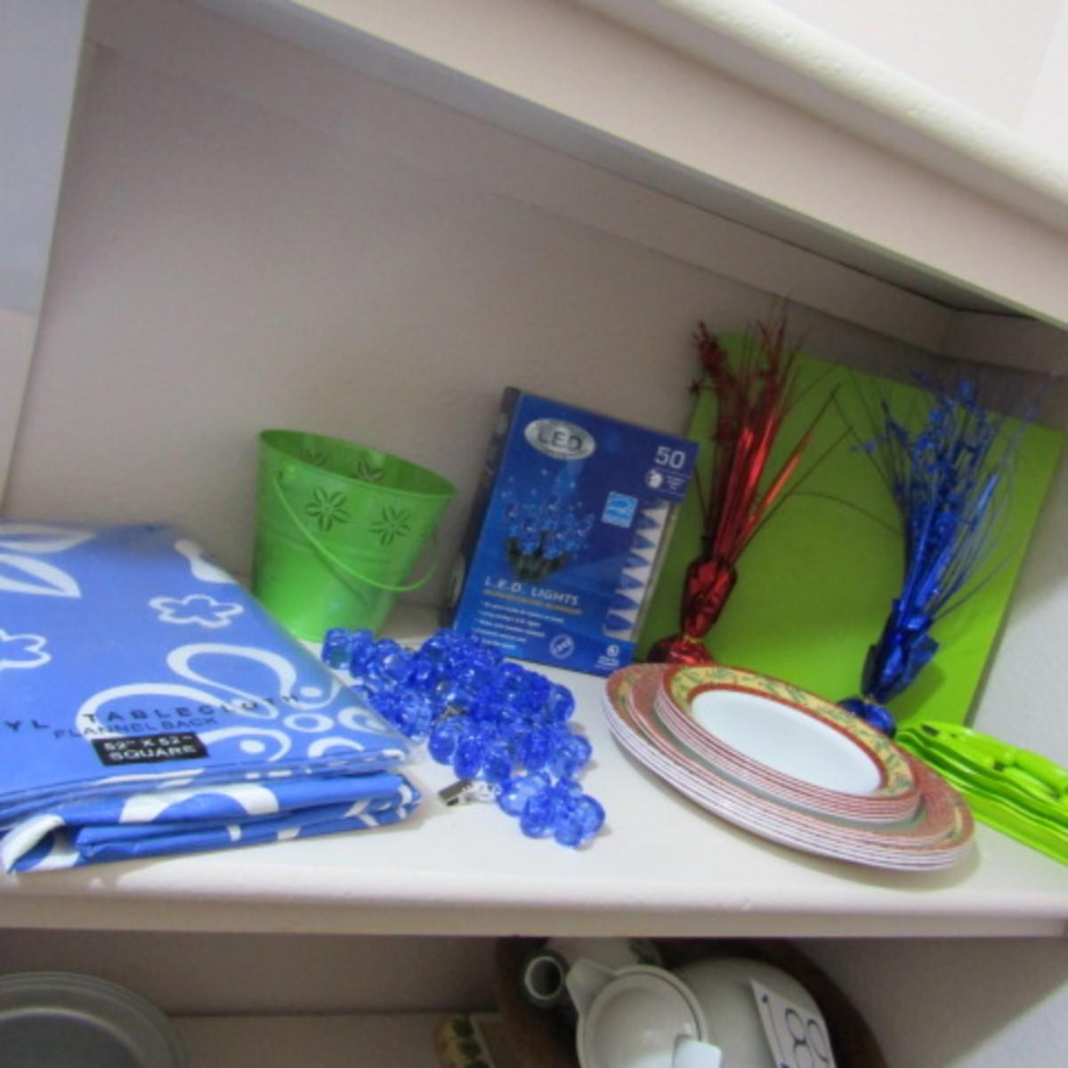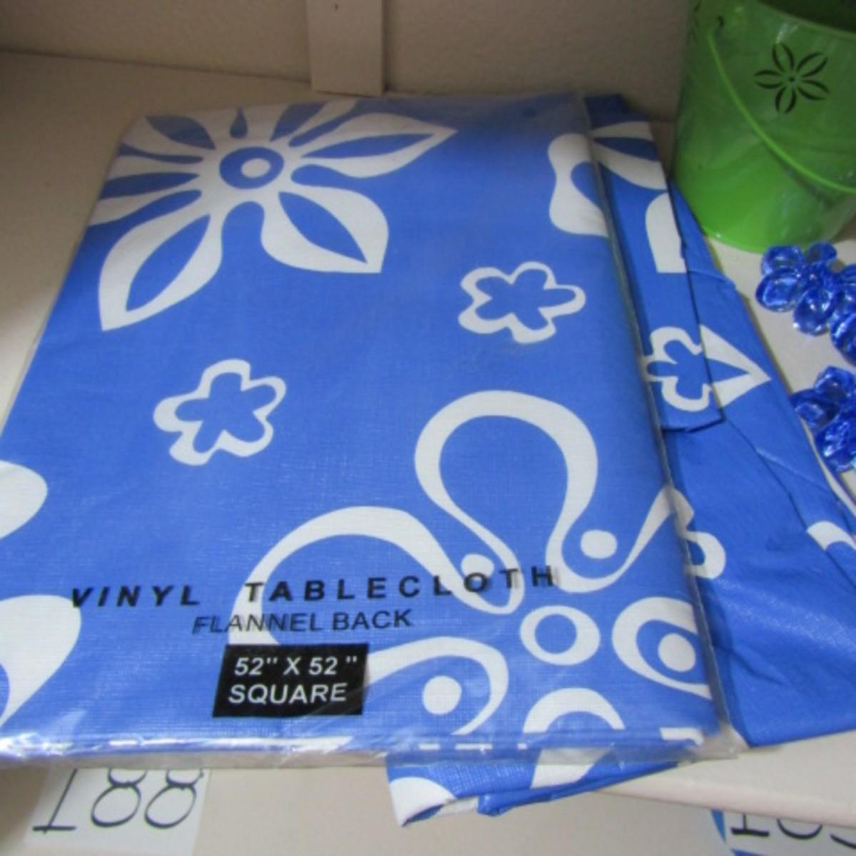 CORELLE PLATES, 2 VINYL TABLECLOTHS, BOX OF BLUE LIGHTS, CLIP-ON PLASTIC BLUE FLOWERS, GREEN CUTTING BOARD AND MORE