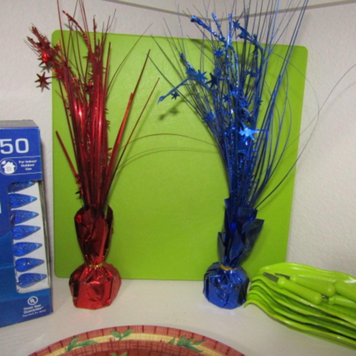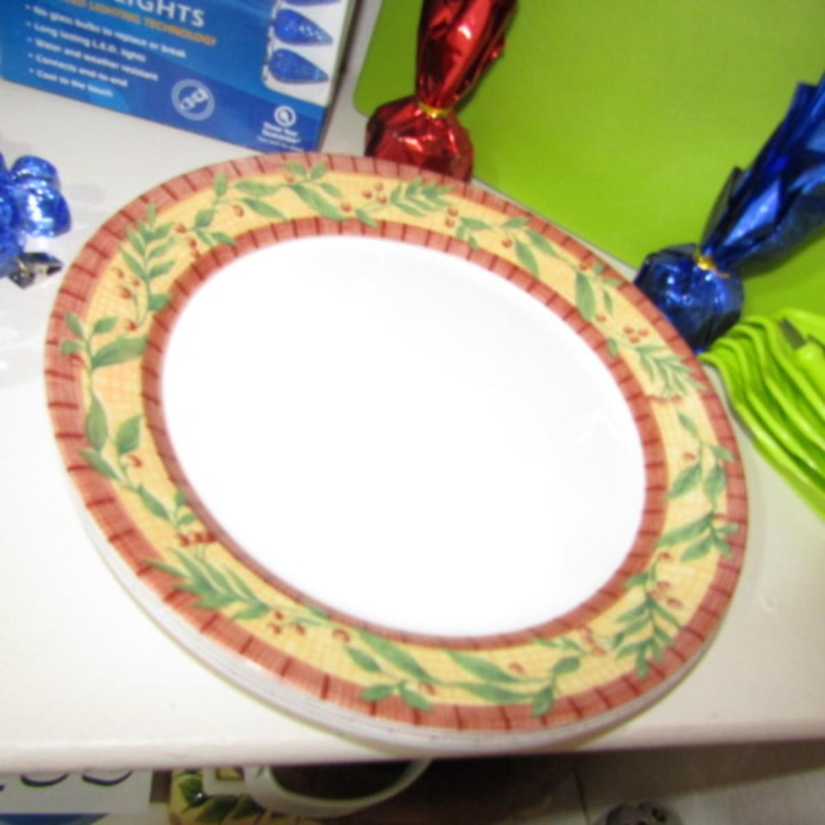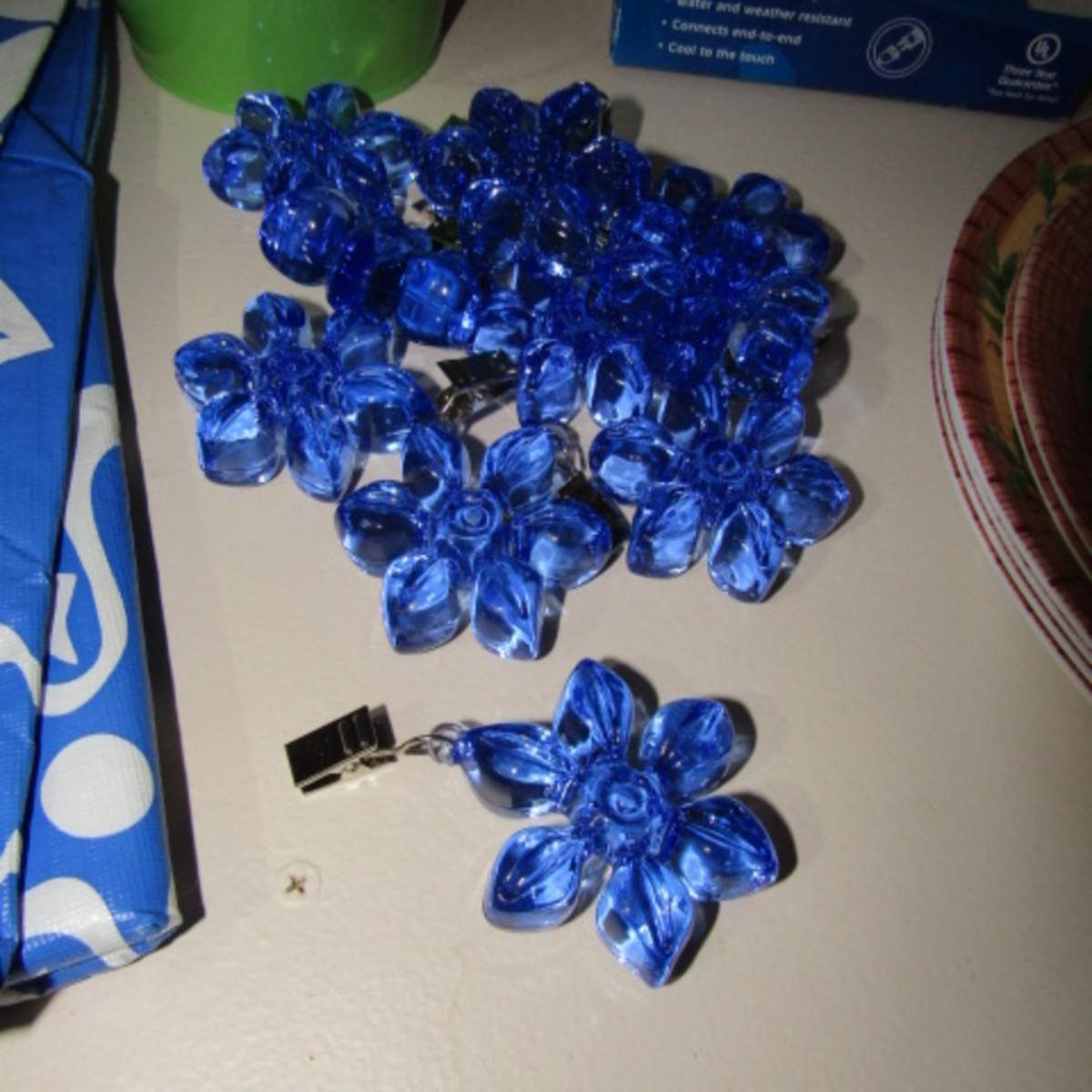 CORELLE PLATES, 2 VINYL TABLECLOTHS, BOX OF BLUE LIGHTS, CLIP-ON PLASTIC BLUE FLOWERS, GREEN CUTTING BOARD AND MORE