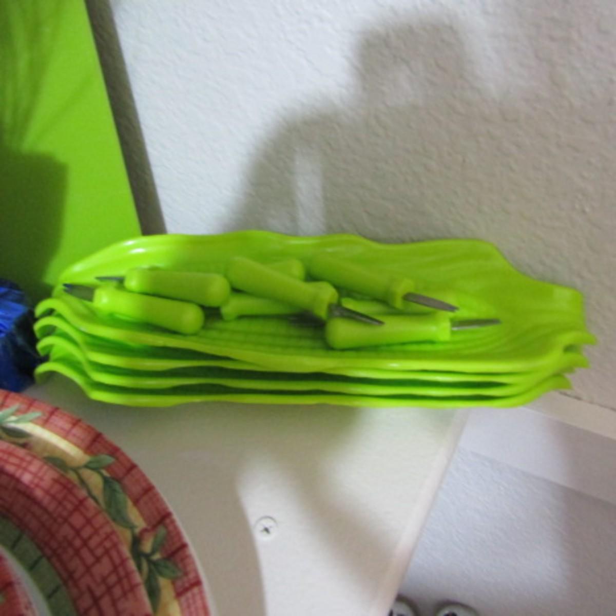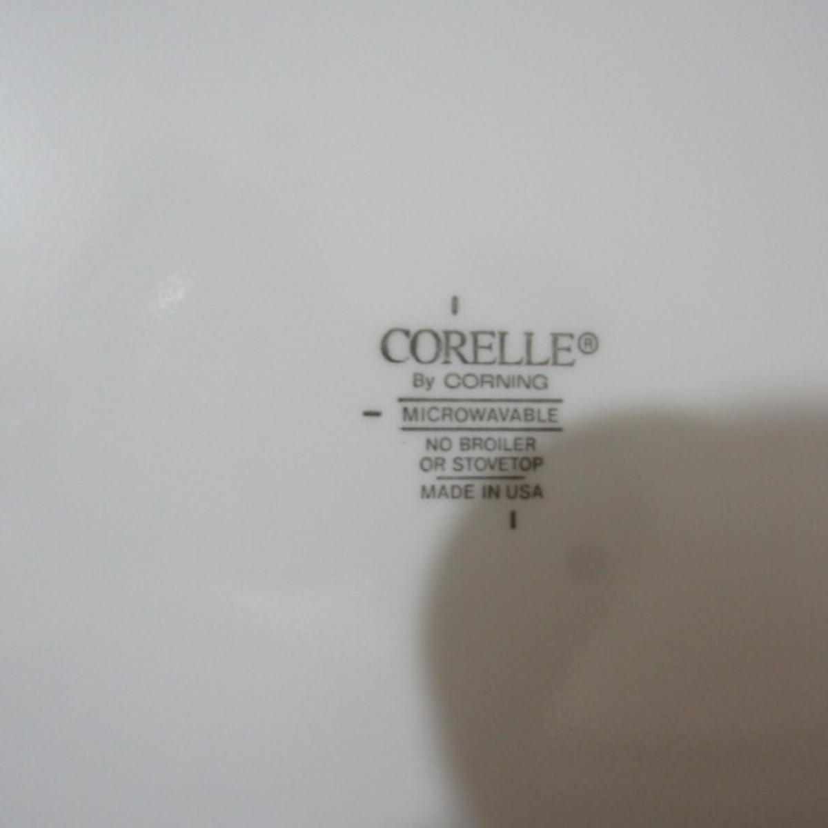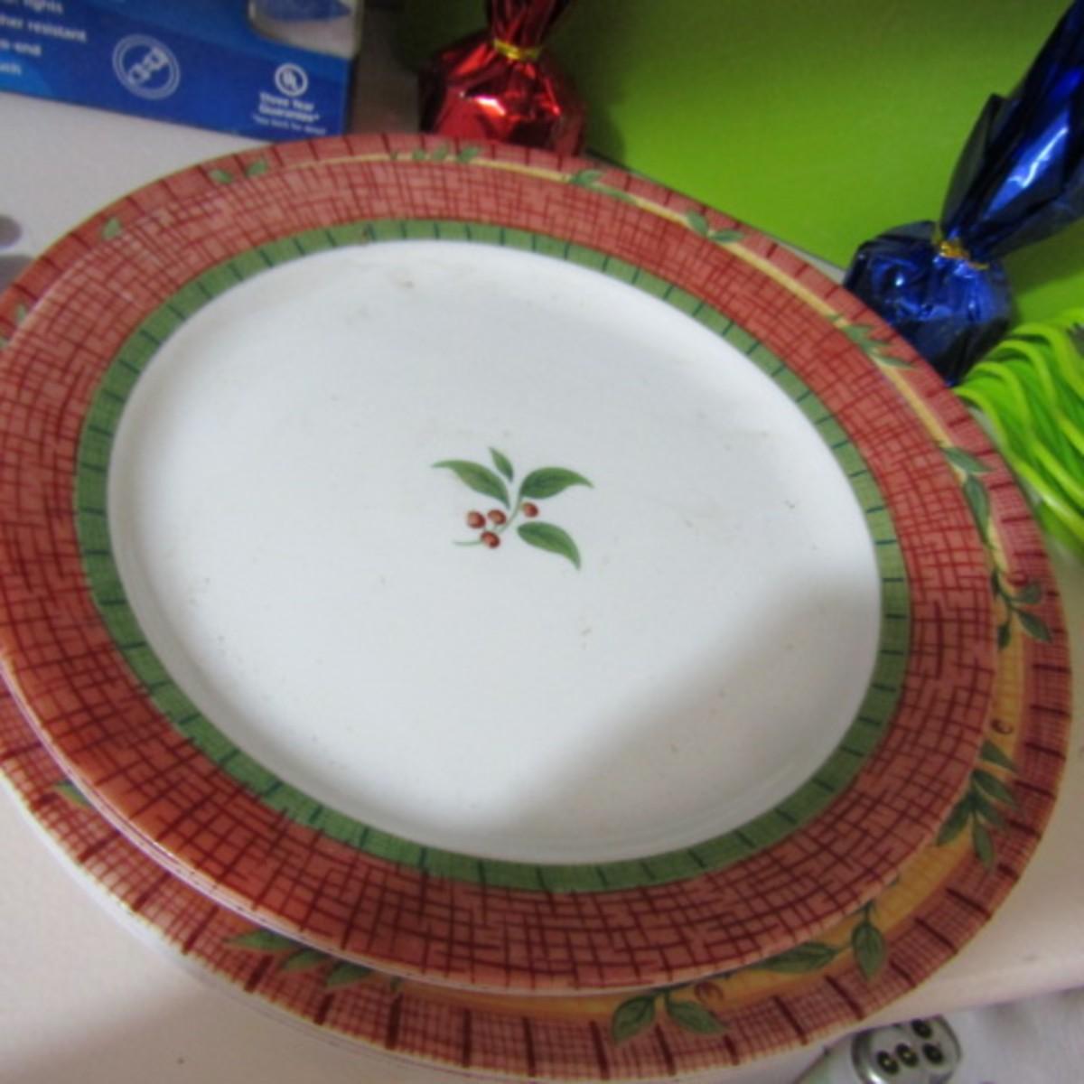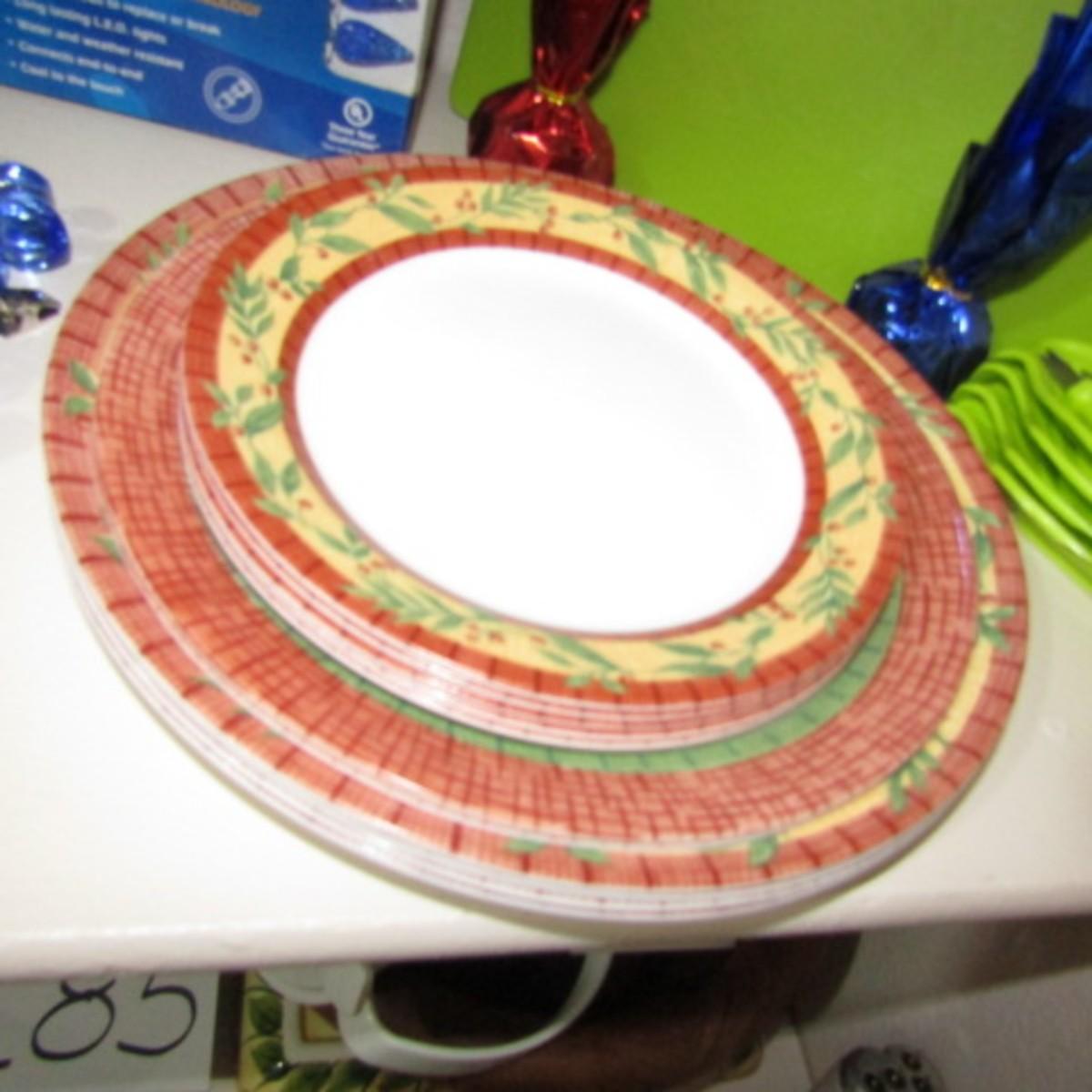 CORELLE PLATES, 2 VINYL TABLECLOTHS, BOX OF BLUE LIGHTS, CLIP-ON PLASTIC BLUE FLOWERS, GREEN CUTTING BOARD AND MORE