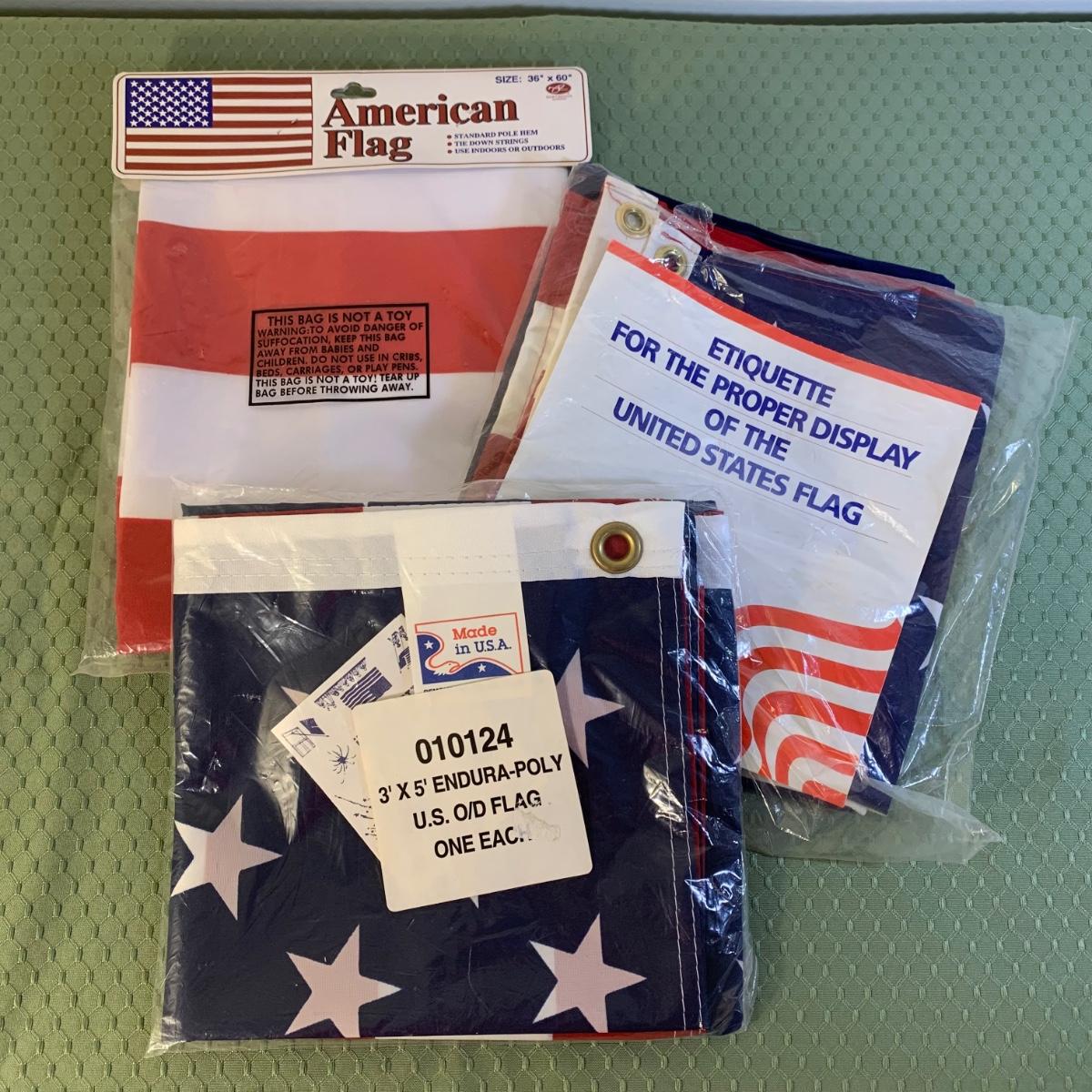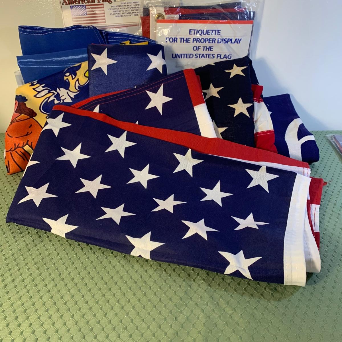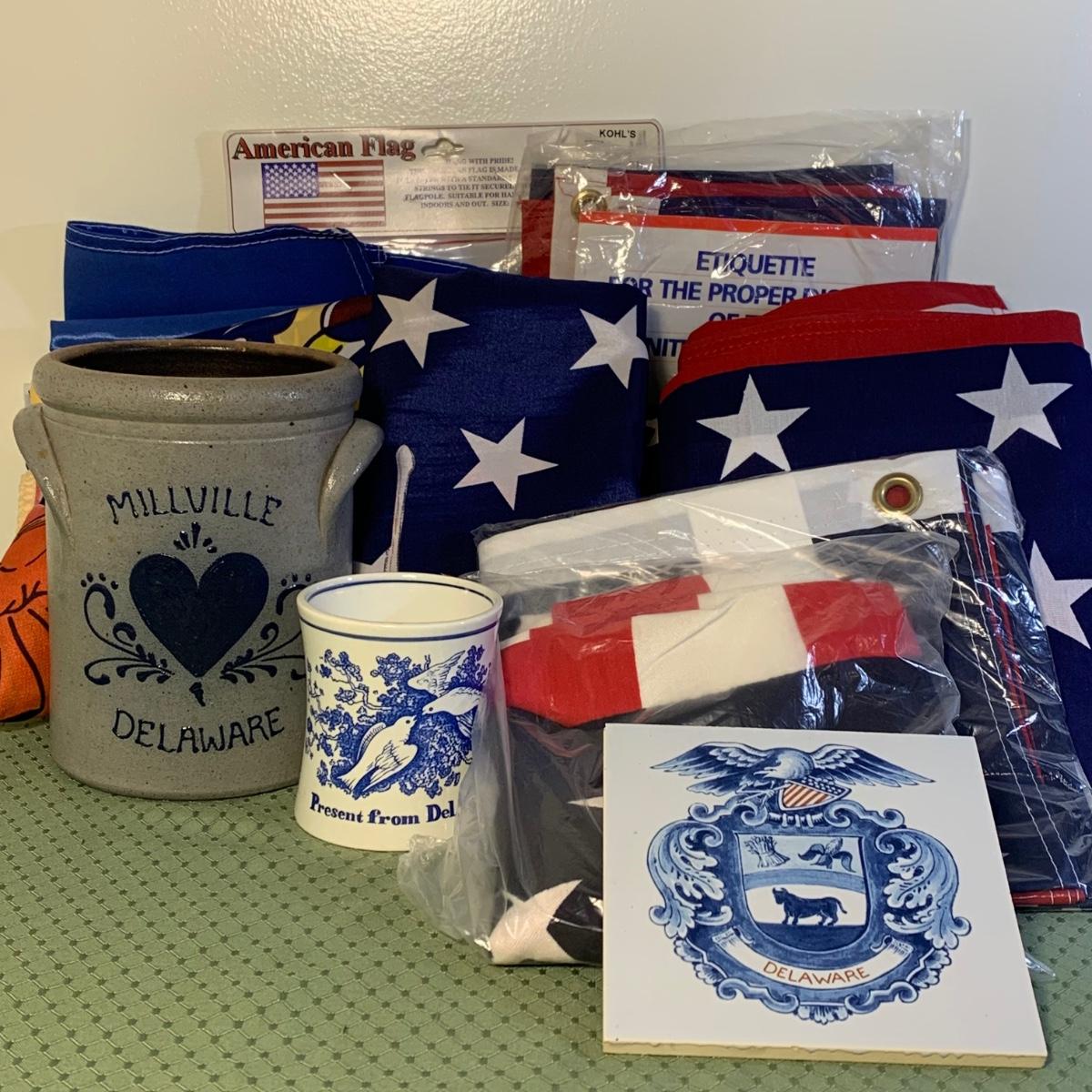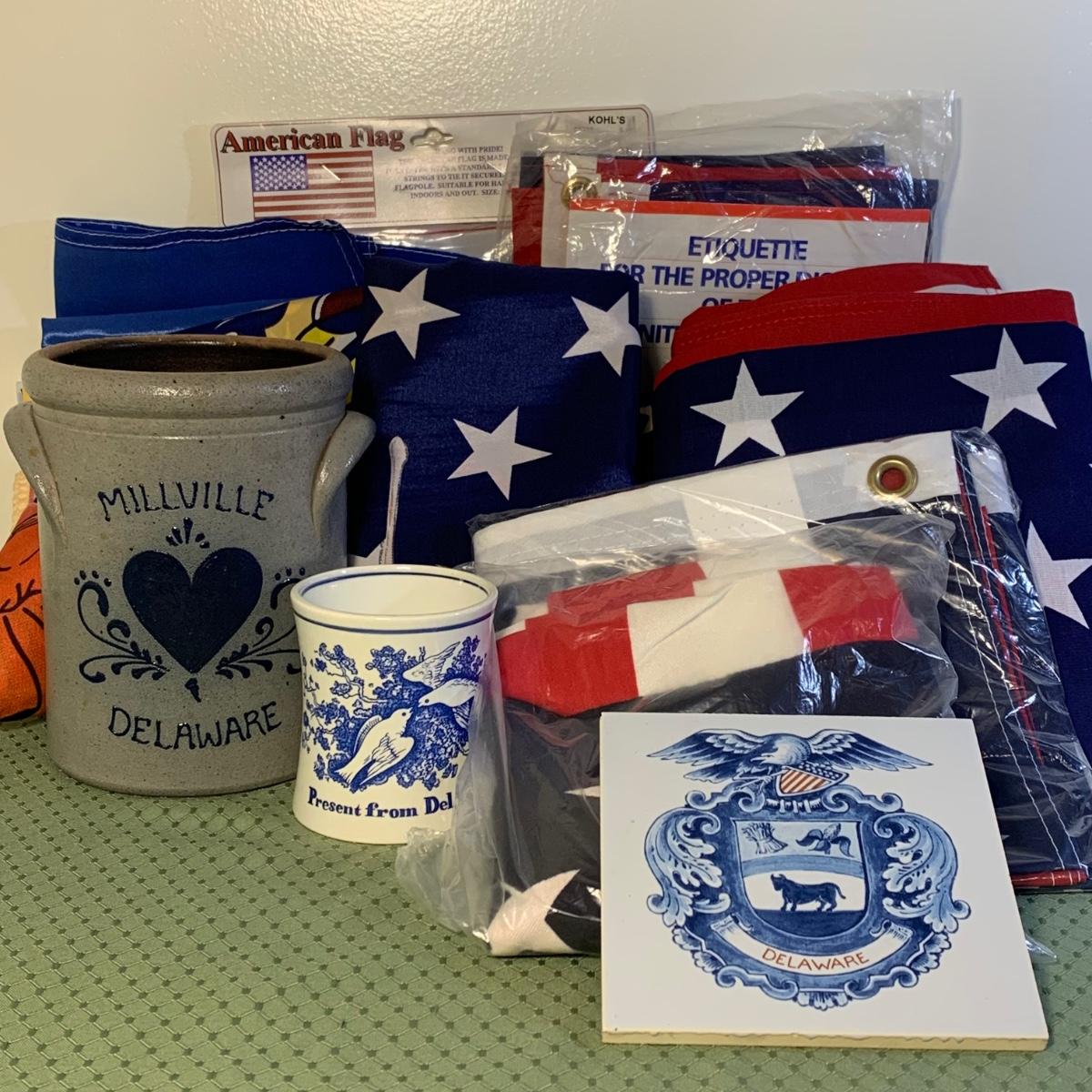 Lot 188: 4th of July Collection- Delaware Mug & Trivit. Stoneware Crock, Large Assortment of Flag Including DE & NJ State & Bethany Beach Flag & 11 US Flags