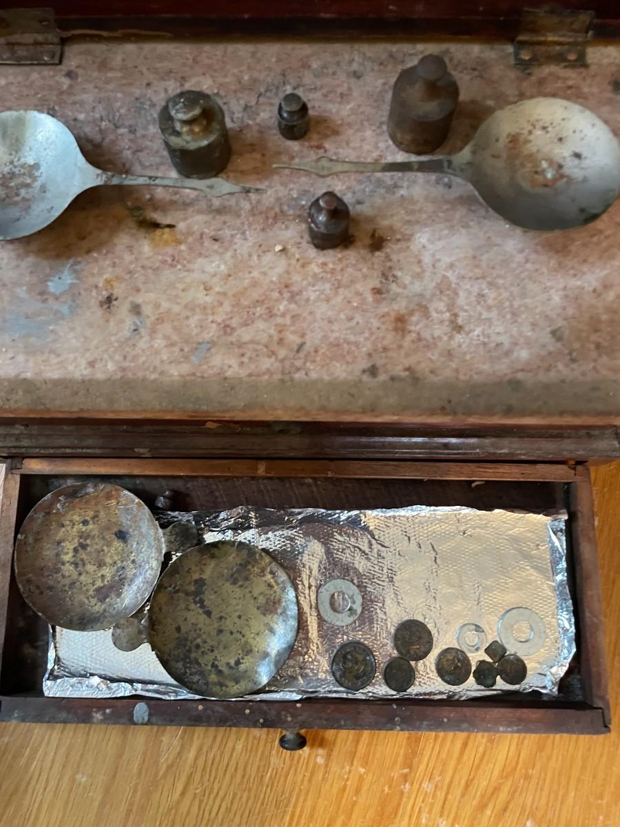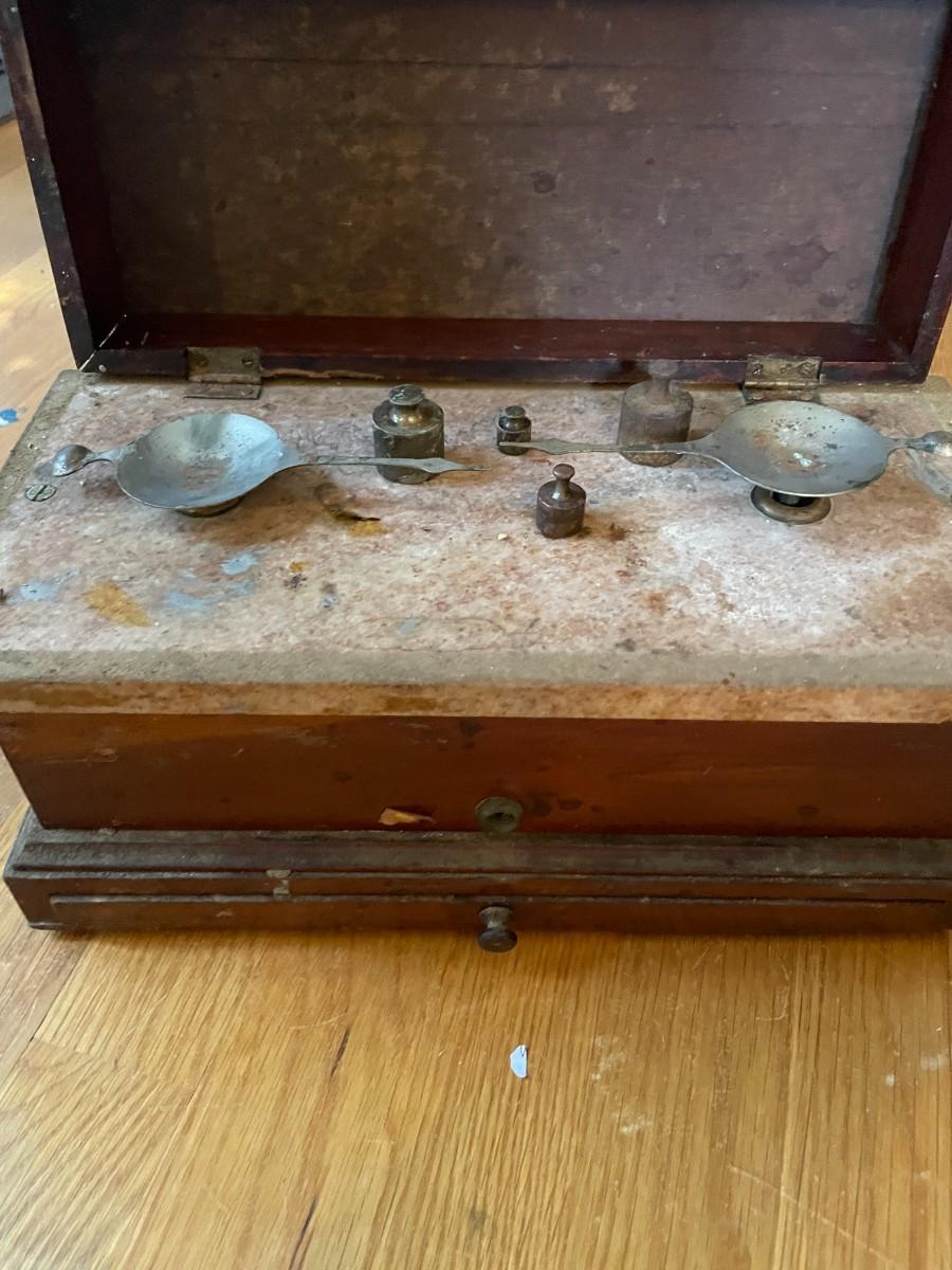 antique scale with additional weights.
