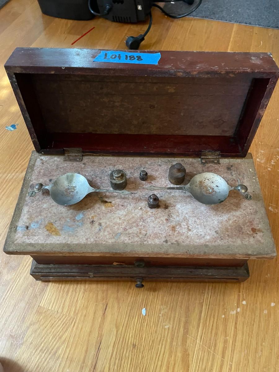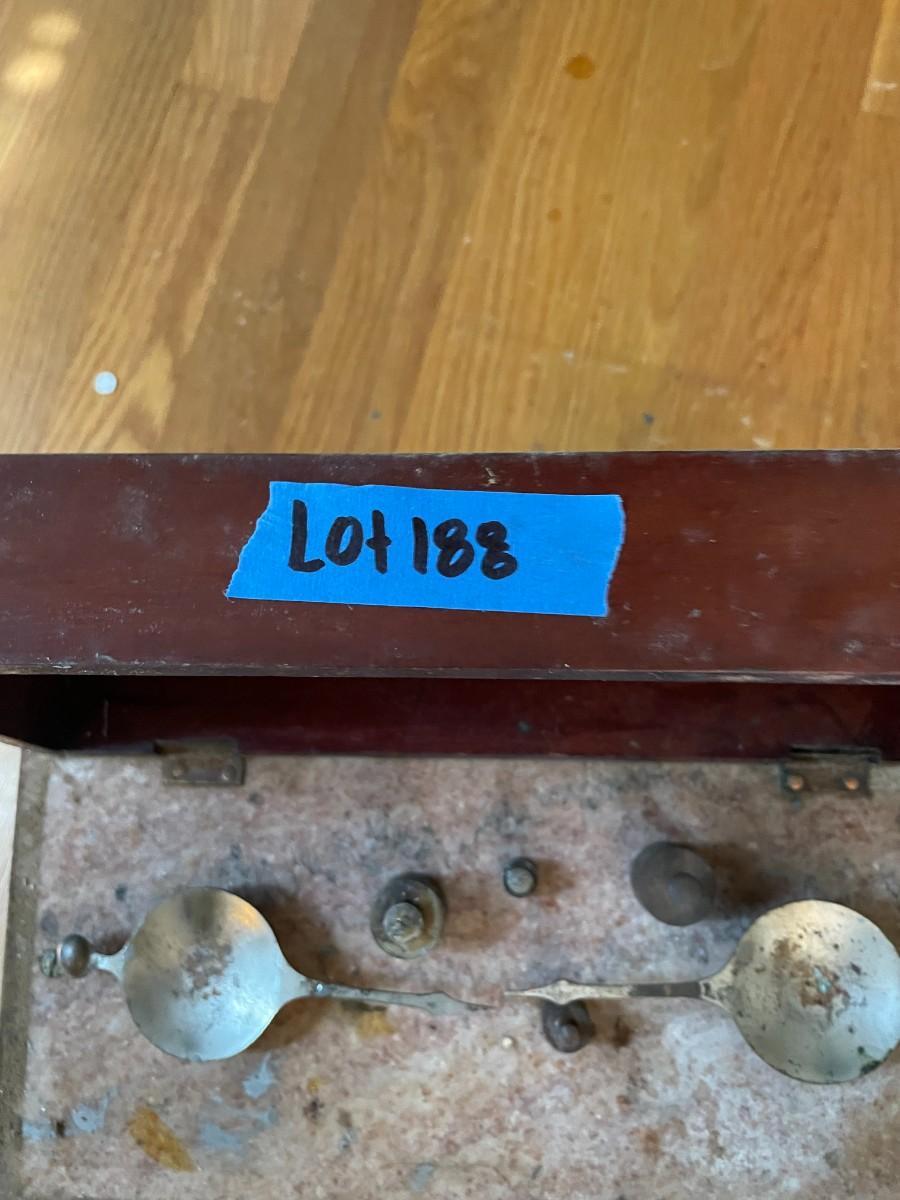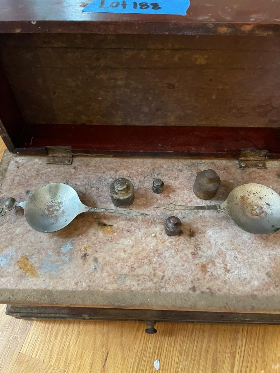 lot 188- antique scale with additional weights