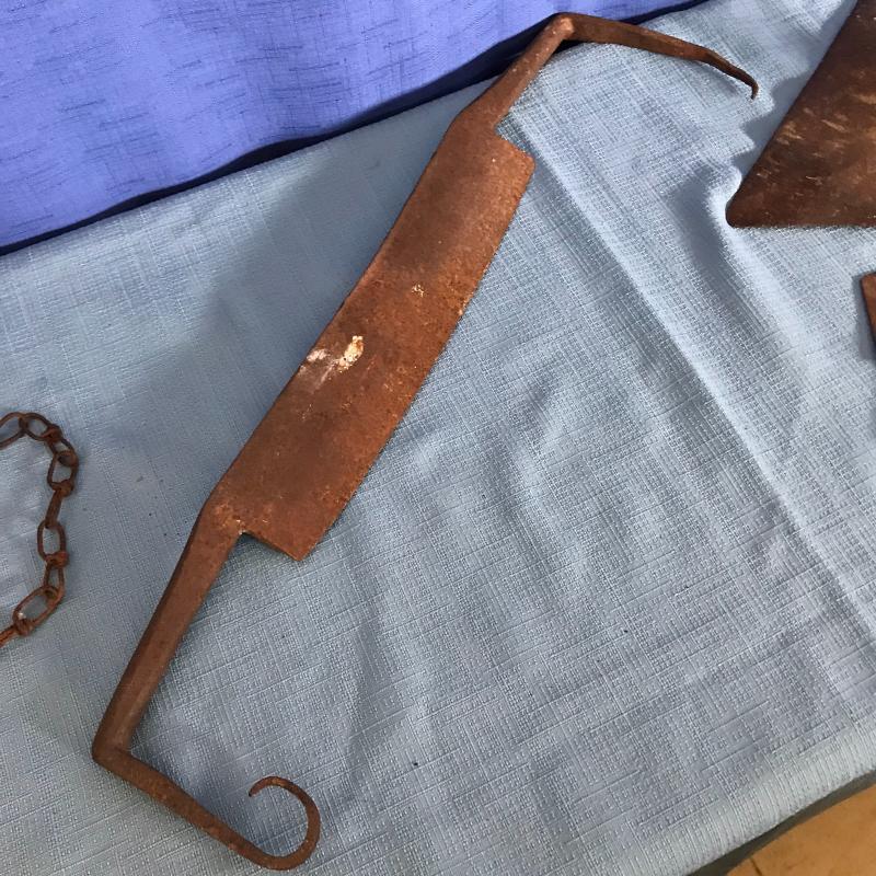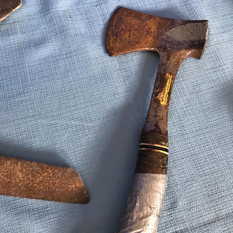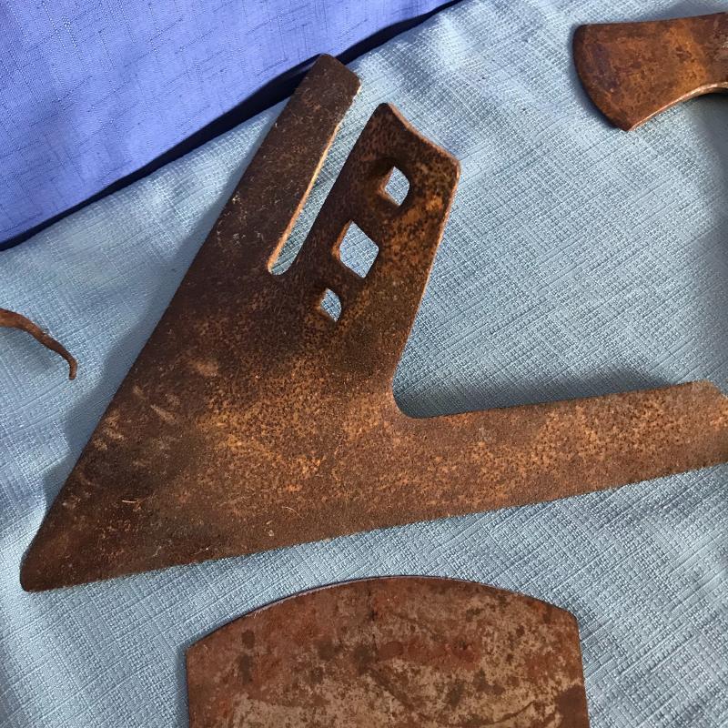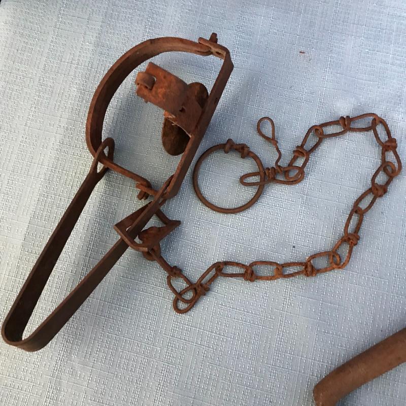Lot includes assorted tools: hand forged draw knife, hatchet, handsaw, animal trap, tiller blade, and meat chopper. See pics. No shipping available. Local pickup only in Maggie Valley, NC.