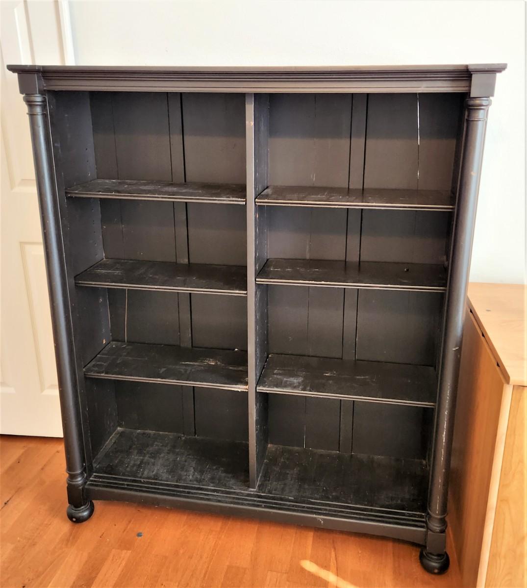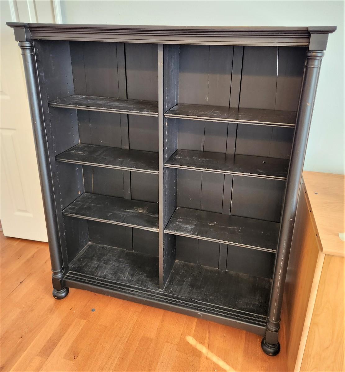 4 shelves on each side (3 are adjustable). Contemporary black bookcase - 2 panels split in the back but still serviceable. 47" across, 14" deep, 55.25" tall.