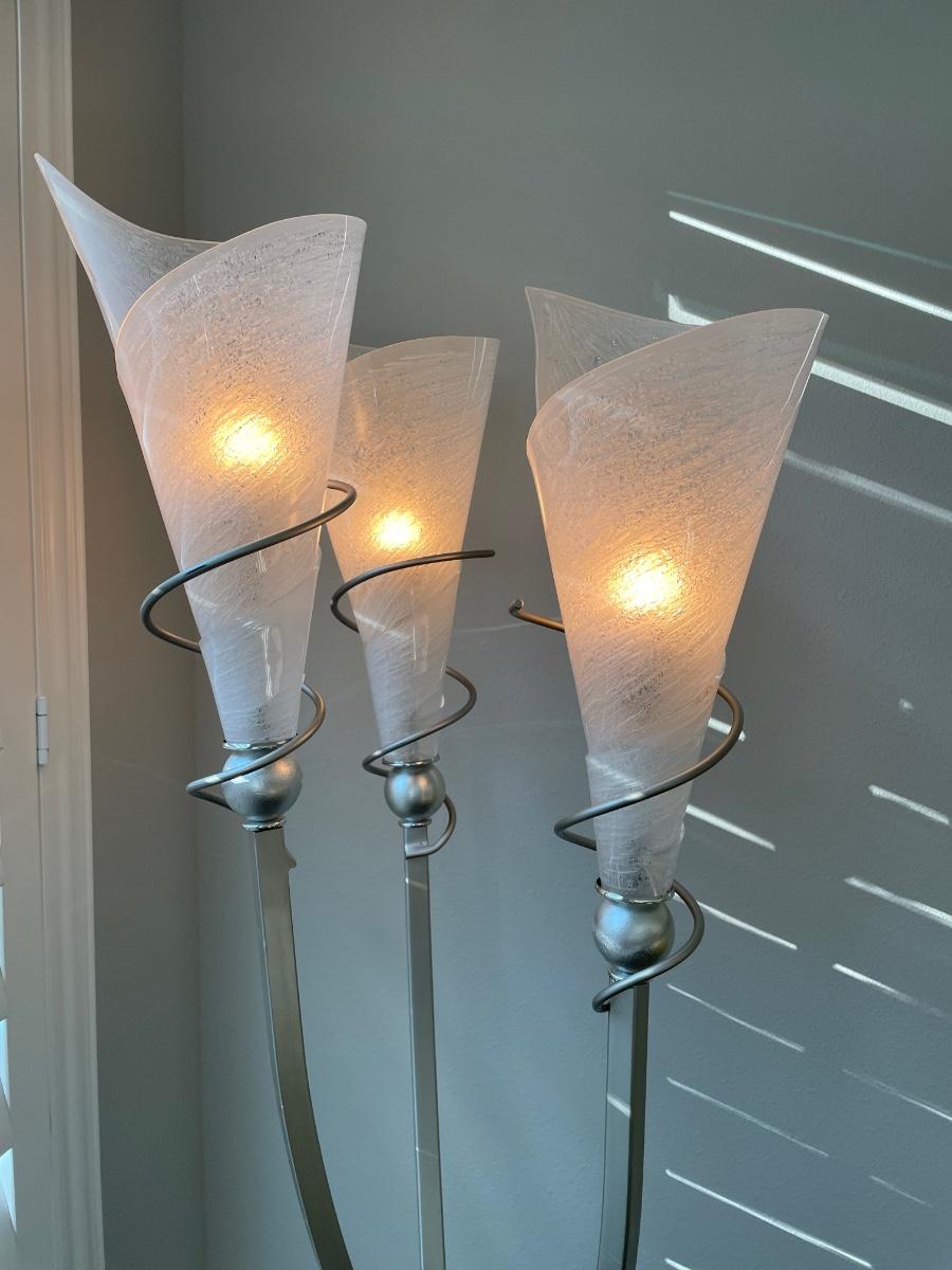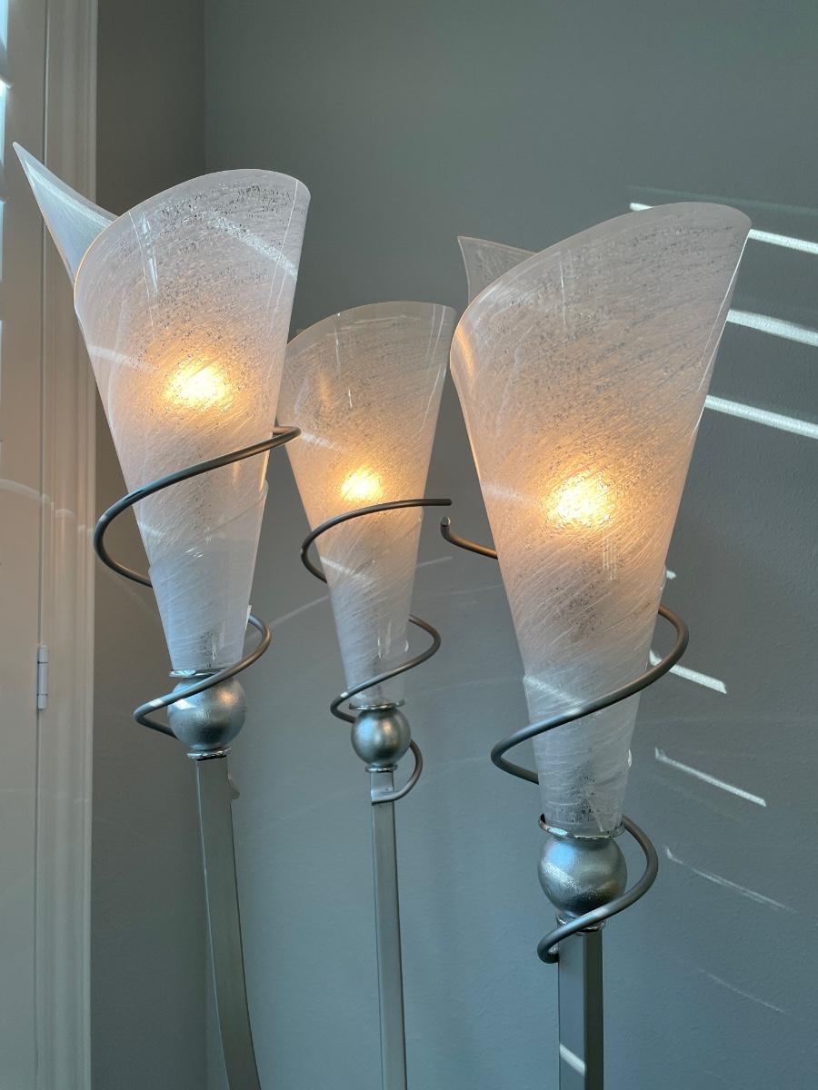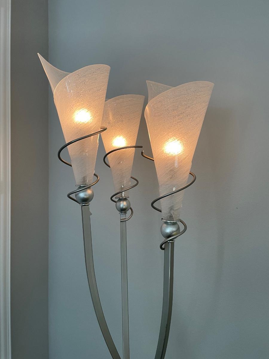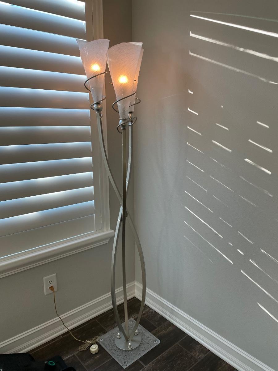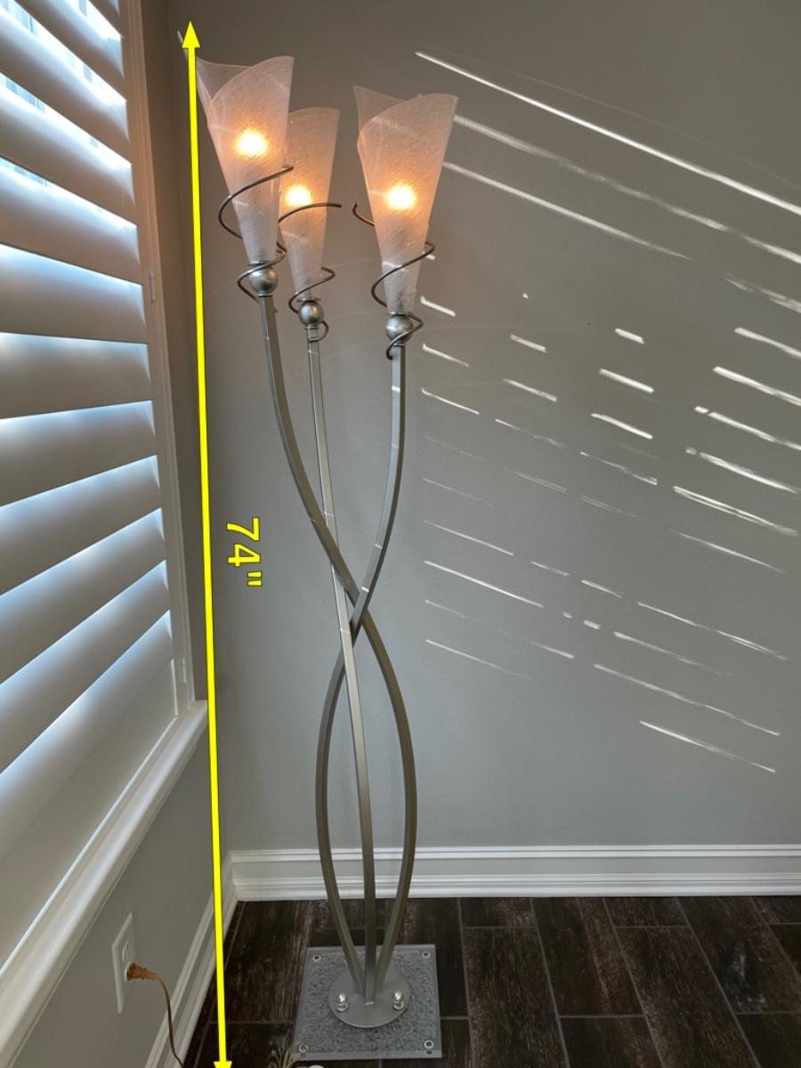 High quality and perfection. 74" tall. Sturdy base and foot switch. Shades are acrylic and the lamp is brushed metal