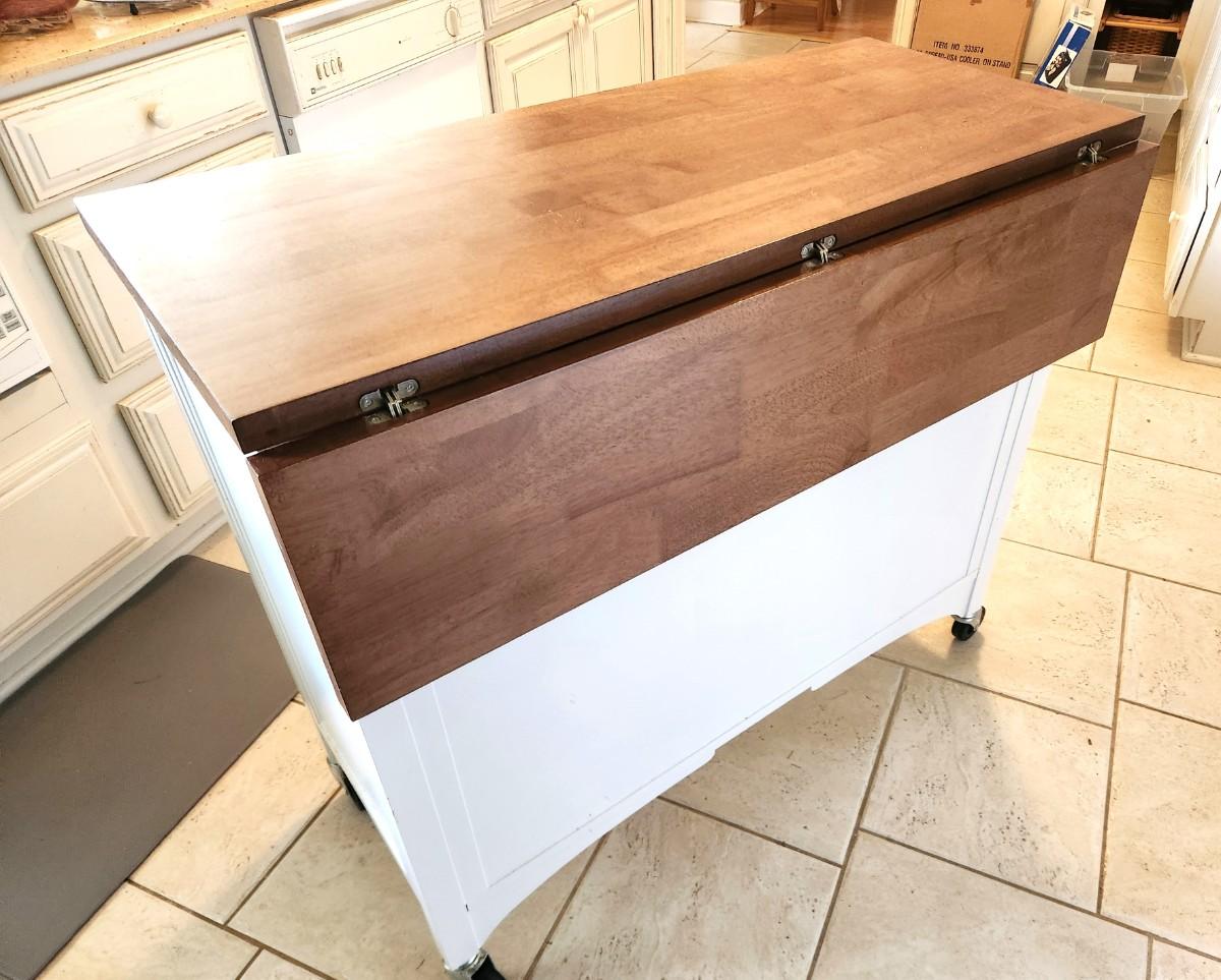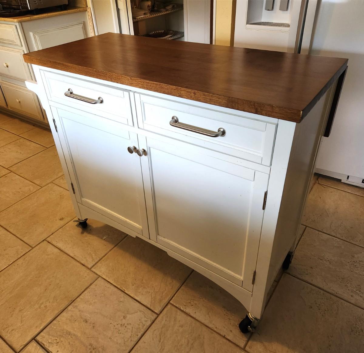 This will give you a lot of extra storage room in your kitchen - 44" long, 18" across (when leaf not extended), 36.5" tall. 2 drawers. Leaf extends to 22.5". Storage beneath. Rolls smoothly. 2-tone design.