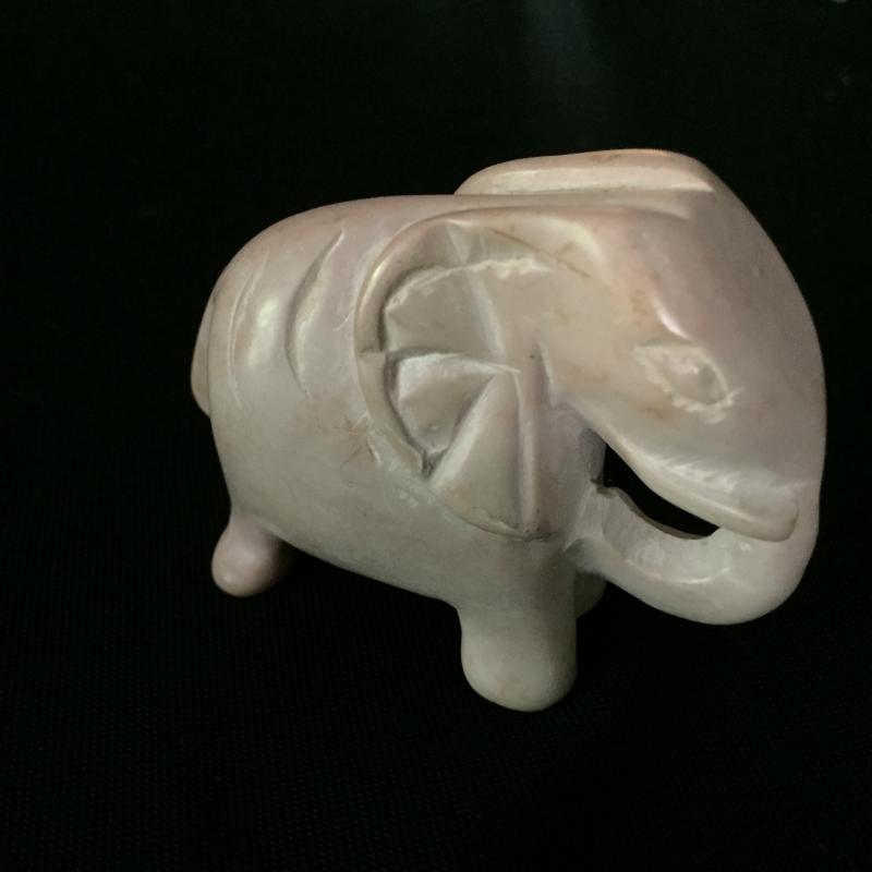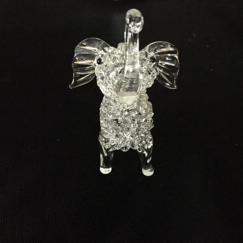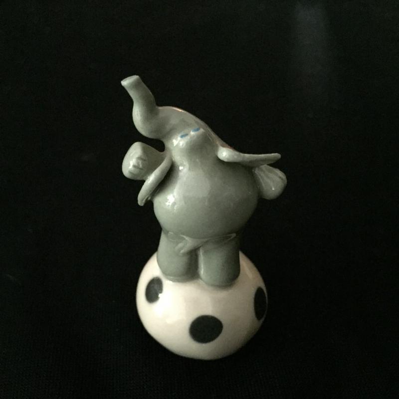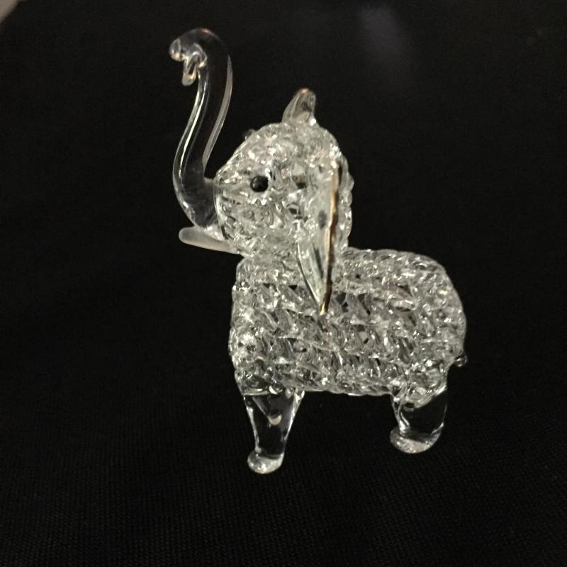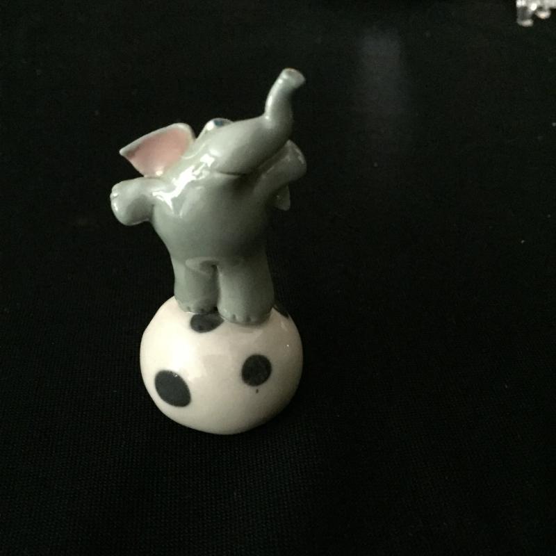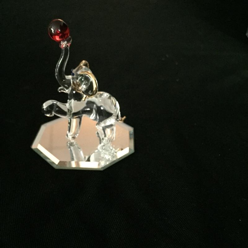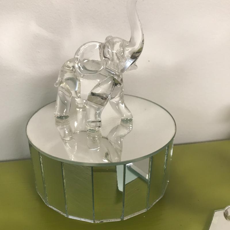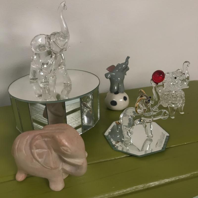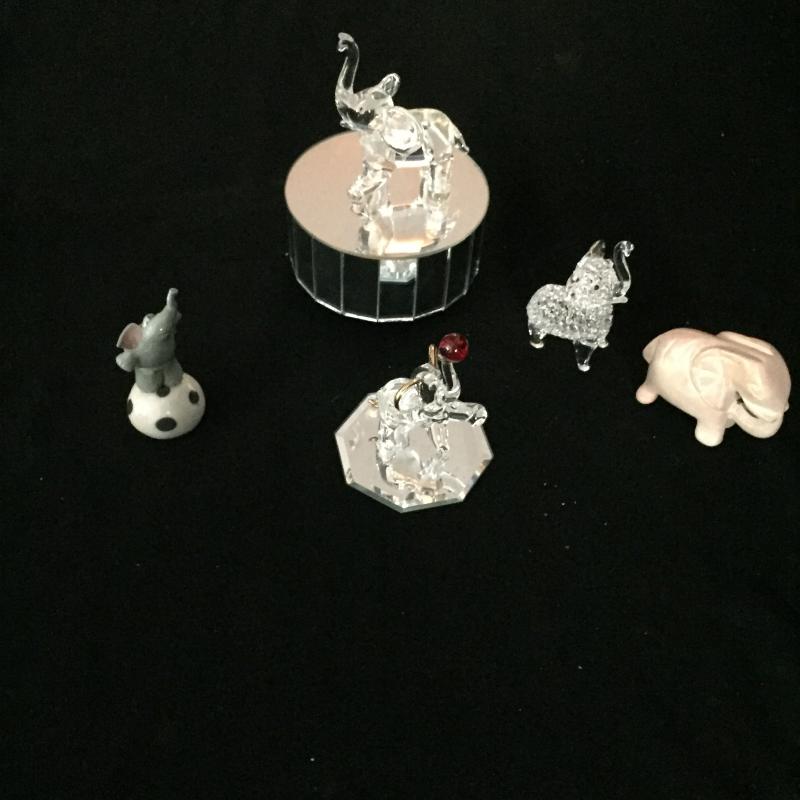 Collection of Elephants in different materials. The Elephant on mirrored pedestal is a music box.