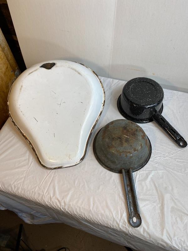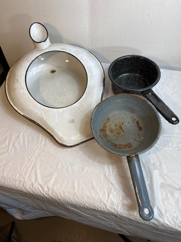 Lot 188 Enamel Ware Lot Bed pan Sauce pans