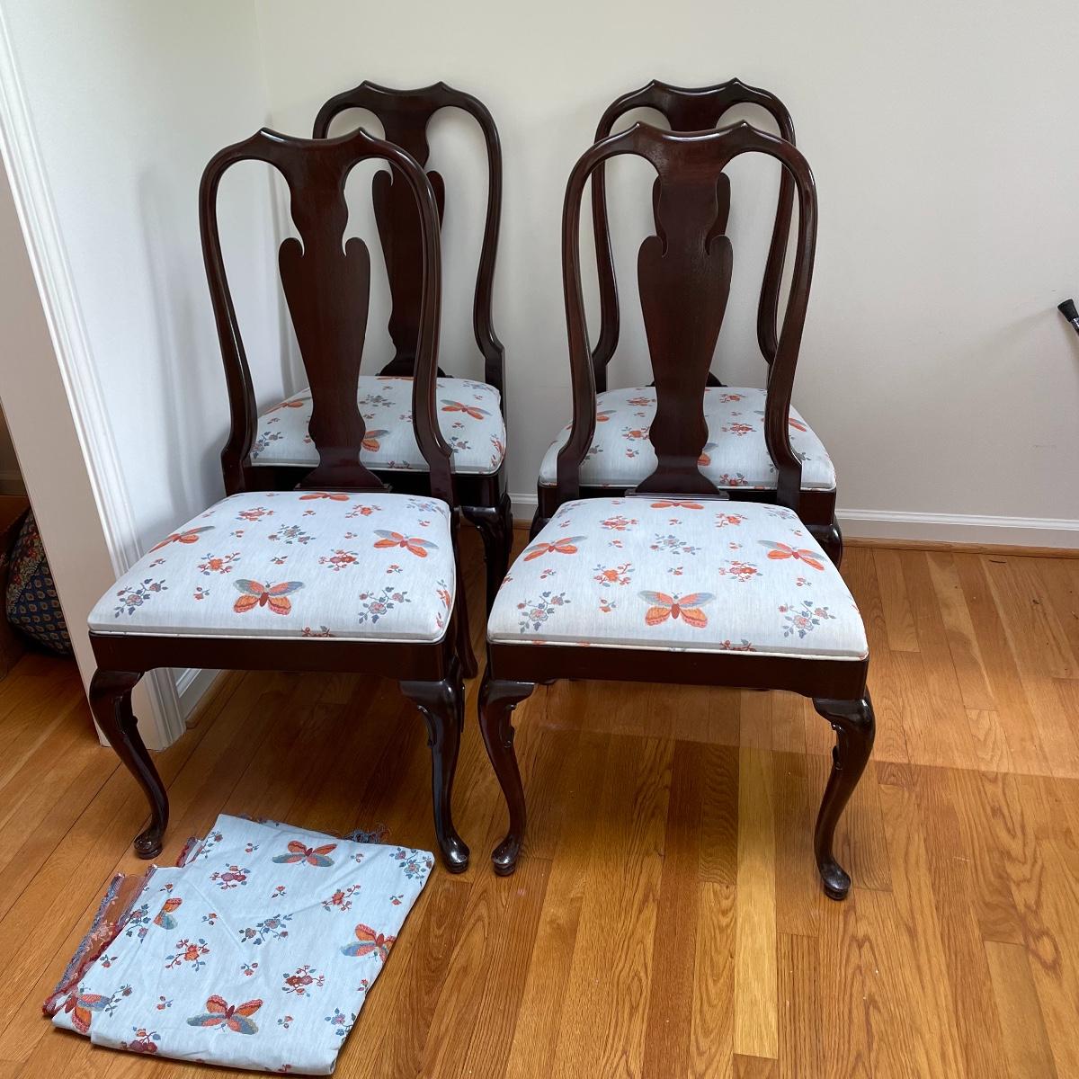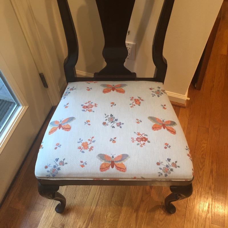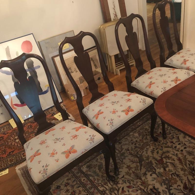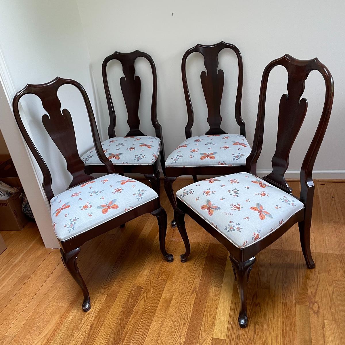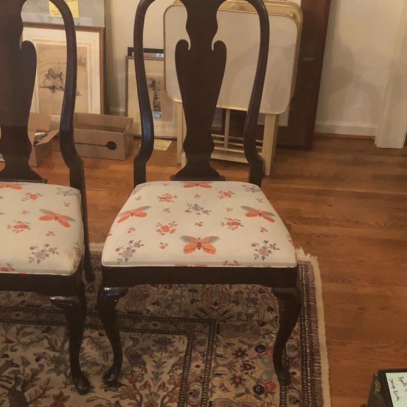 These 4 matching dining chairs have some of the prettiest upholstered seats we have come across! The wood is a dark mahogany color with elegant carved details and with cabriole style legs. The fabric is a grey silk with orange and grey butterflies and flowers that are simply gorgeous. These chairs go very well with the dining table in lot 182.