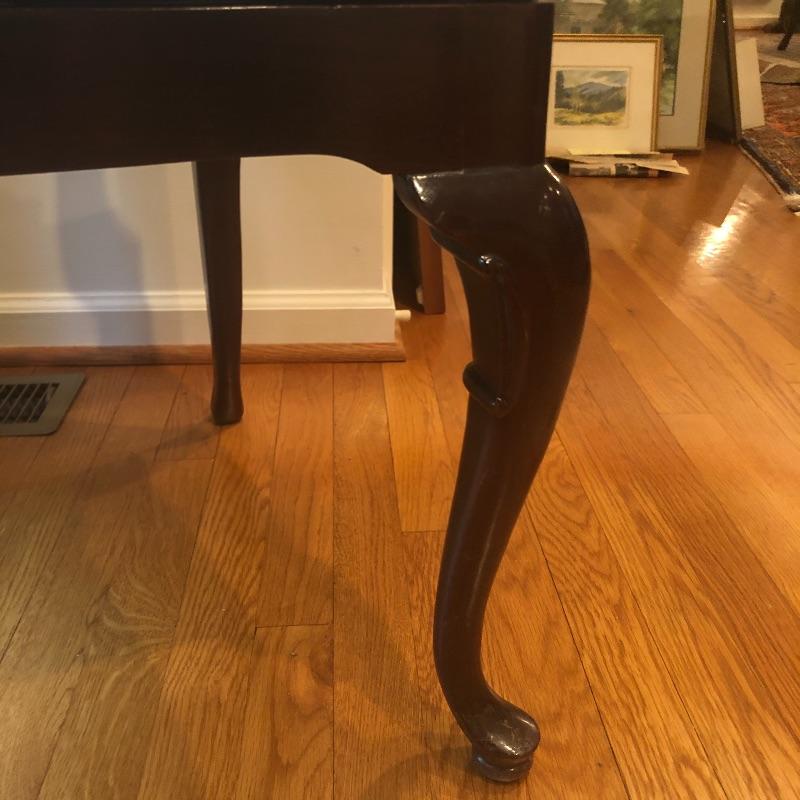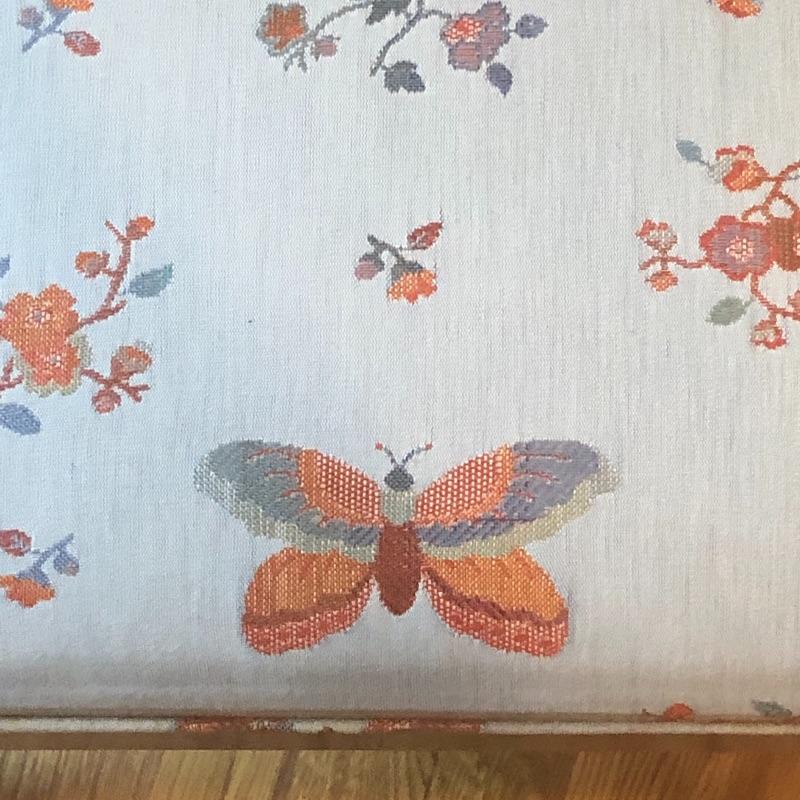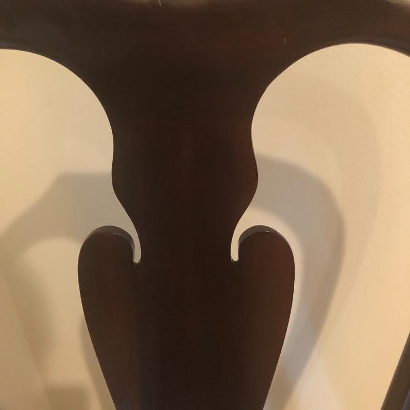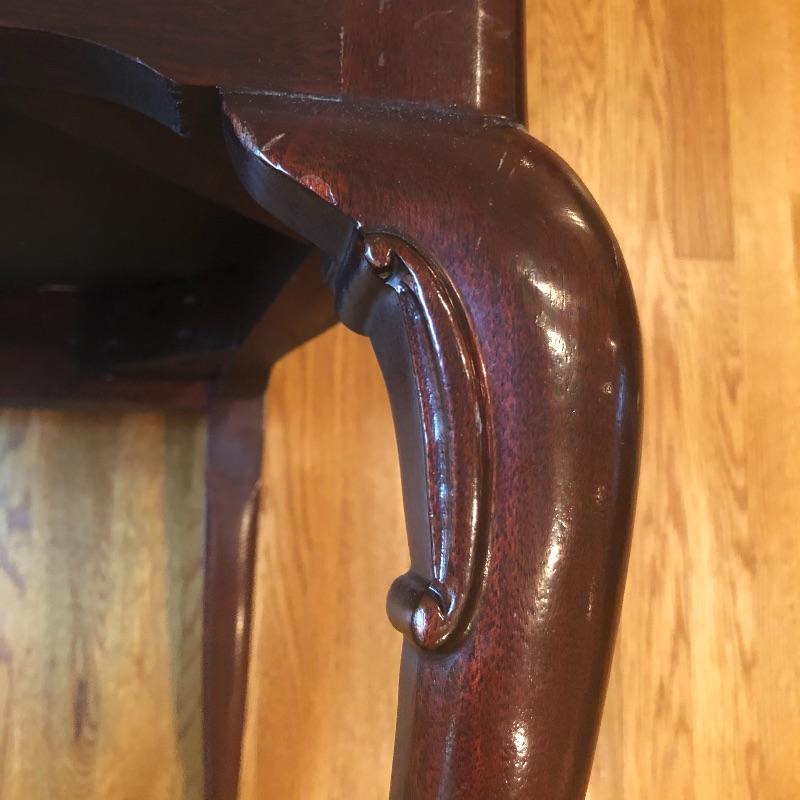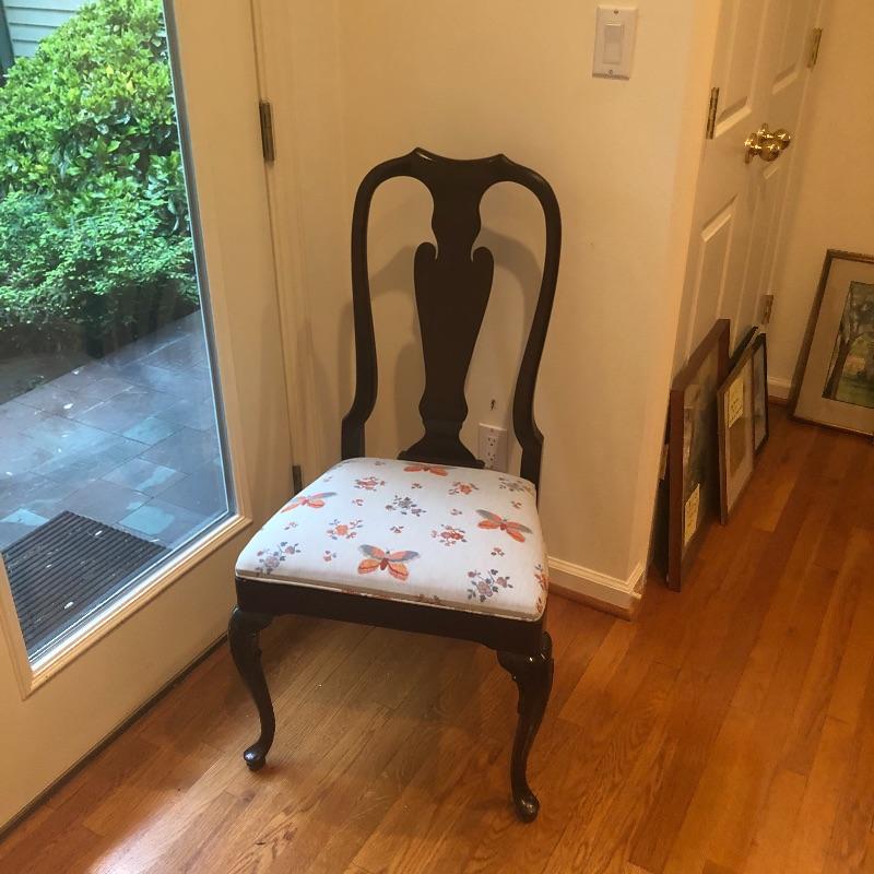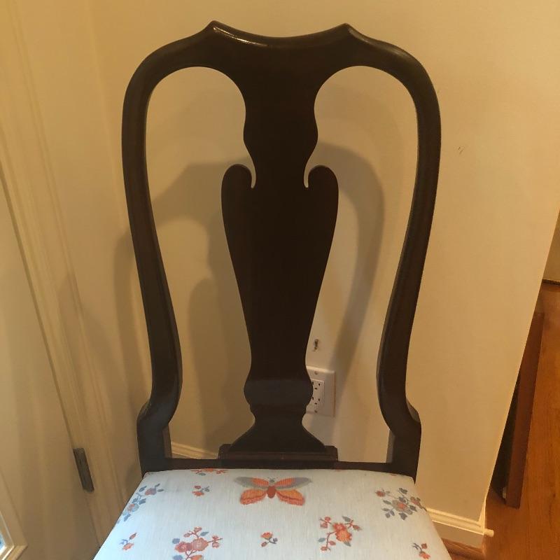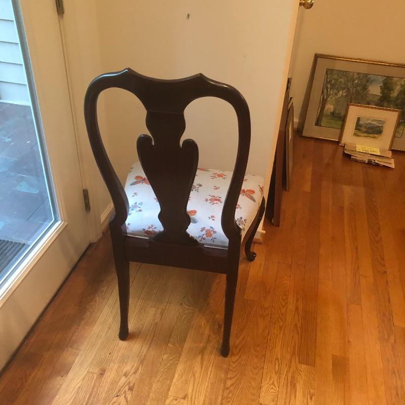 These 4 matching dining chairs have some of the prettiest upholstered seats we have come across! The wood is a dark mahogany color with elegant carved details and with cabriole style legs. The fabric is a grey silk with orange and grey butterflies and flowers that are simply gorgeous. These chairs go very well with the dining table in lot 182.