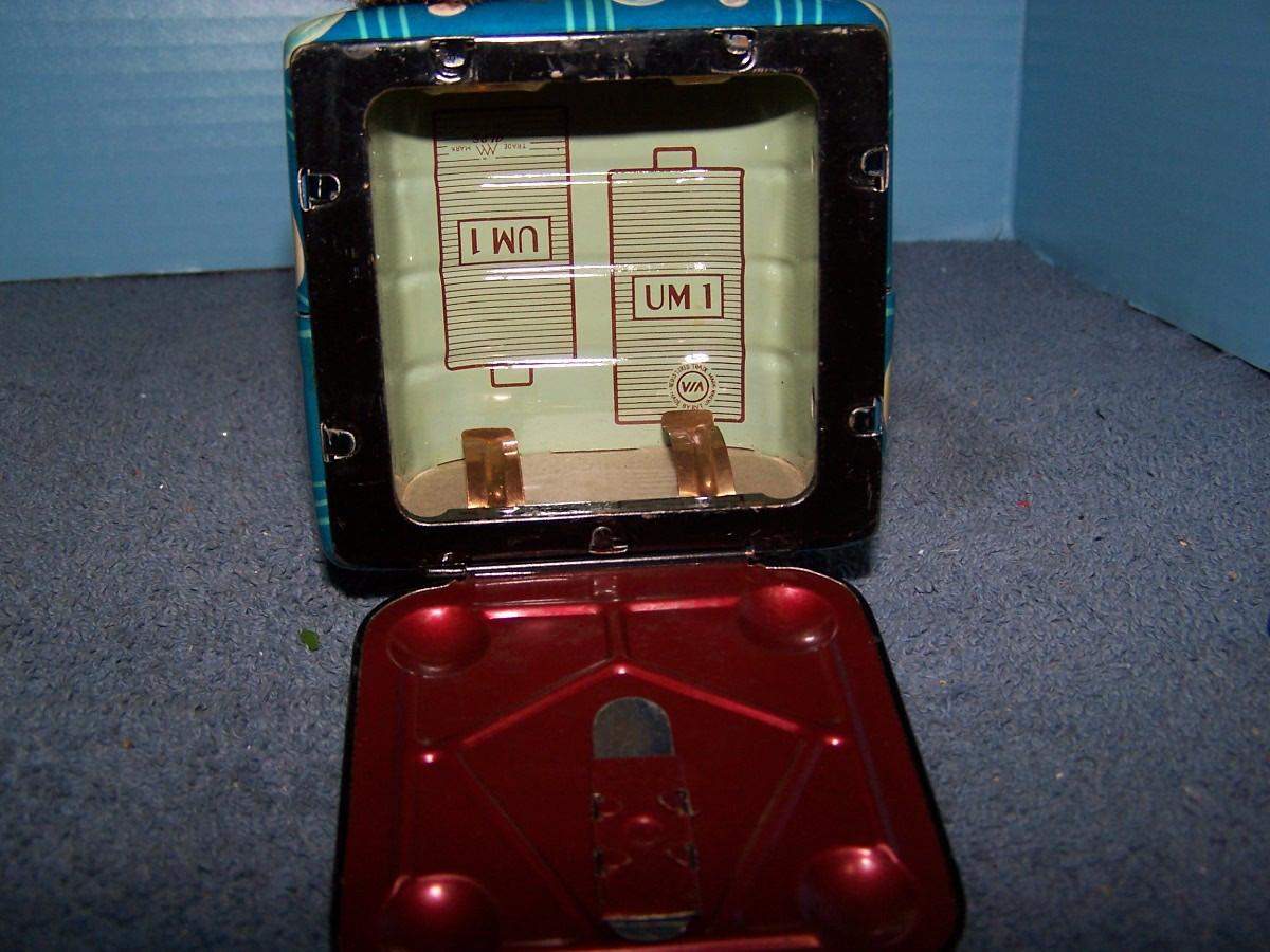 THIS IS A GREAT VINTAGE TIN LITHO BATTERY OP TOY!!! MARKED.. 10 1/2'' TALL.. LIGHTS UP.. OLD BATTERIES, HARD TO TELL HOW IT RUNS.. ALL TOYS HAVE BEEN PLAYED WITH..
