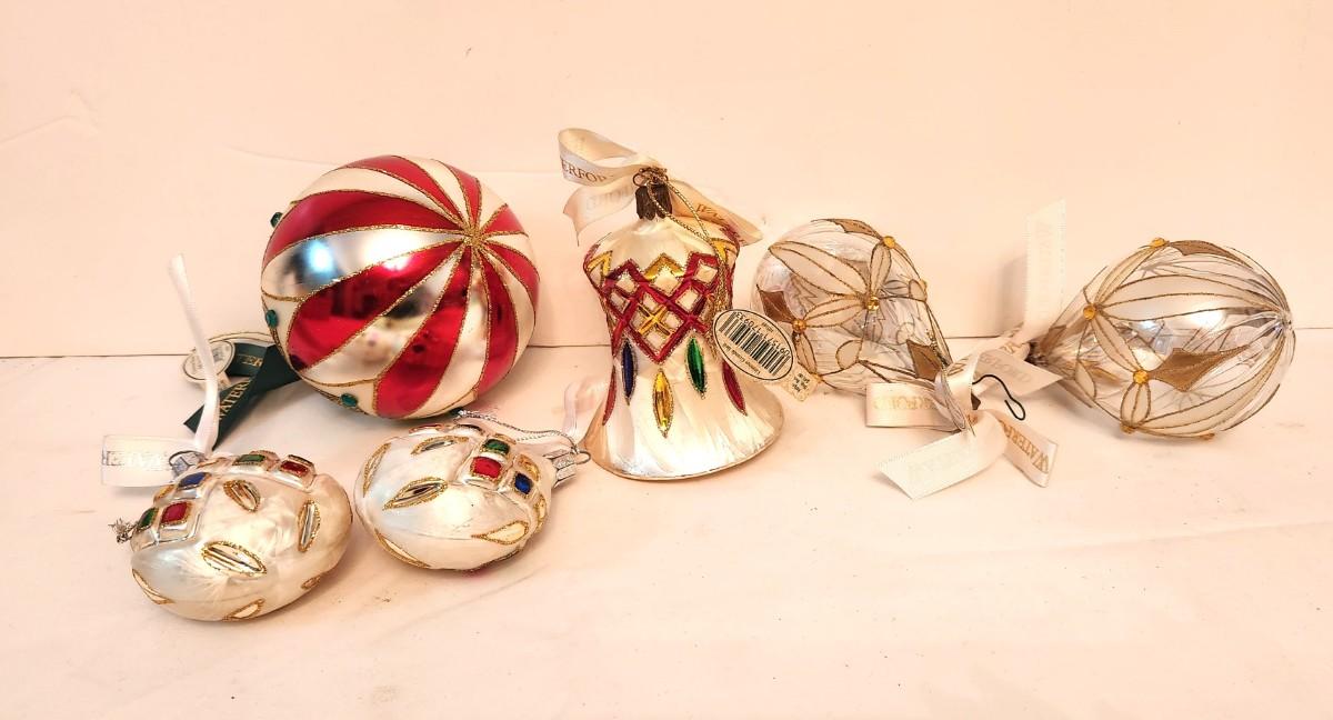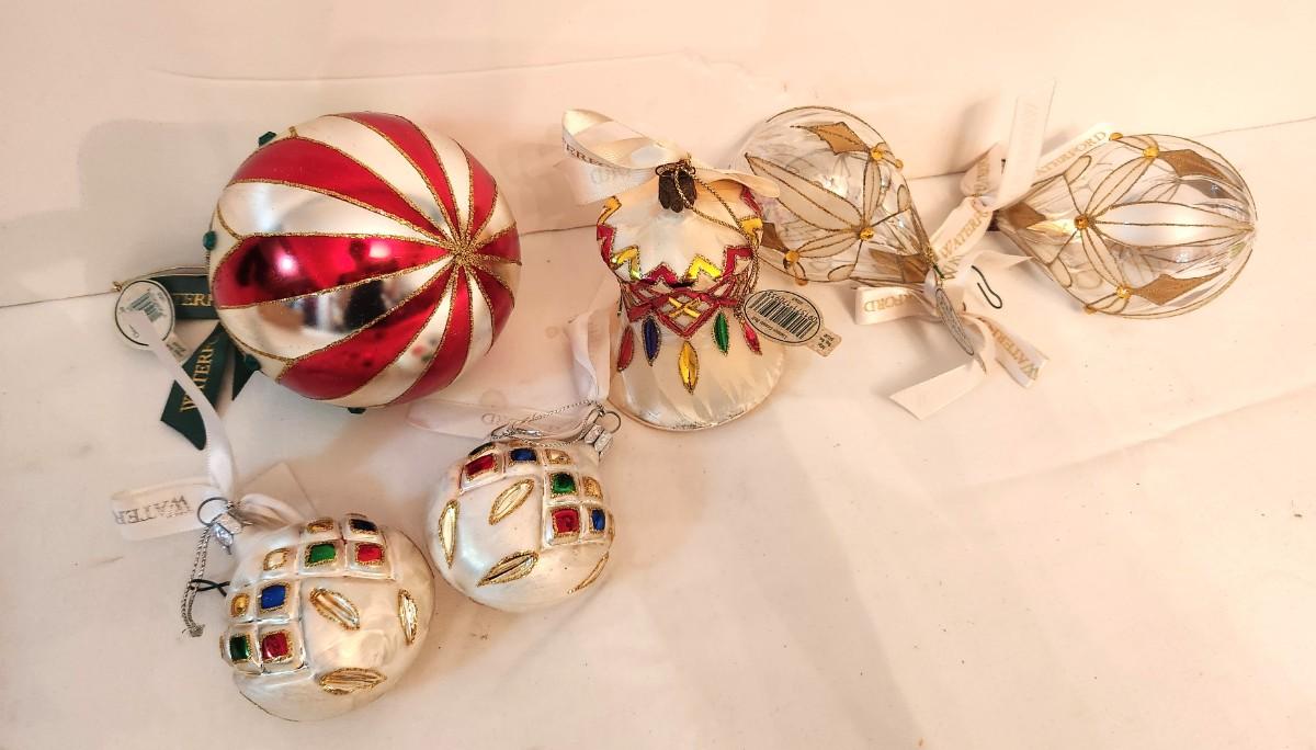 Attic find! No boxes, but these six WATERFORD brand Christmas ornaments are all in good condition.