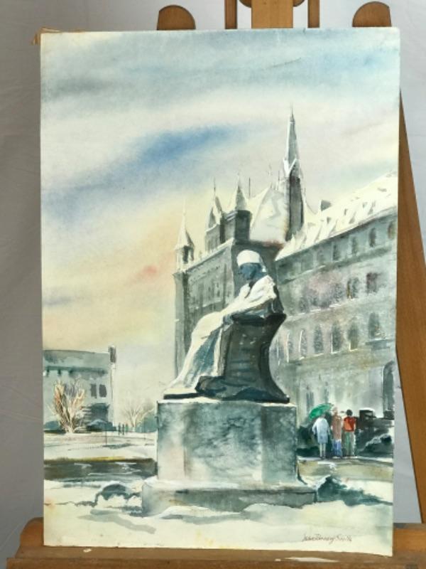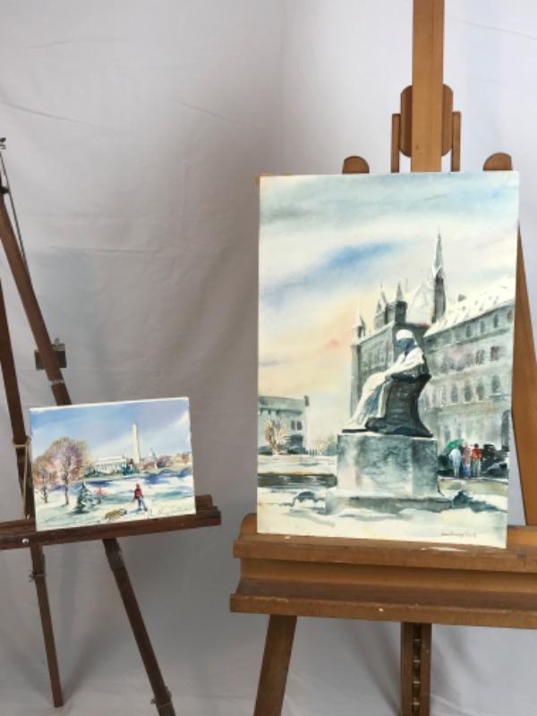 Pair of Jean Ranney Smith signed original watercolor paintings. “Statue” measures 22”x15” and “National Mall in Winter” measures 9”x7-1/2”