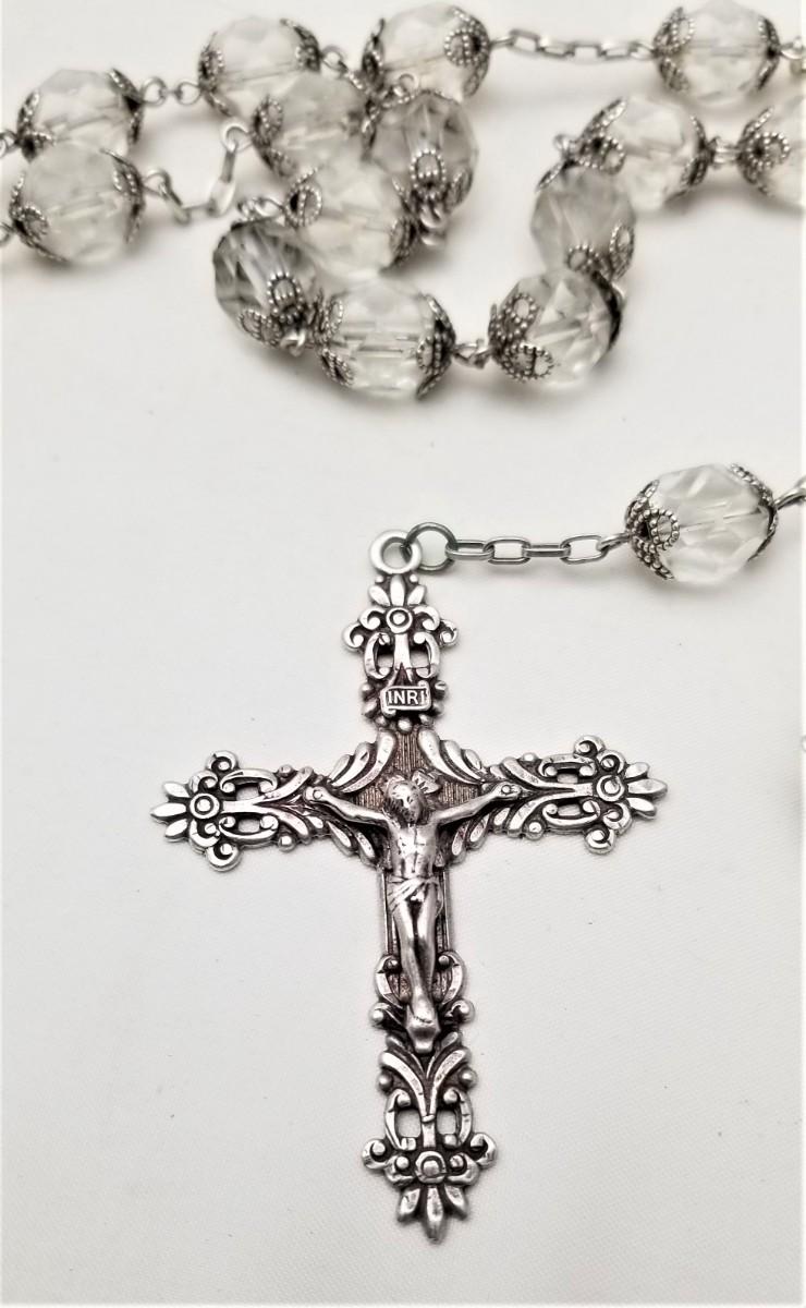 This is a real beauty...vintage sterling silver and crystal aurora borealis rosary - lovely crucifix - large, heavy faceted crystal beads, double capped with sterling caps. When laid out, it's 31.5" long. Great condition - no issues. Back of crucifix could be engraved.