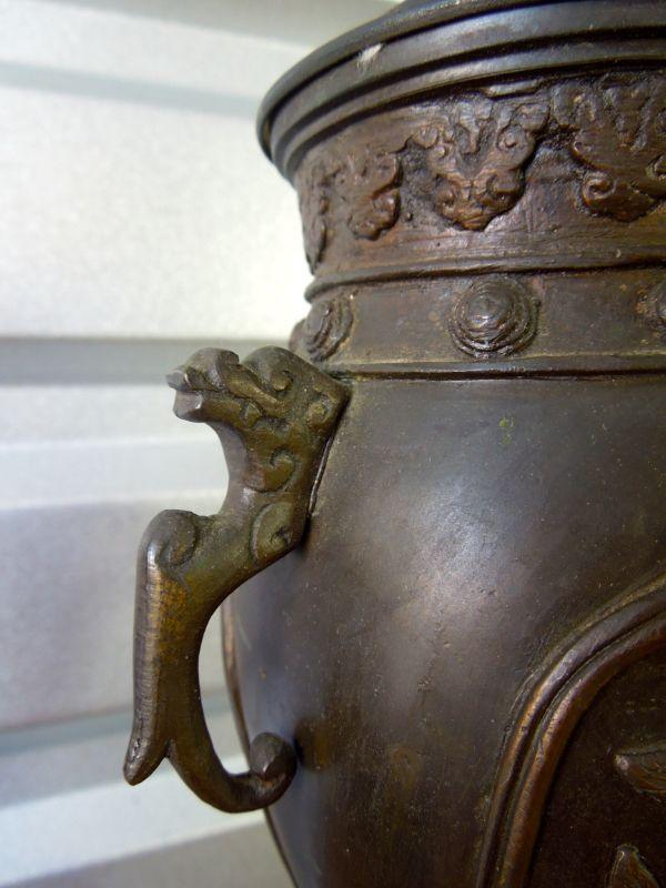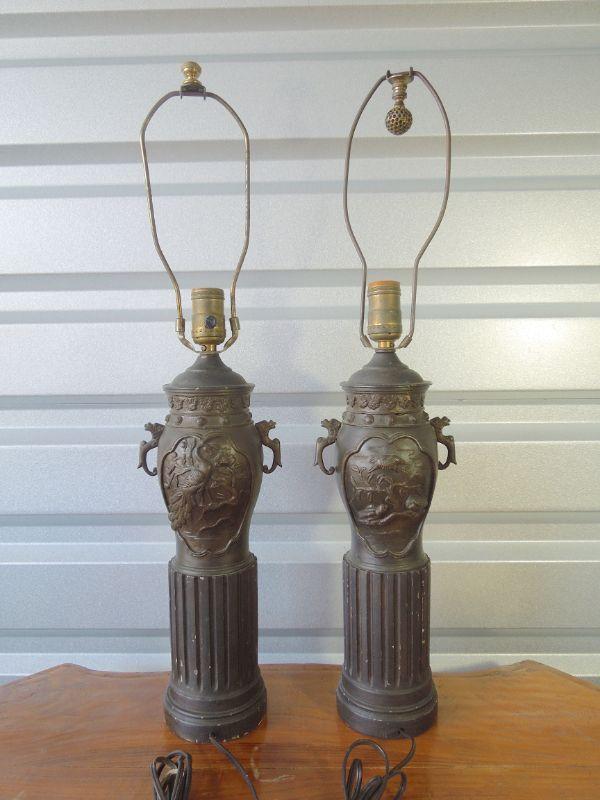 Brass urns with four different scenes depicted on panels. Amphora urns are sitting on stucco pedestals.. Finials and cords do not match. No dents or cracks noted. Nice patina.