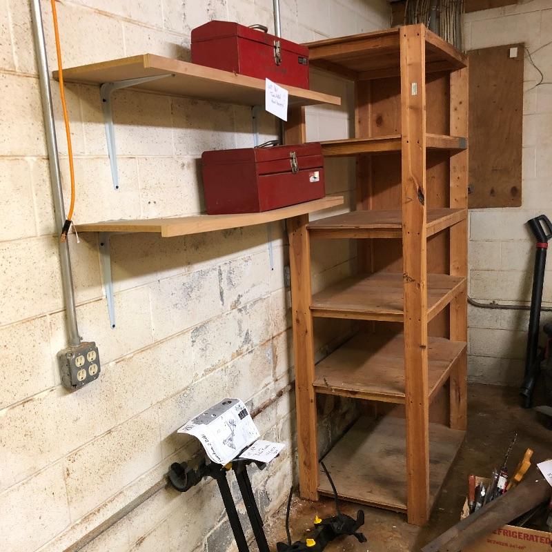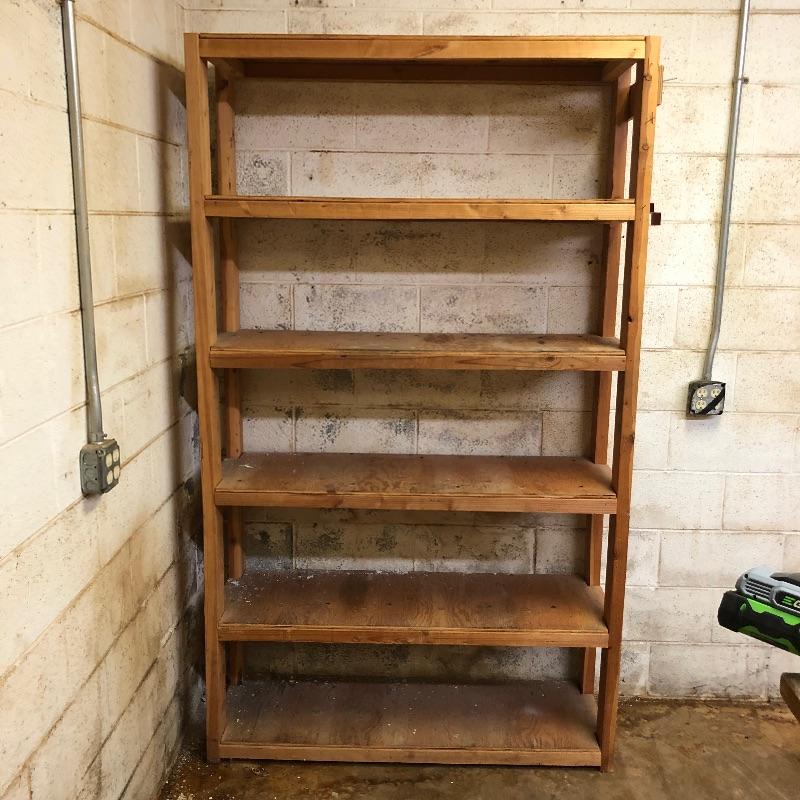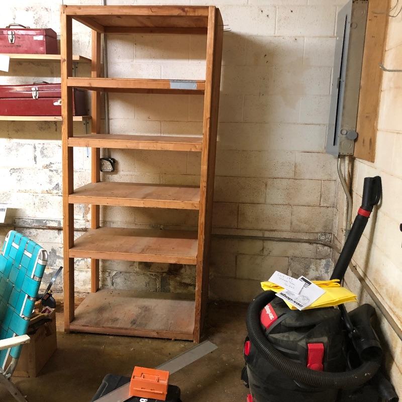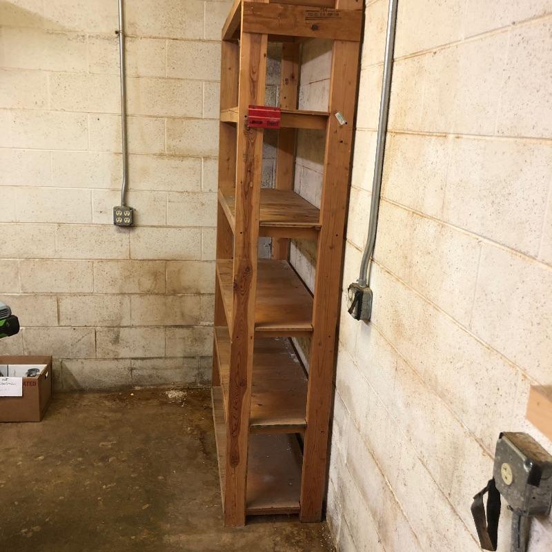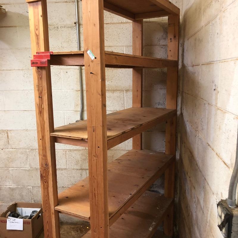 Perfect for your workshop, these two shelving units were built to last and they hold a ton of stuff. They appear to be home made (owner was a carpenter). Frame is made from 2” x 4” wood and the shelves are plywood. 5 shelves on each unit.
