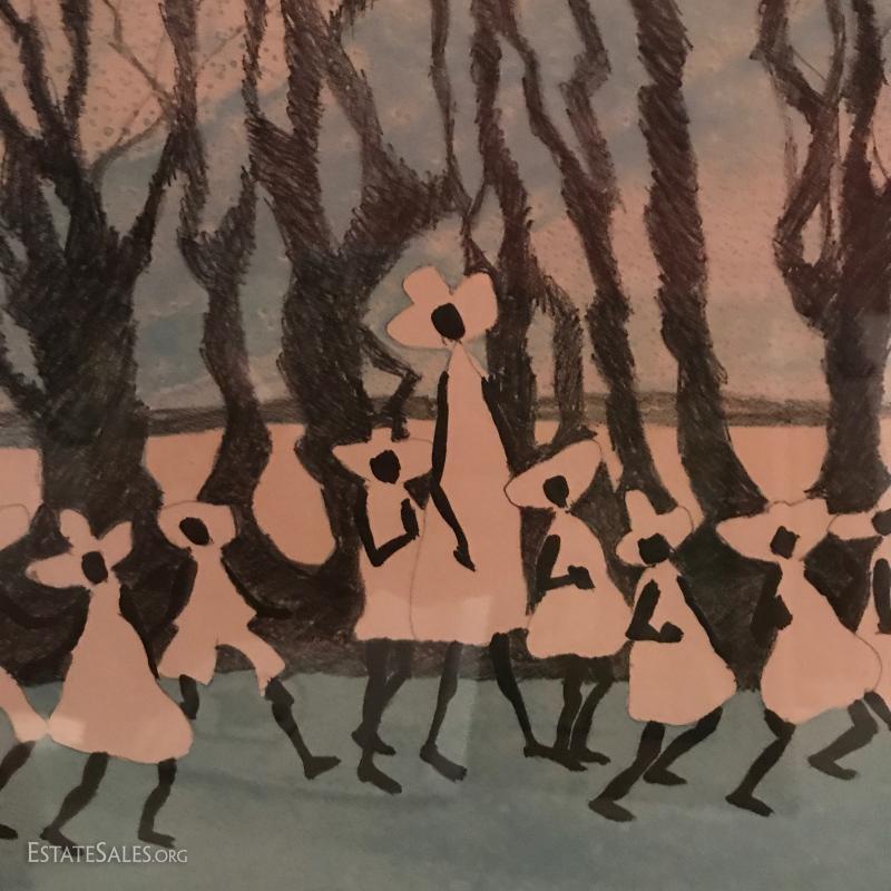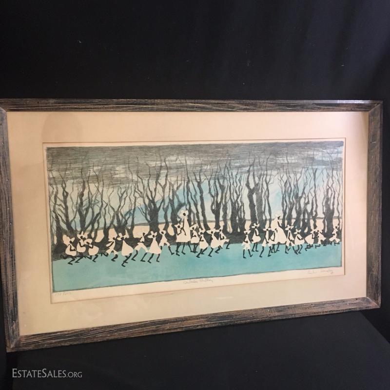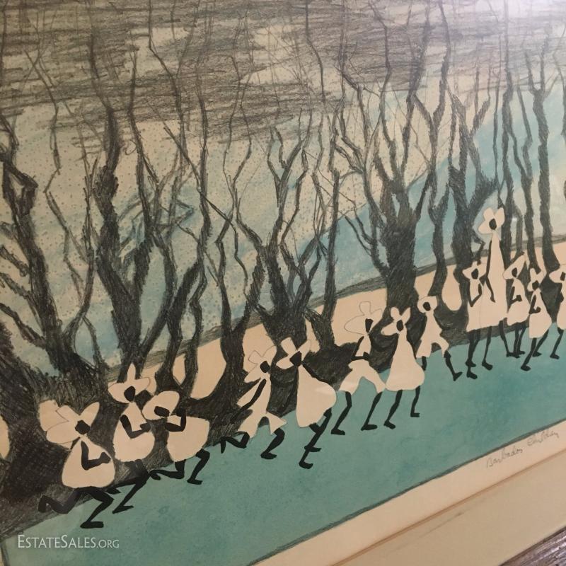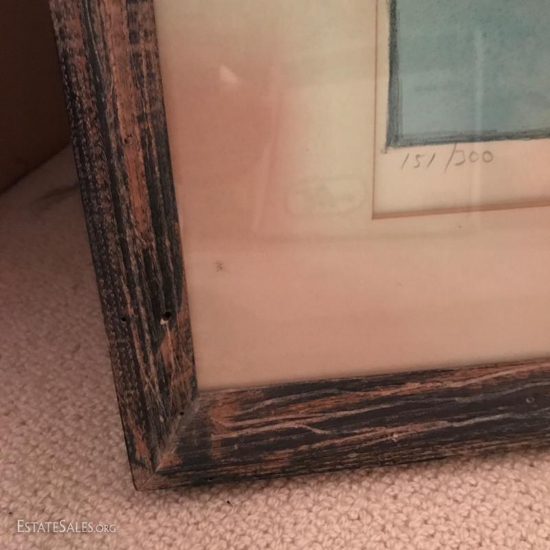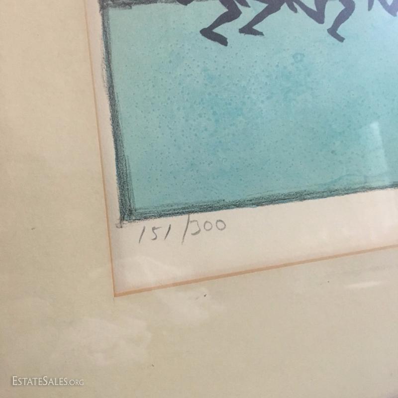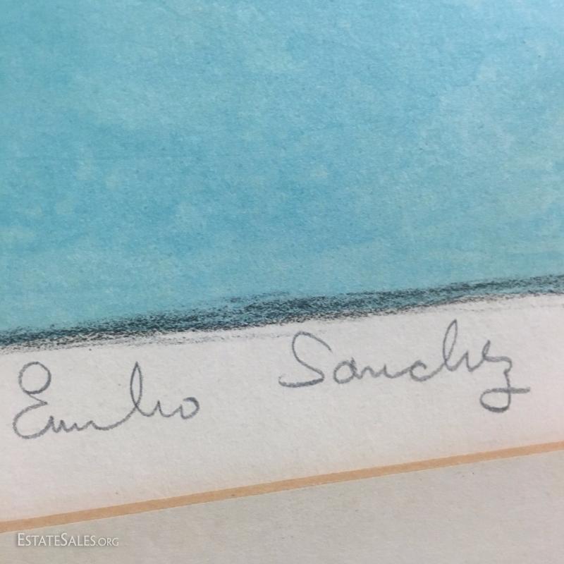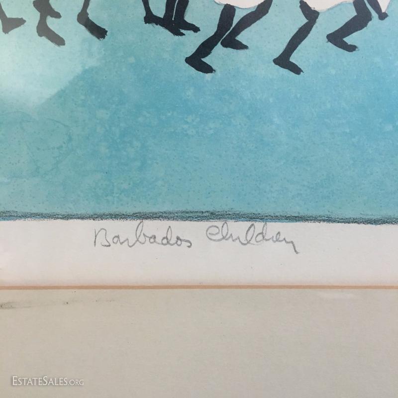 Large beautiful artwork by Emilio Sanchez. Signed by the artist. Number 151 of 300. Titled "Barbados Children". Matted and framed in dark wood frame. Blue and black colors. Colors may not convey in photos. 38.5"l x 22.5"w