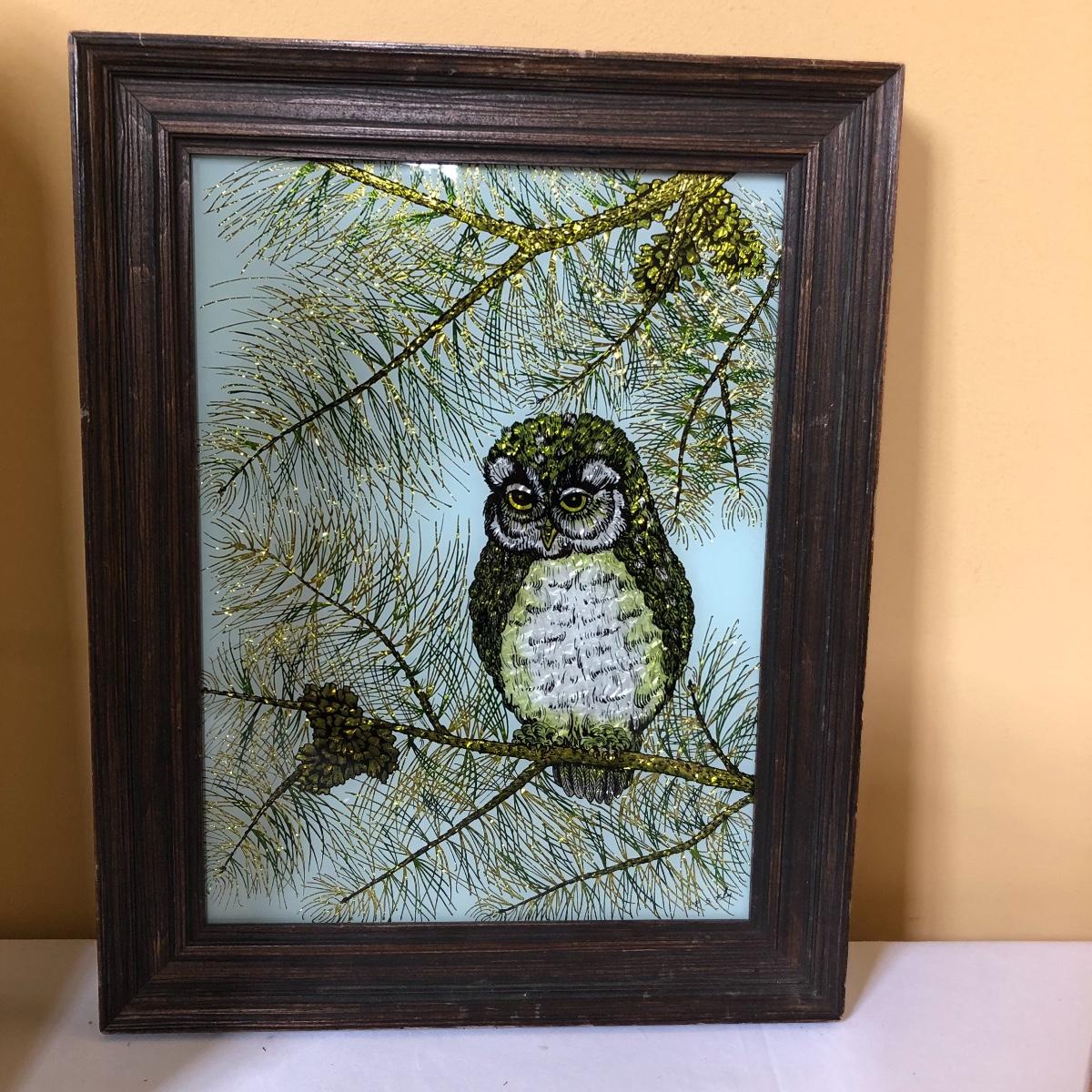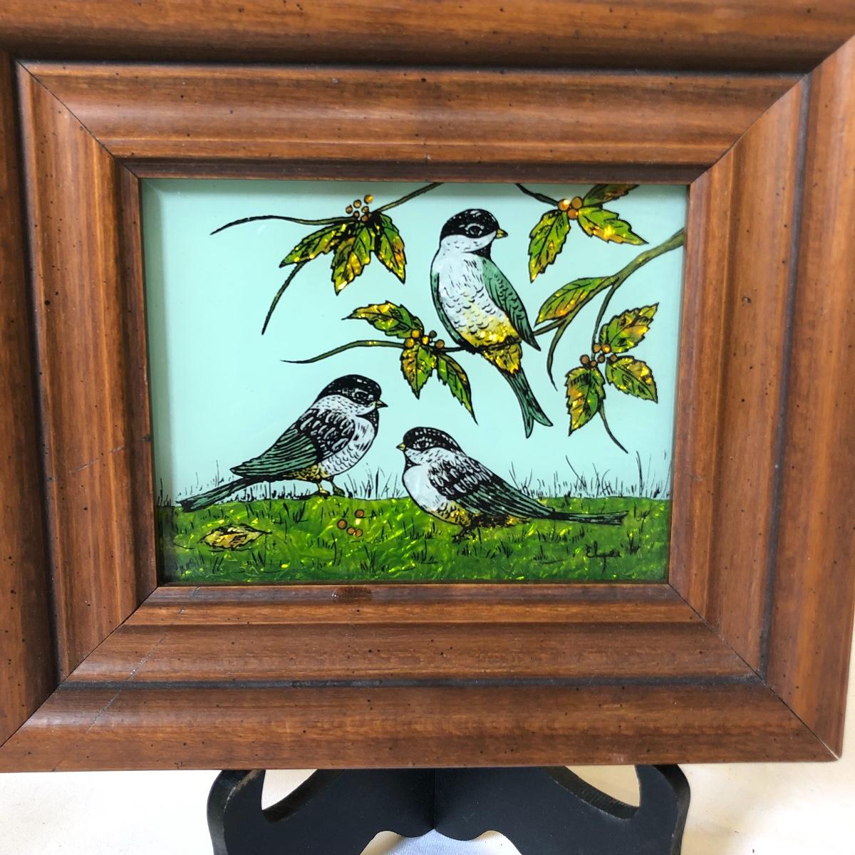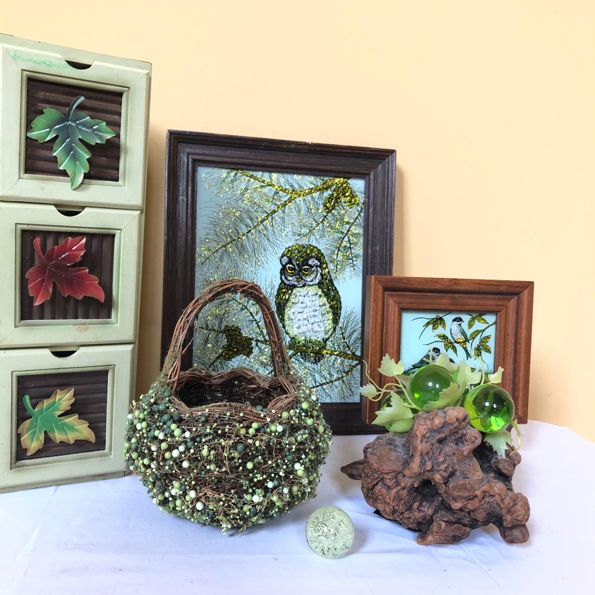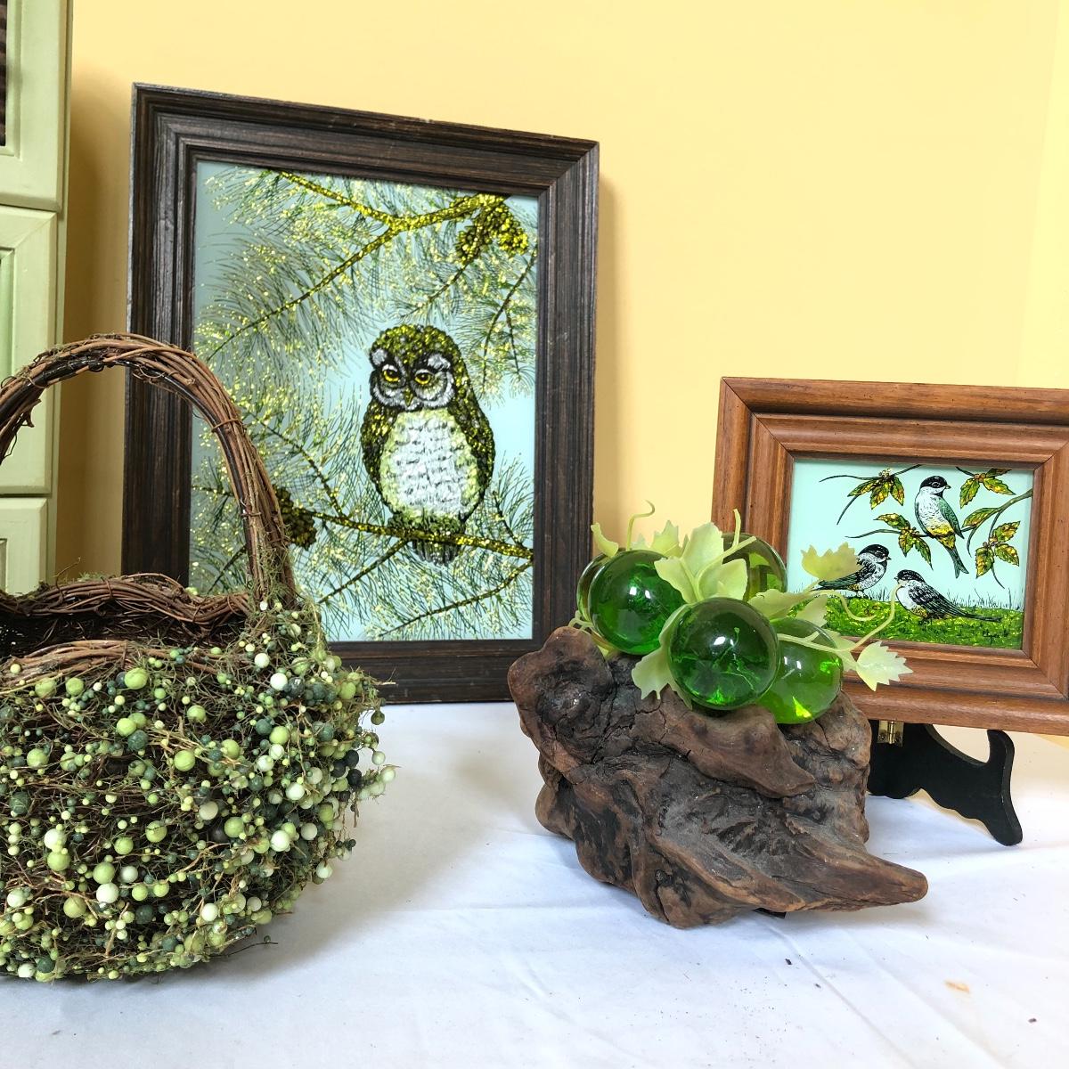 Friends will be green with envy when they see these gorgeous tinsel paintings; this is a form of reverse painting onto the glass. Both appear to have signatures that are indecipherable and both come mounted in wood frames. The owl frame measures 11.5” x 14.5” and it does have a few nicks, see image. Other gorgeous green decor items include an unusual wood small sculpture with green glass ball, a single green glass ball, a beaded basket and a small 3 drawer storage cabinet that measures 5.5” square x 15” tall.