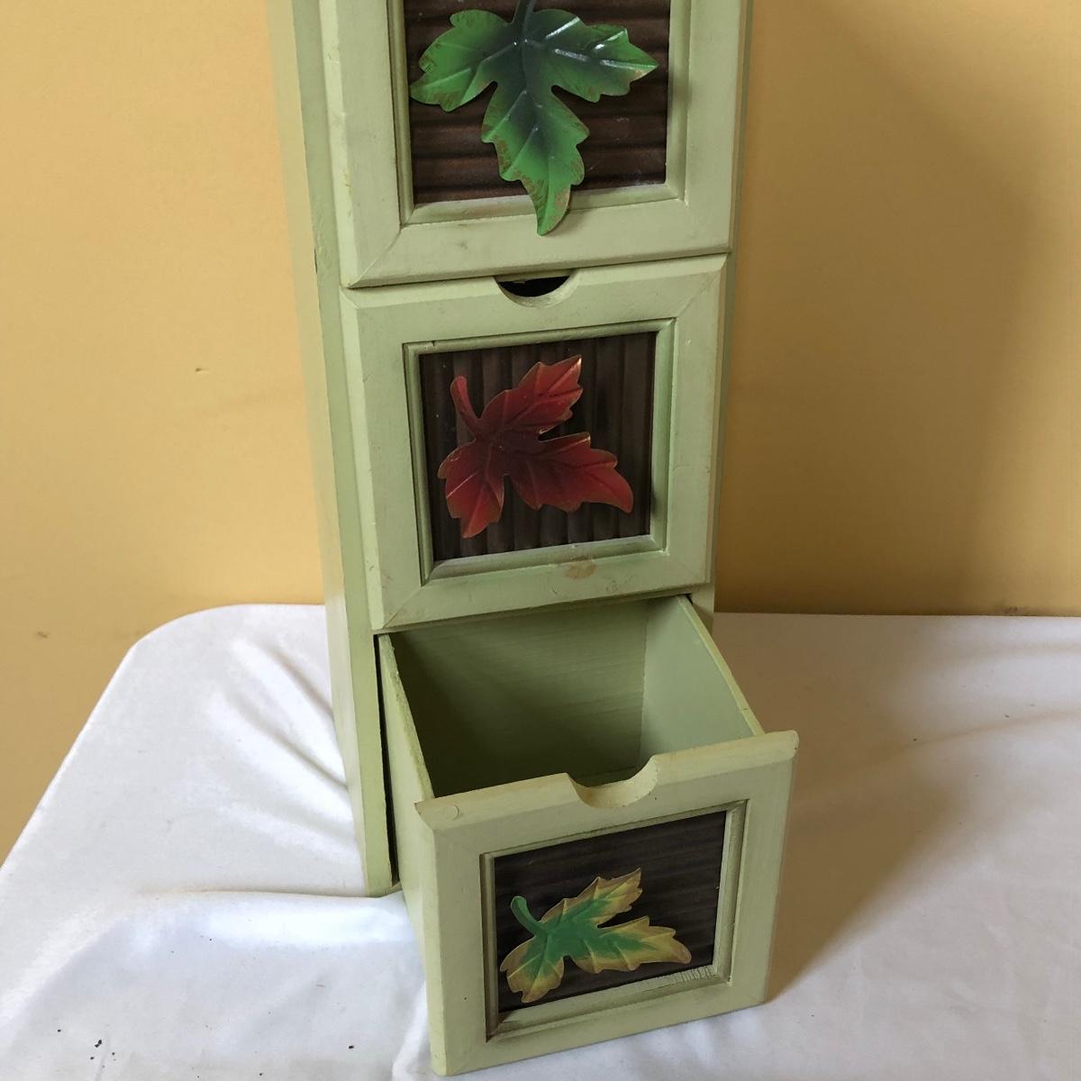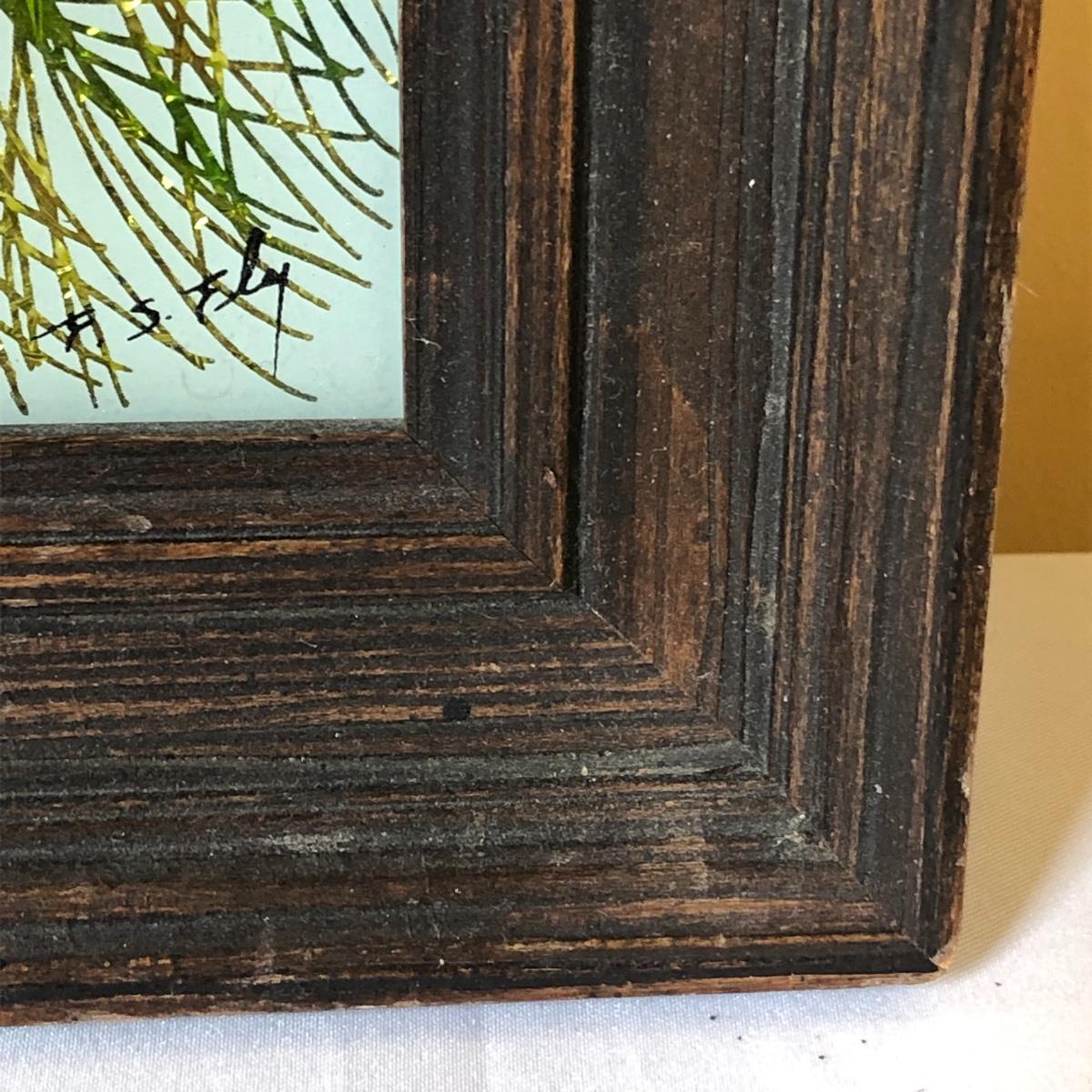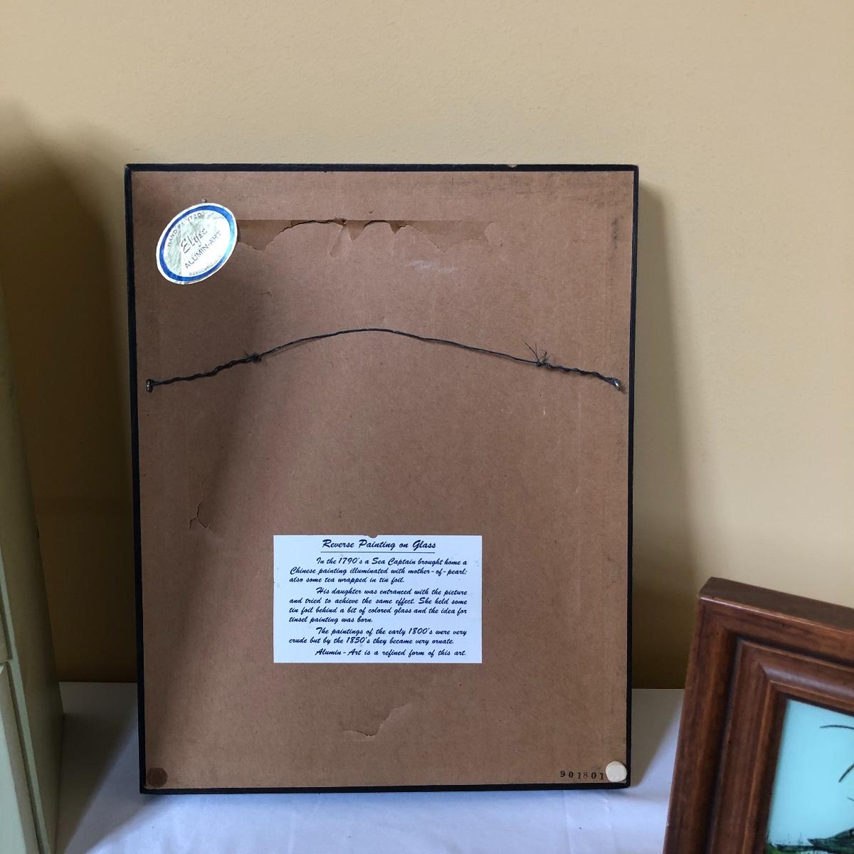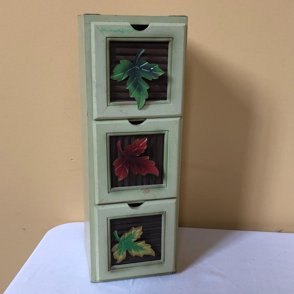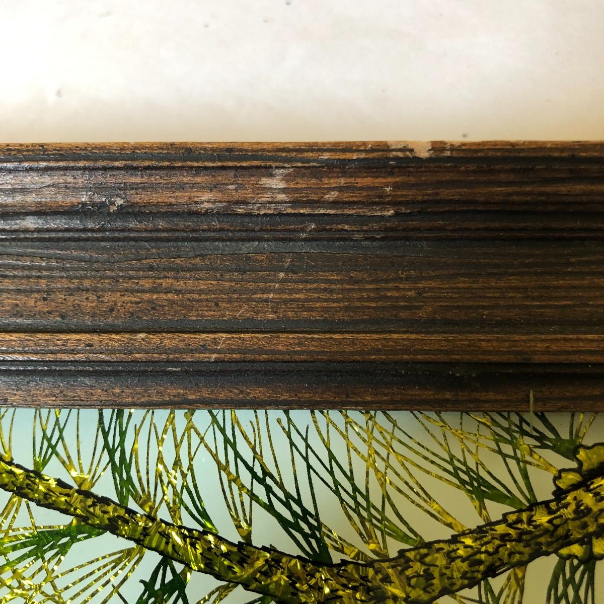 Friends will be green with envy when they see these gorgeous tinsel paintings; this is a form of reverse painting onto the glass. Both appear to have signatures that are indecipherable and both come mounted in wood frames. The owl frame measures 11.5” x 14.5” and it does have a few nicks, see image. Other gorgeous green decor items include an unusual wood small sculpture with green glass ball, a single green glass ball, a beaded basket and a small 3 drawer storage cabinet that measures 5.5” square x 15” tall.