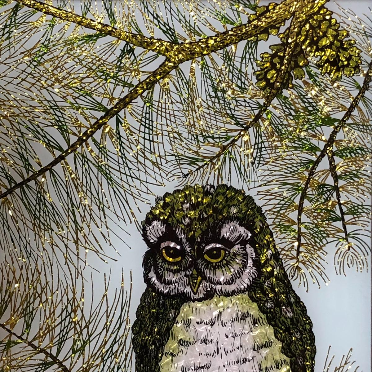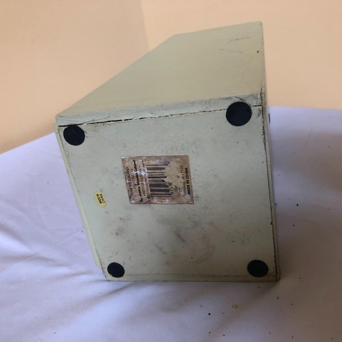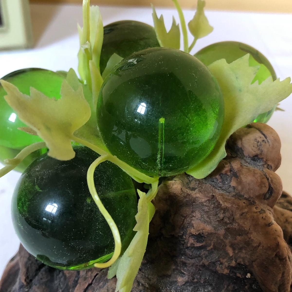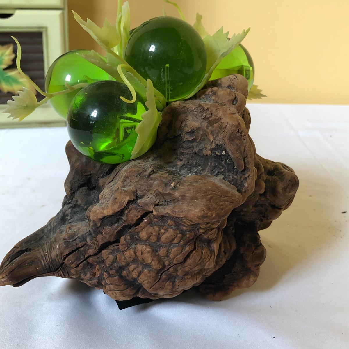 Friends will be green with envy when they see these gorgeous tinsel paintings; this is a form of reverse painting onto the glass. Both appear to have signatures that are indecipherable and both come mounted in wood frames. The owl frame measures 11.5” x 14.5” and it does have a few nicks, see image. Other gorgeous green decor items include an unusual wood small sculpture with green glass ball, a single green glass ball, a beaded basket and a small 3 drawer storage cabinet that measures 5.5” square x 15” tall.