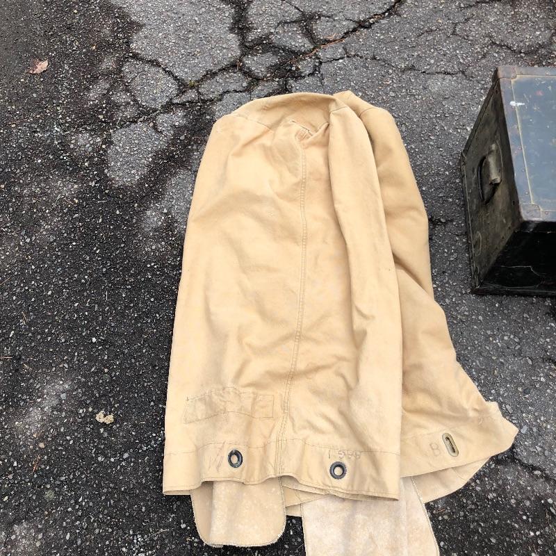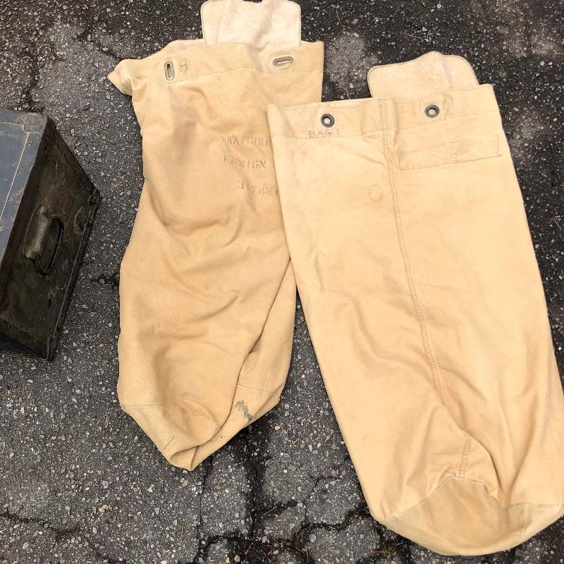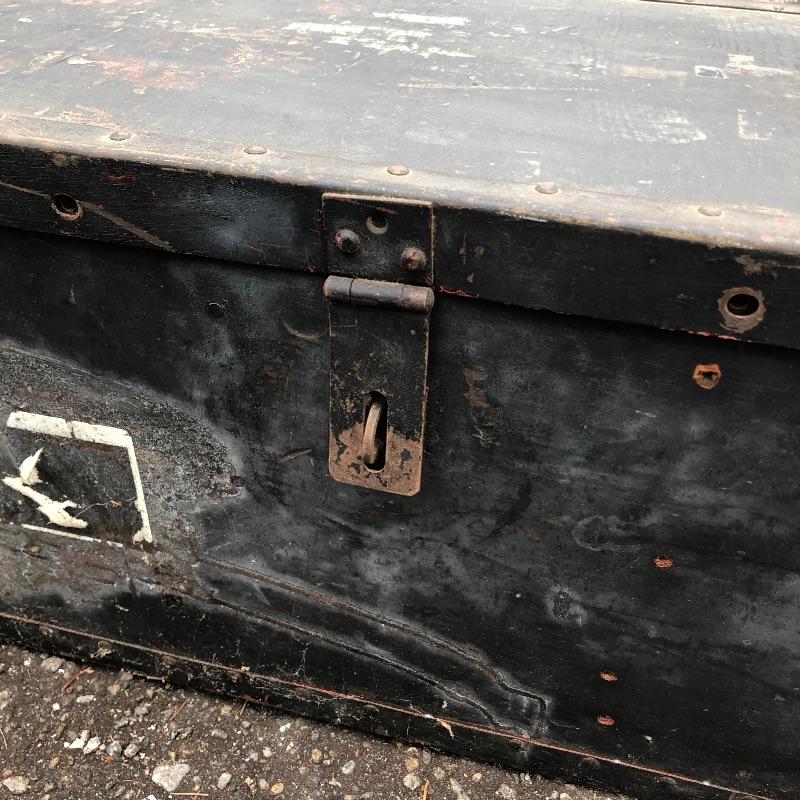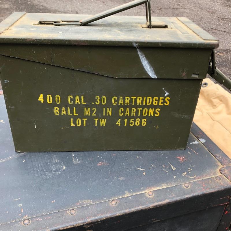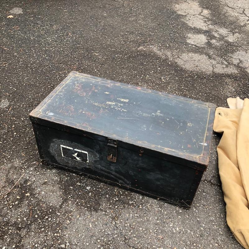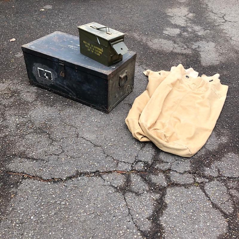 Two vintage storage boxes and two canvas duffel bags complete this nostalgic military lot. The Ammo box is the traditional army green. The chest/foot locker is black and measures 29” L x 15 W x 12 H.