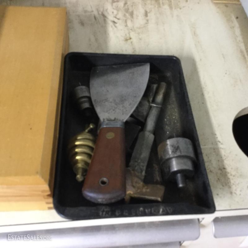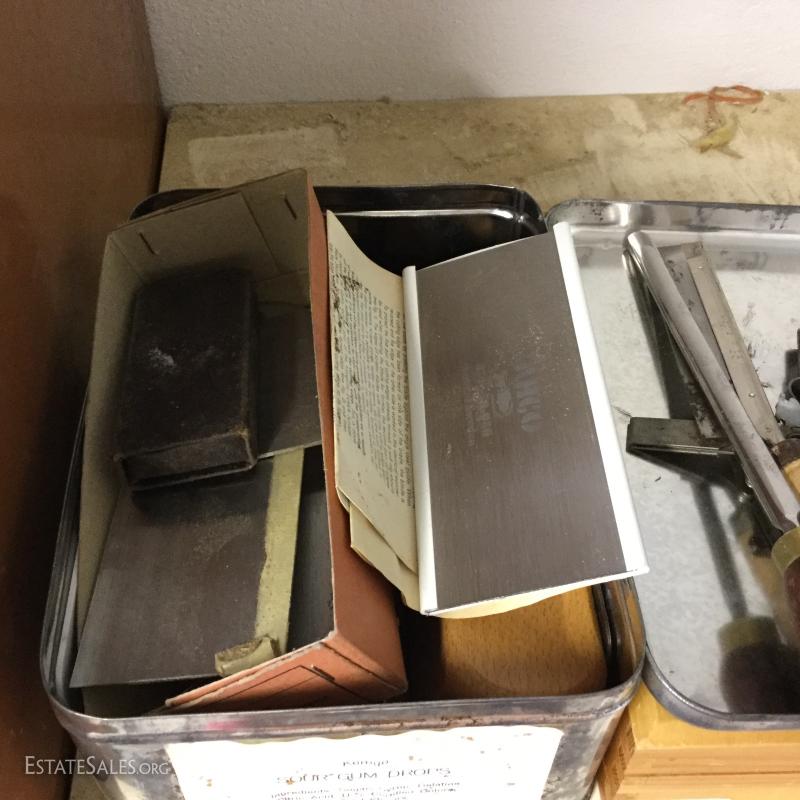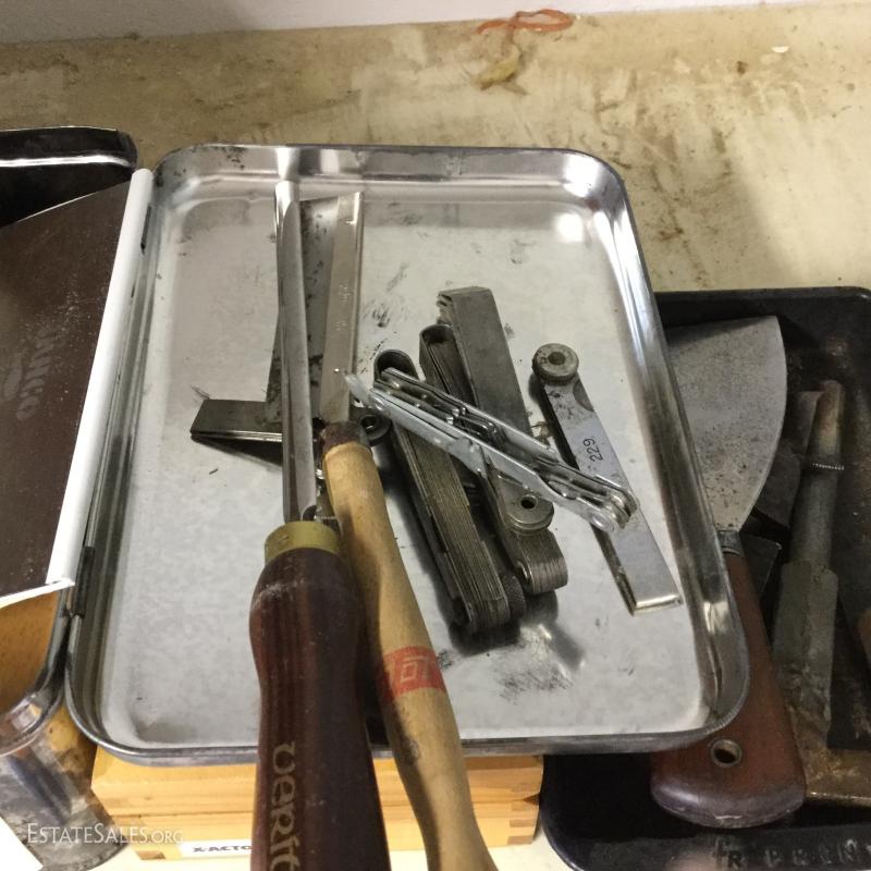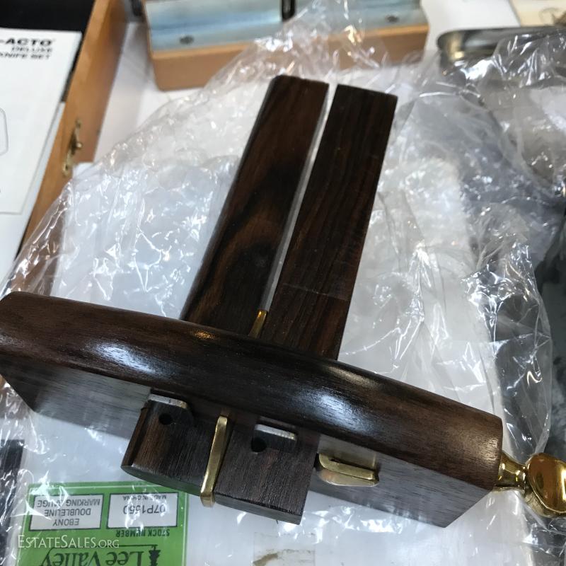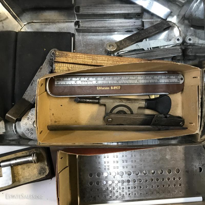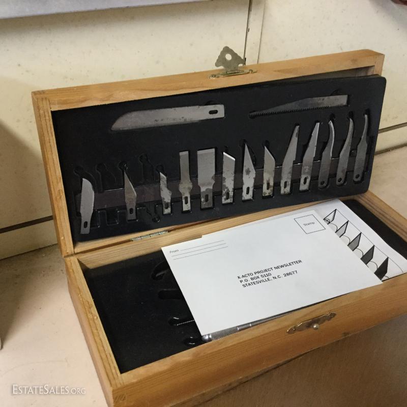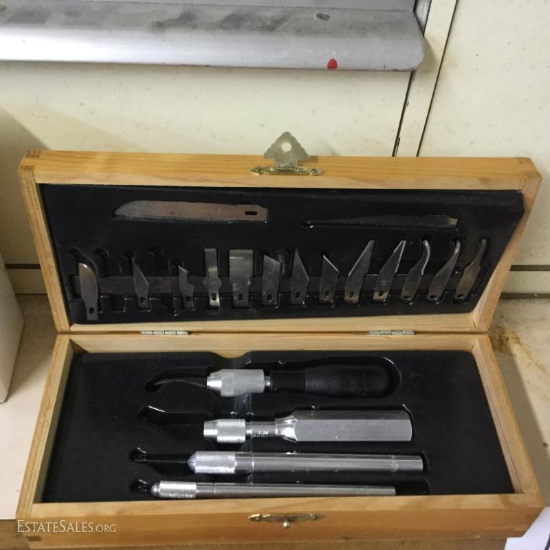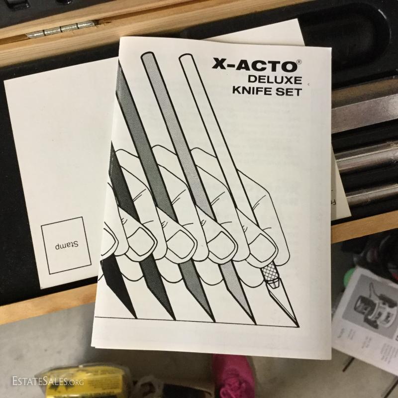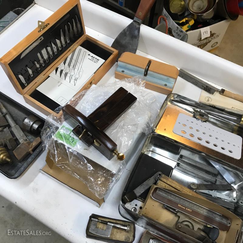 Deluxe X-Acto knife set. Several calipers for measuring. Japanese style marking/cutting guage new in box. Other misc. See photos.