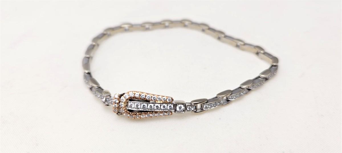 This one is a real beauty - 7" long, "belt" style clasp - 18kt white gold/yellow gold set with twinkly little diamonds all around. Understated, but a real knock out at the same time. Lovely condition. Opening bids for fine jewelry are set at just above the scrap price and will not be reduced.