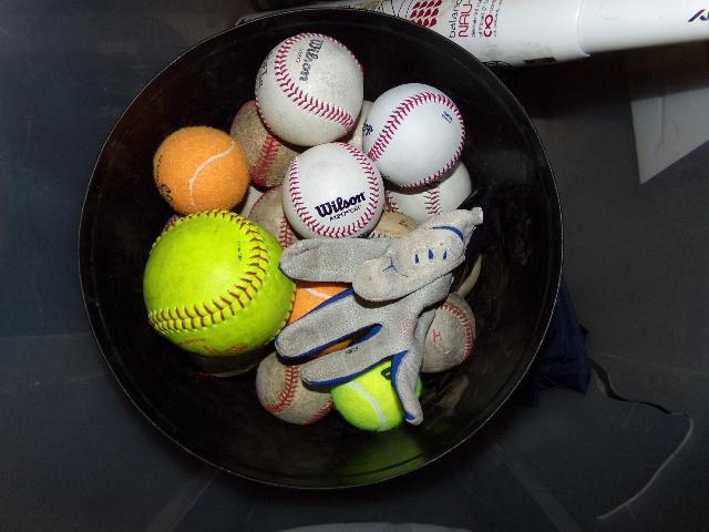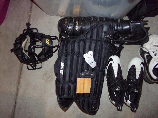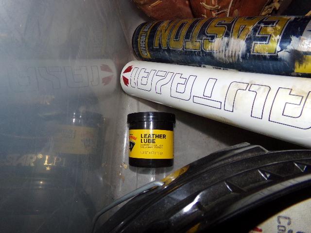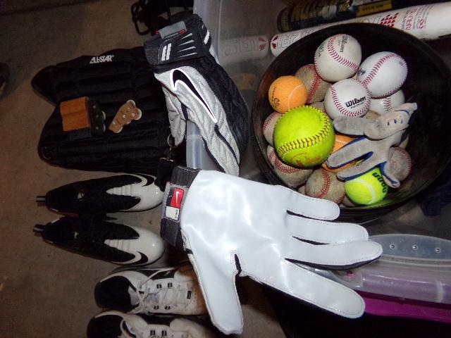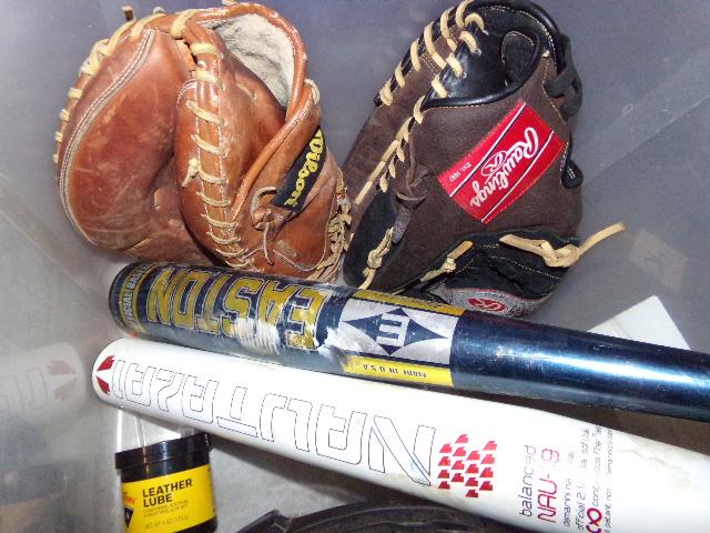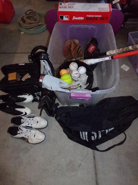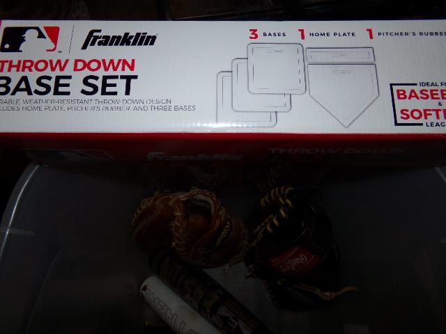 THROW DOWN BASE SET, CLEETS, BASEBALLS, BATS, GLOVES, SOFTBALL LEATHER LUBE, CATCHERS GUARD MASK & CHIN GUARDS