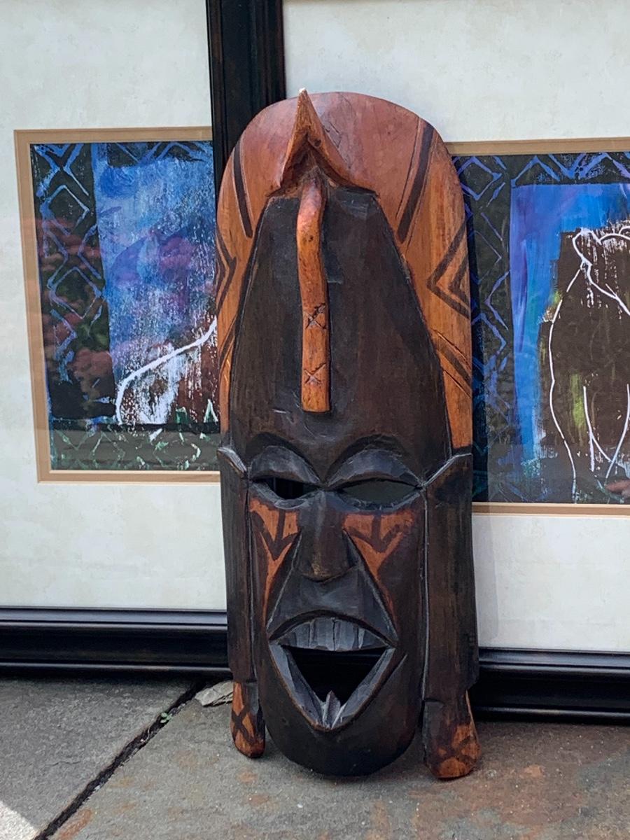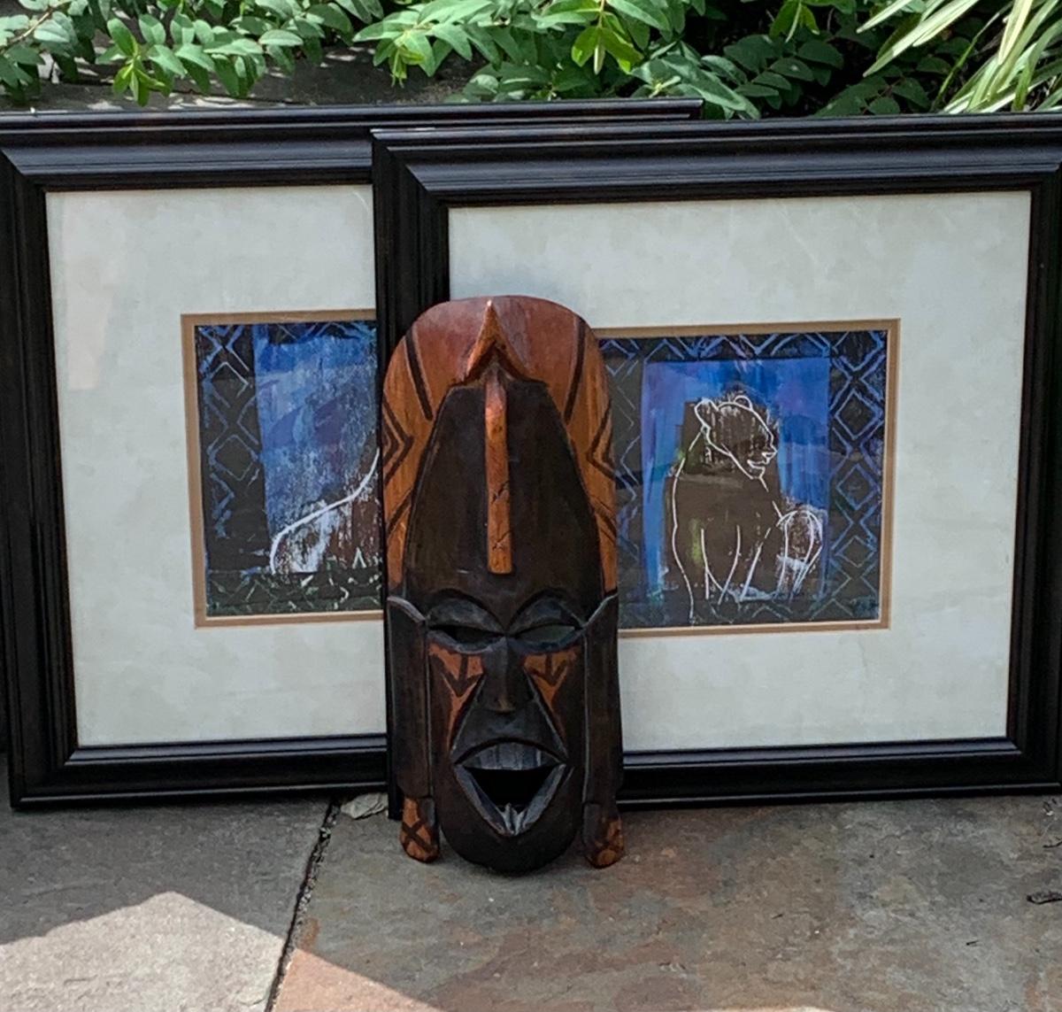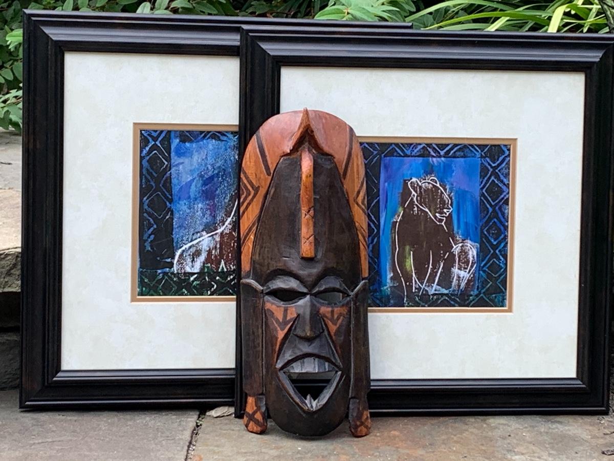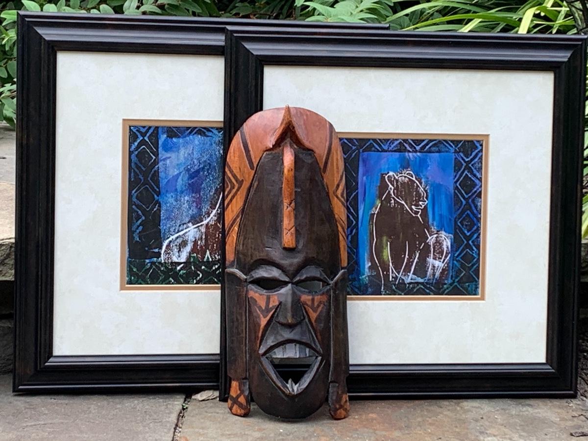 Hand carved tribal mask, Kenya along with framed 17 x 17 animal prints