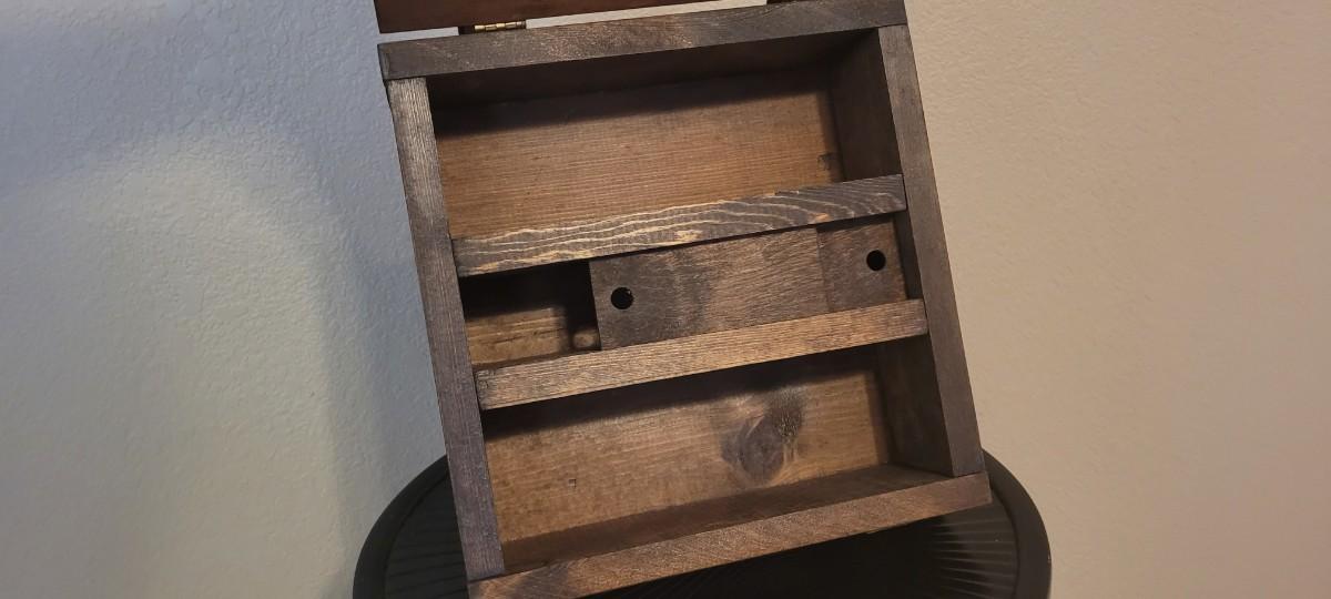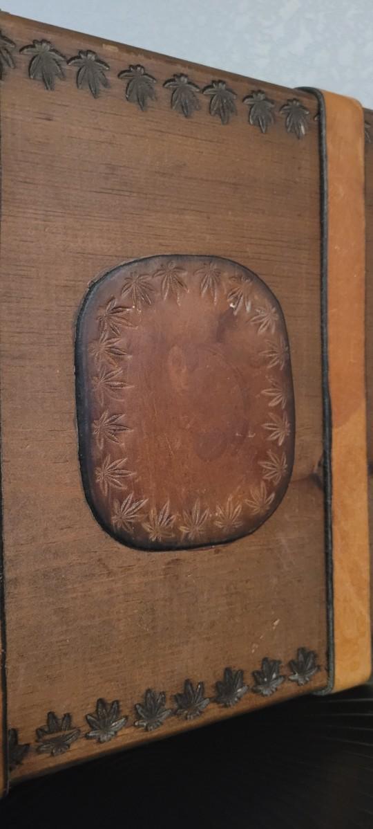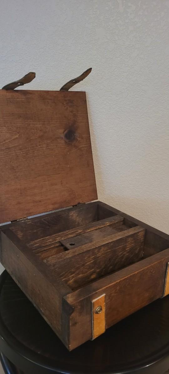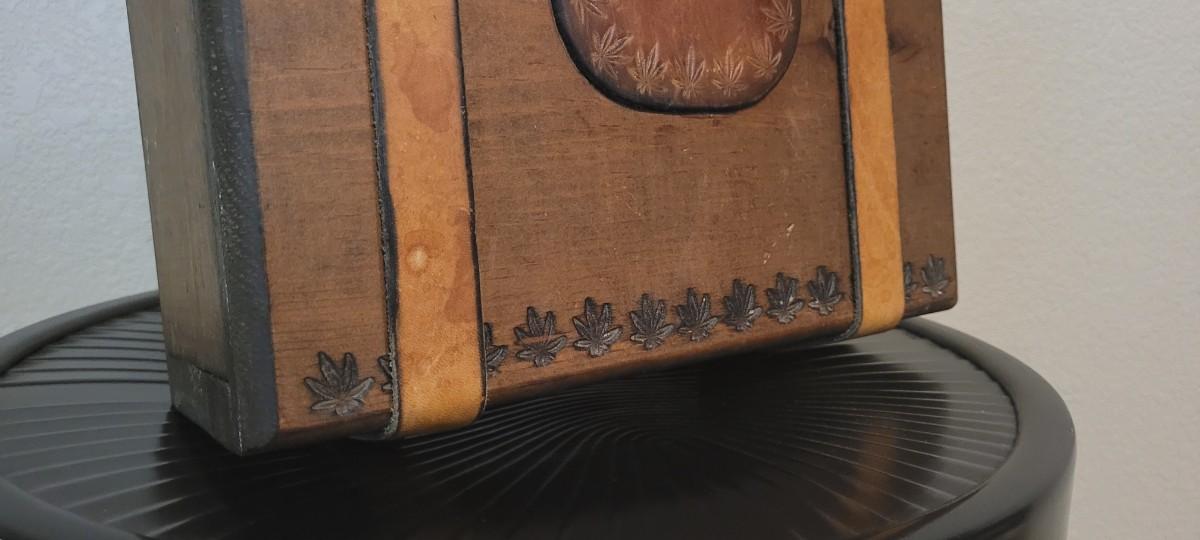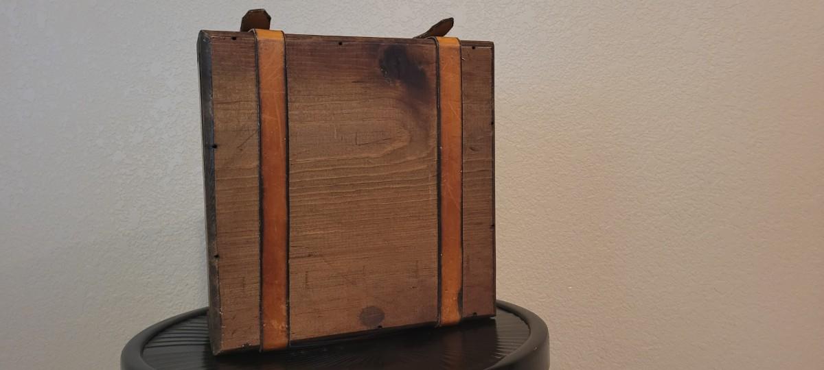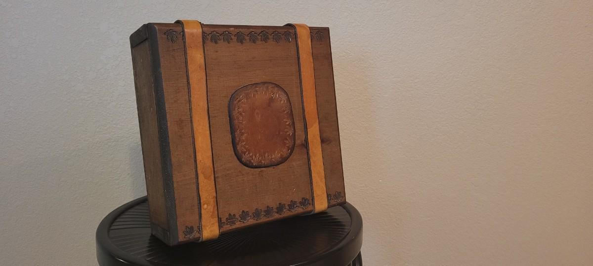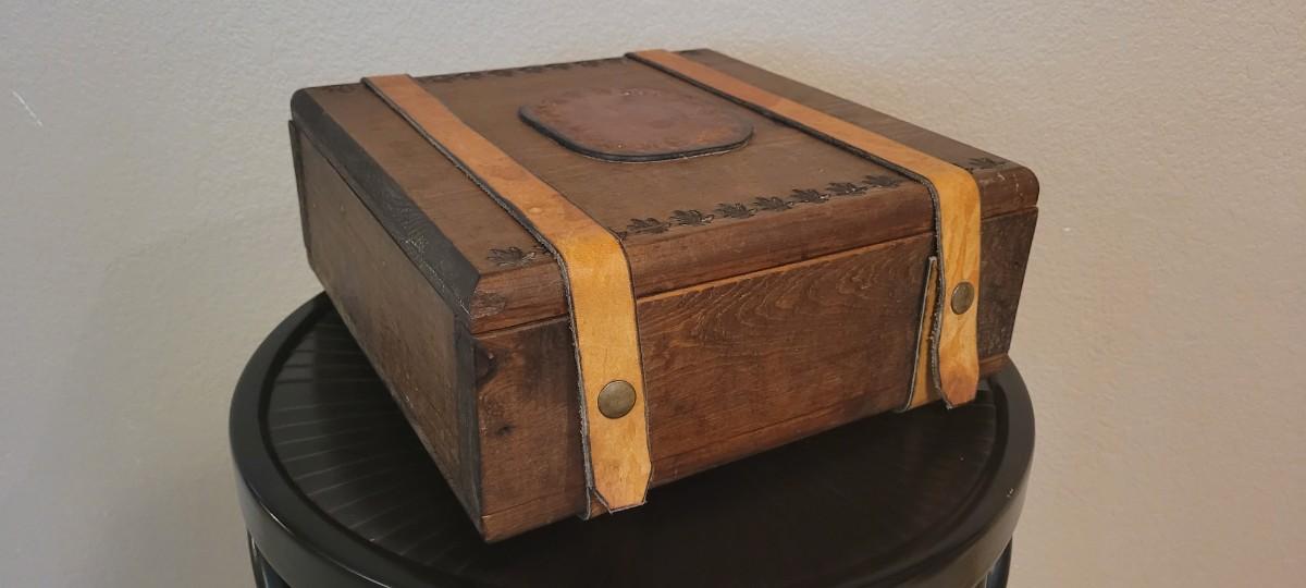 Nice Handmade Brown Wood Box with Leather closure straps. Does show some fun leaf Accents throughout.
