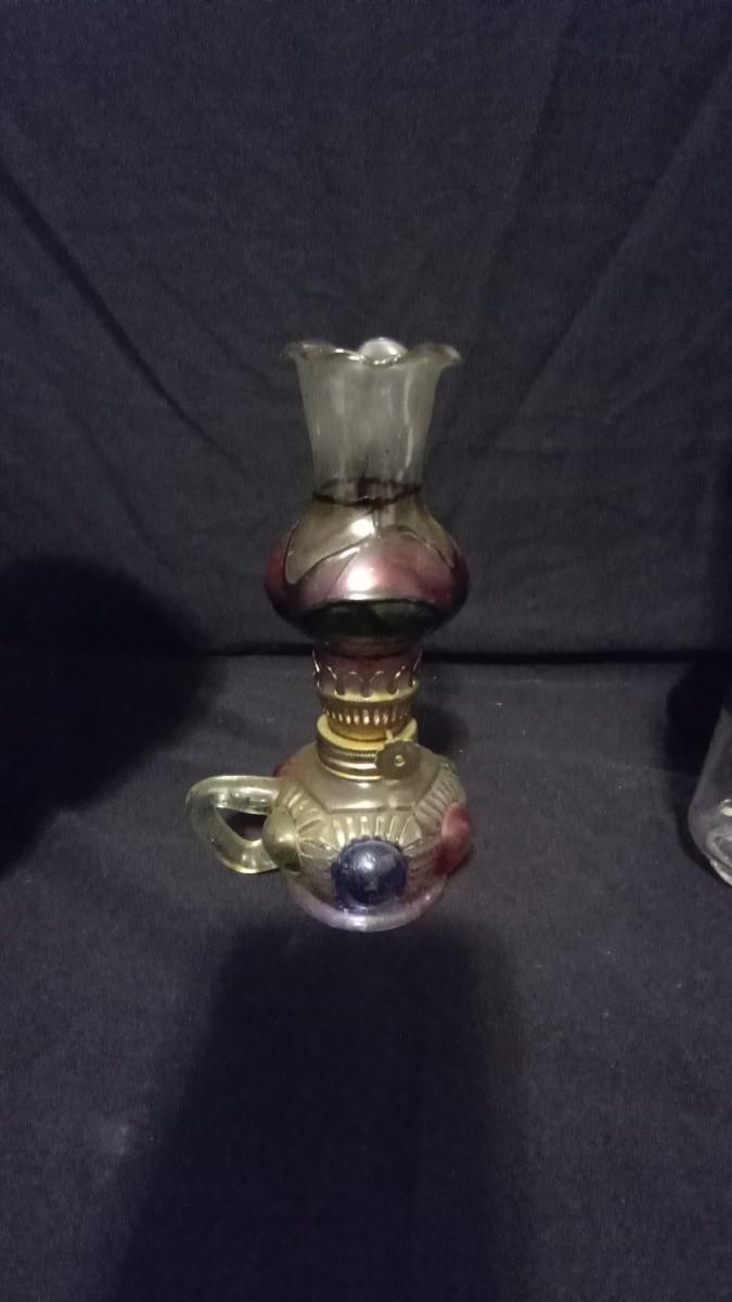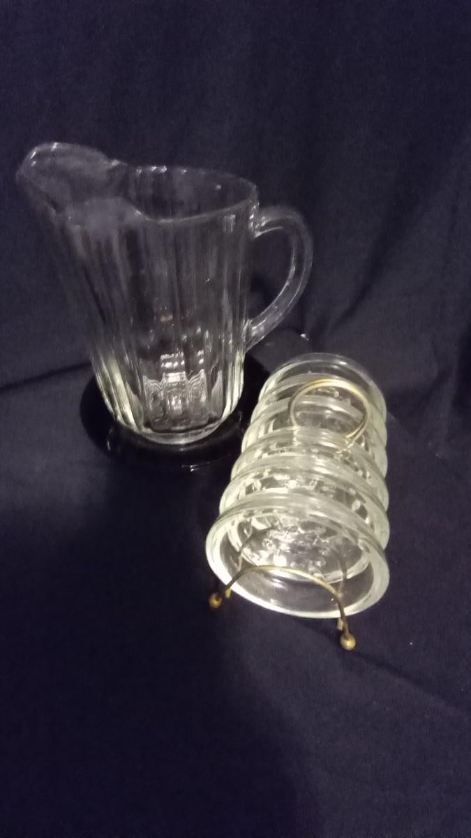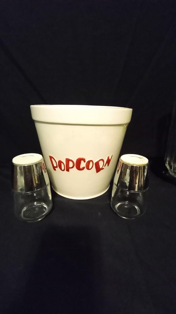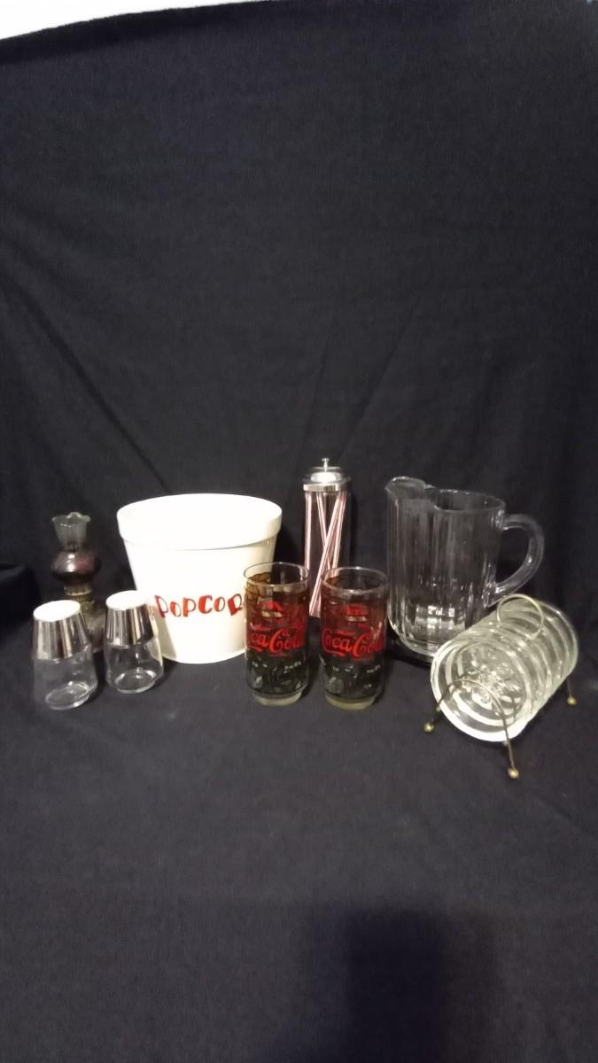 CERAMIC POPCORN BUCKET-VINTAGE COKE GLASSES-STRAW HOLDER-GLASS COSTERS-SALT & PEPPER HOLDERS-GLASS PITCHER AND VINTAGE OIL LAMP