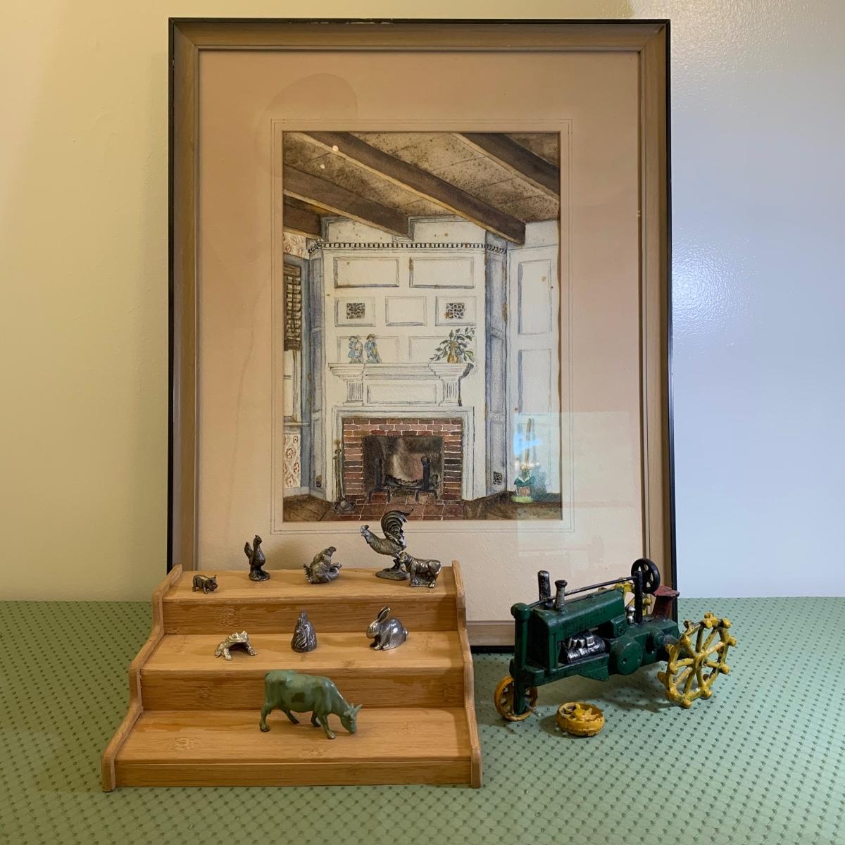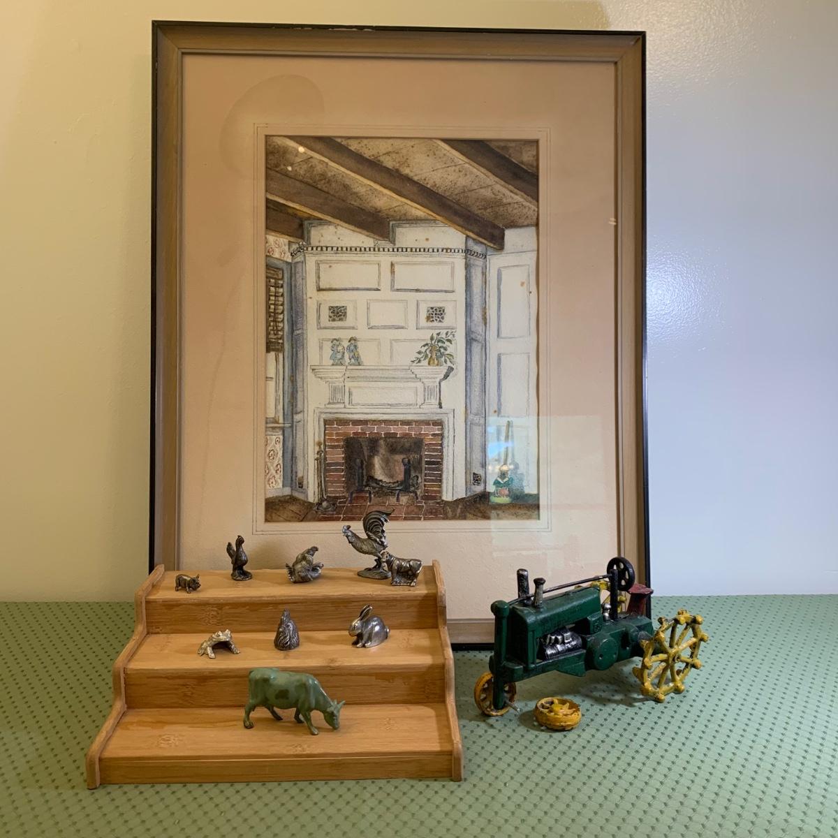 Lot 189: Farm House Collectables with Cast Iron Tractor Hudson and Perth Pewter Animal Figures, Framed Watercolor  and More