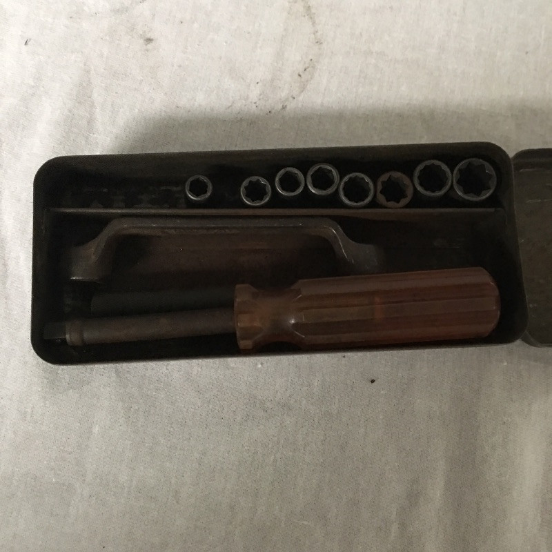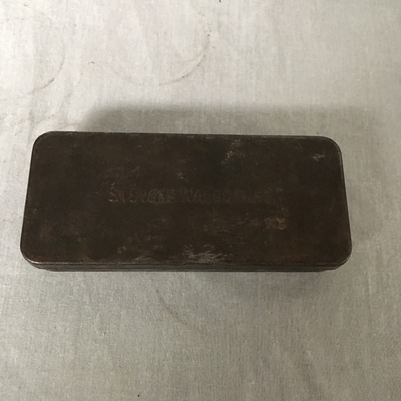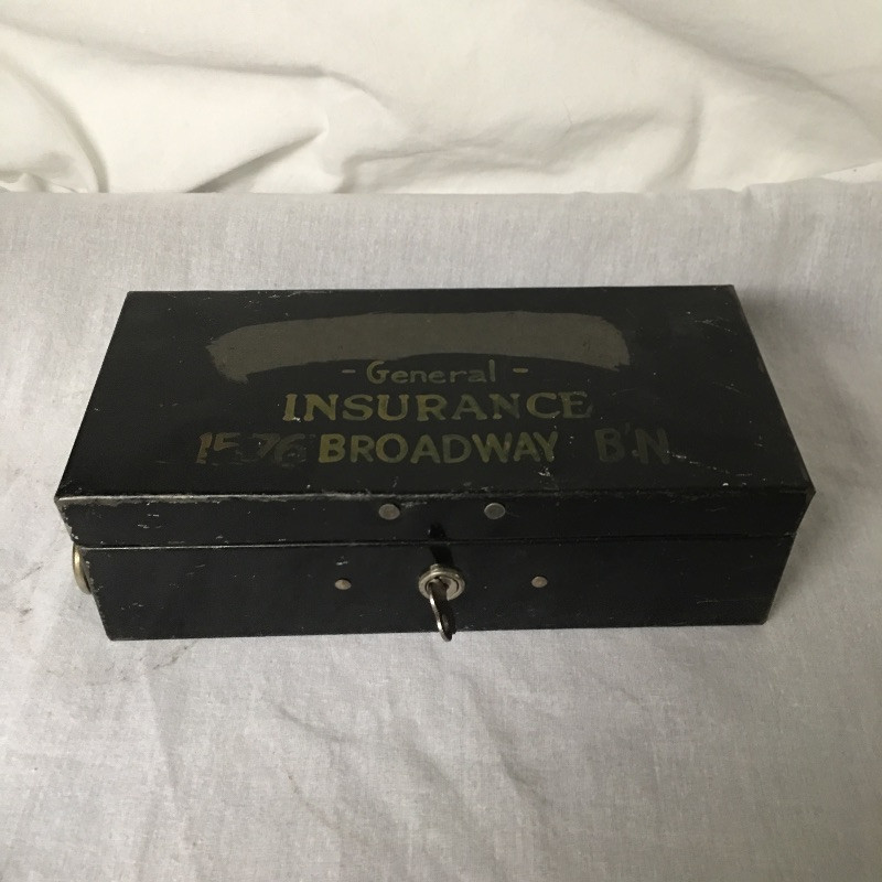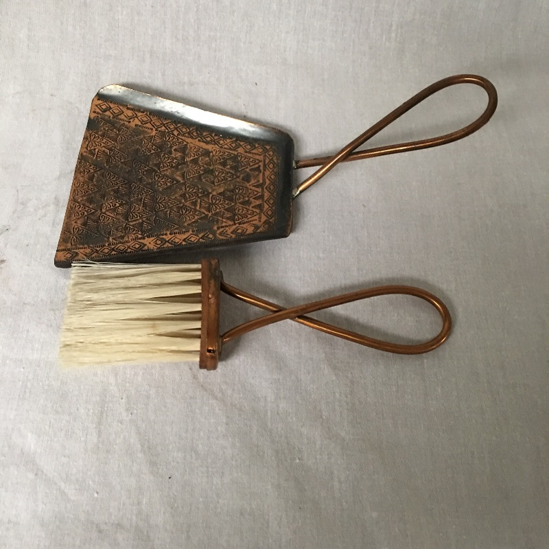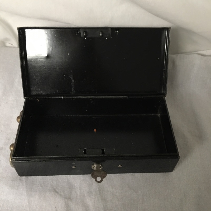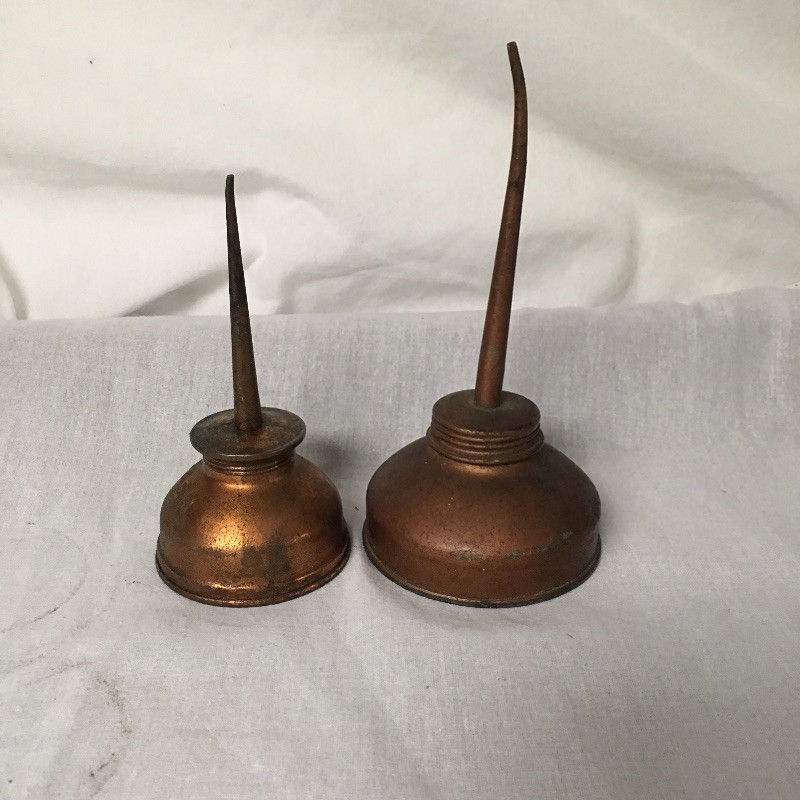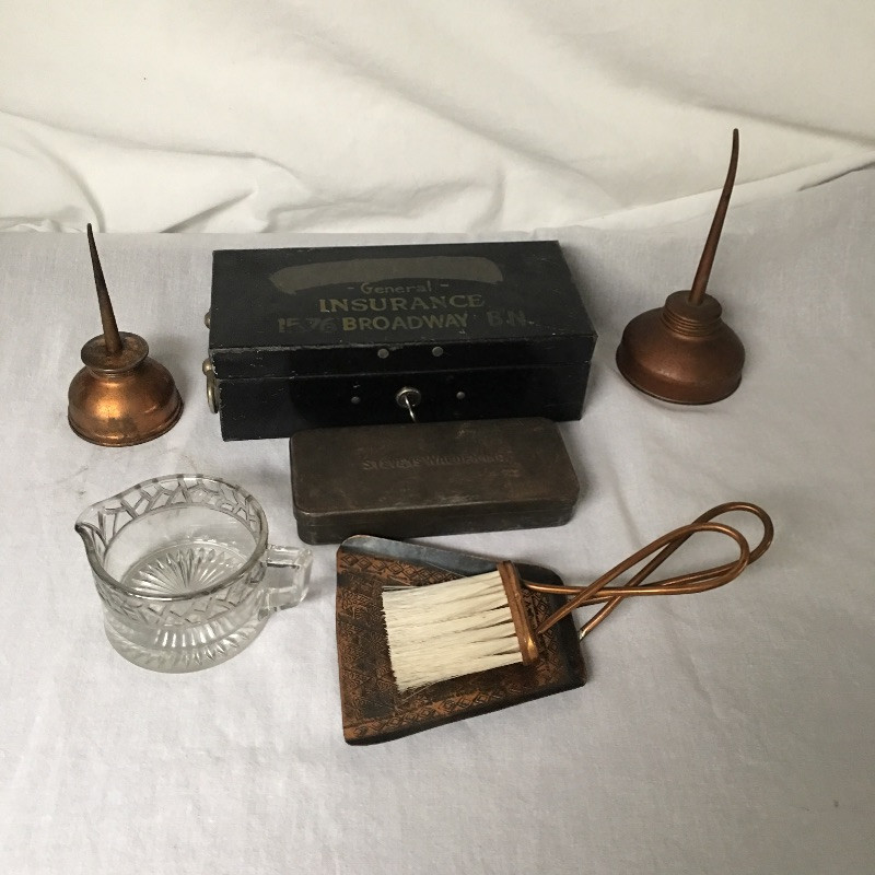 Antique tools includes a pair of oil cans, small tool set, tabletop brush and pan and small metal lockbox.