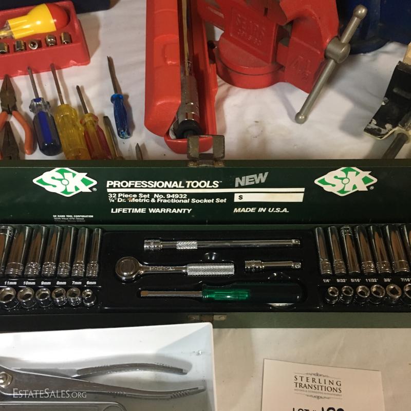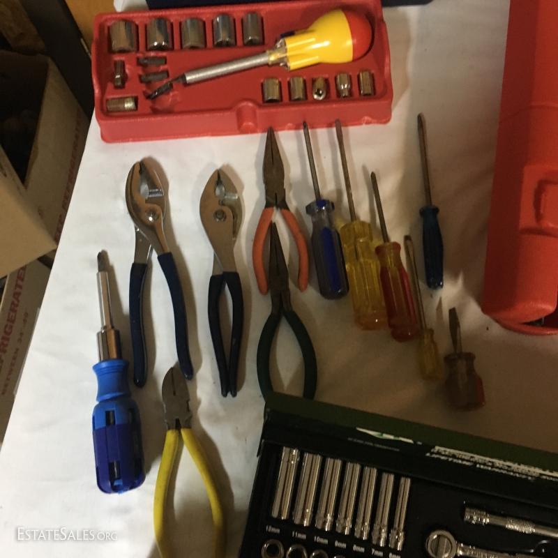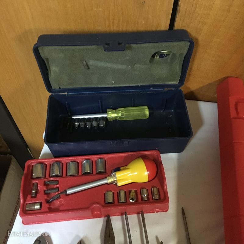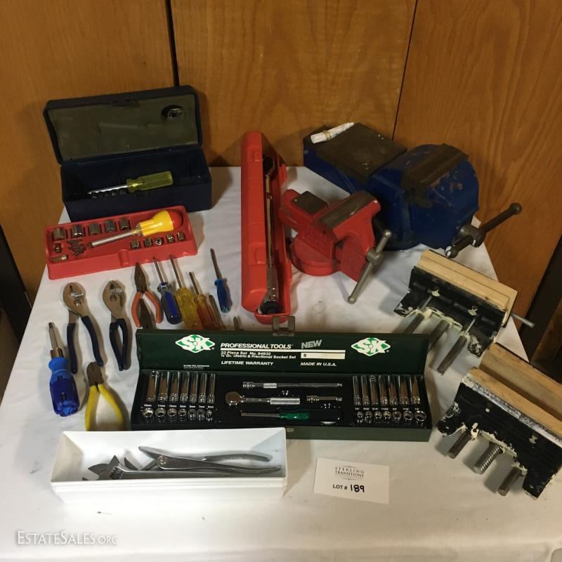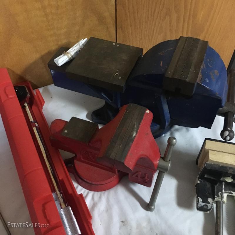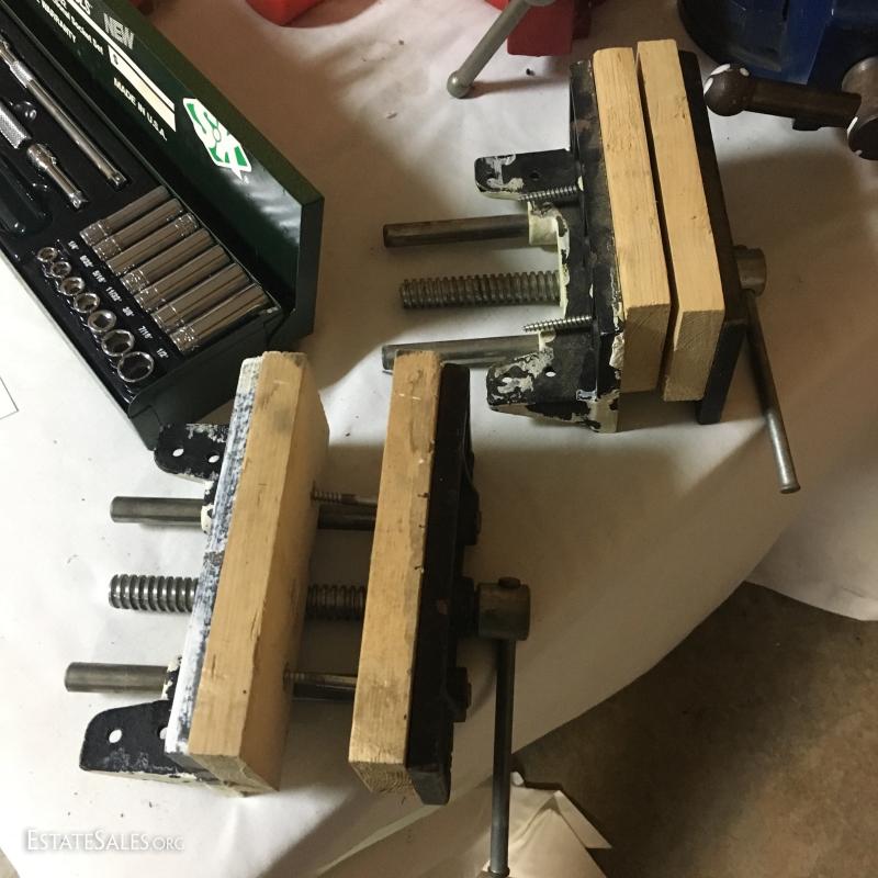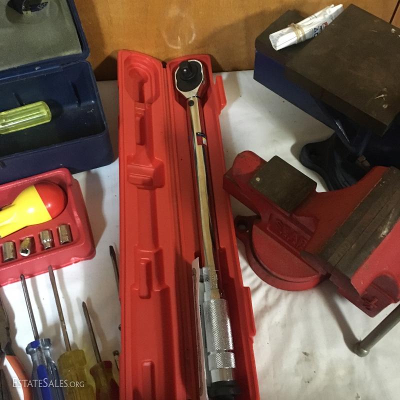 Two Bench vise clamps, like new Torque Wrench, socket set, screwdriver socket set and misc. screwdrivers.
