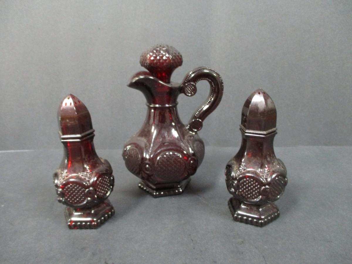 Lot 189 - Cape Cod Ruby Red Avon  Cruet w/ Stopper & S&P Shakers