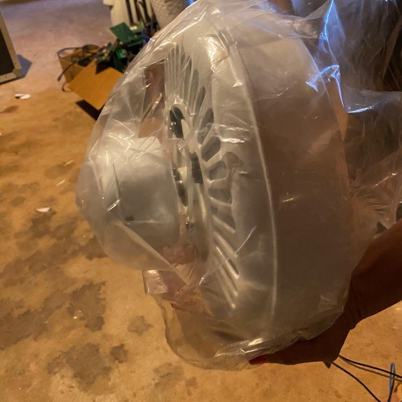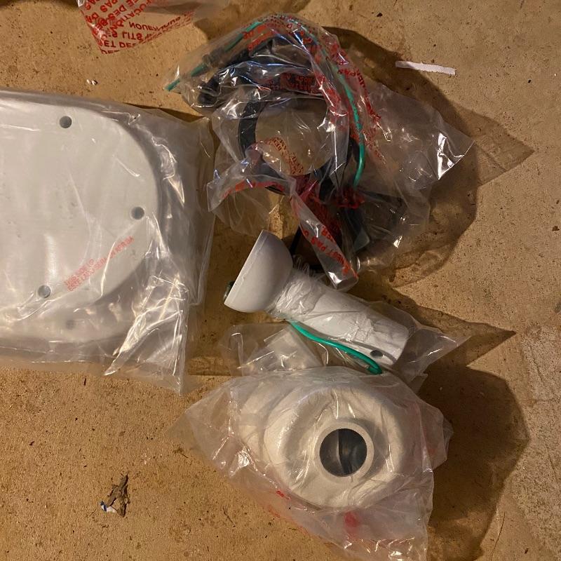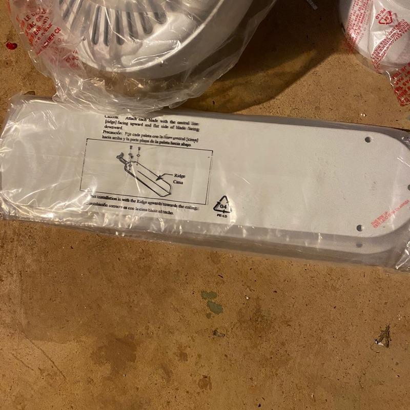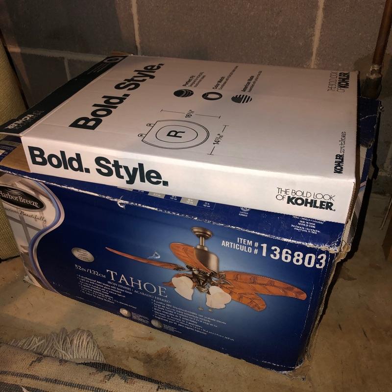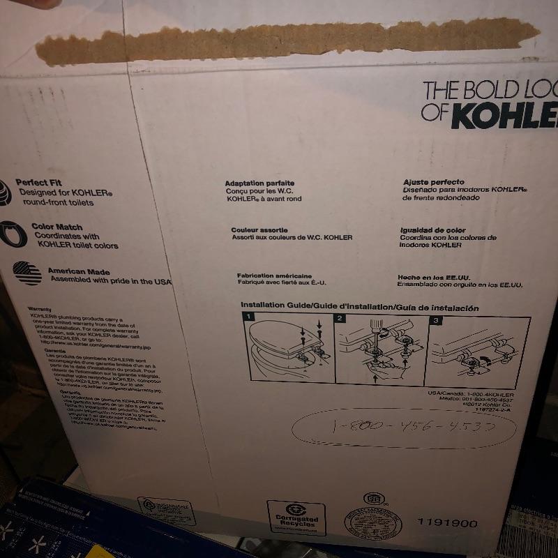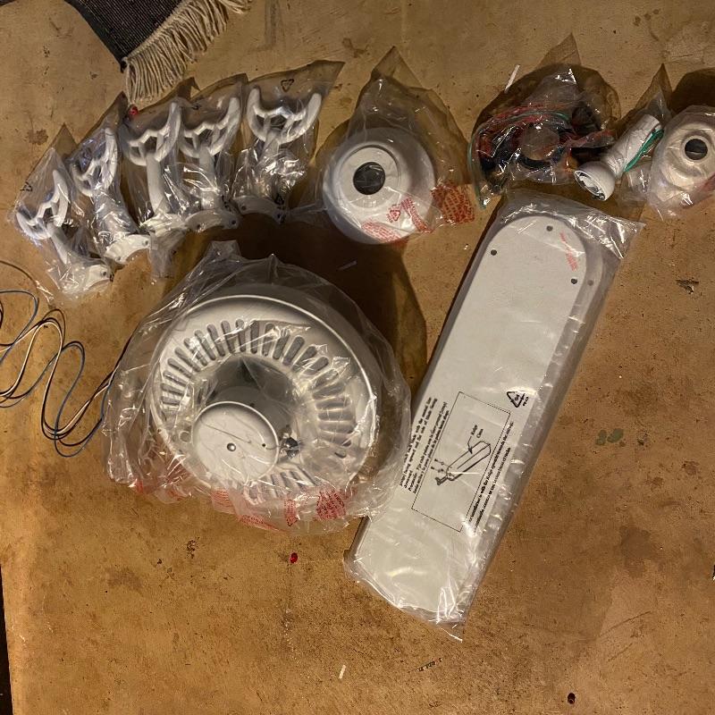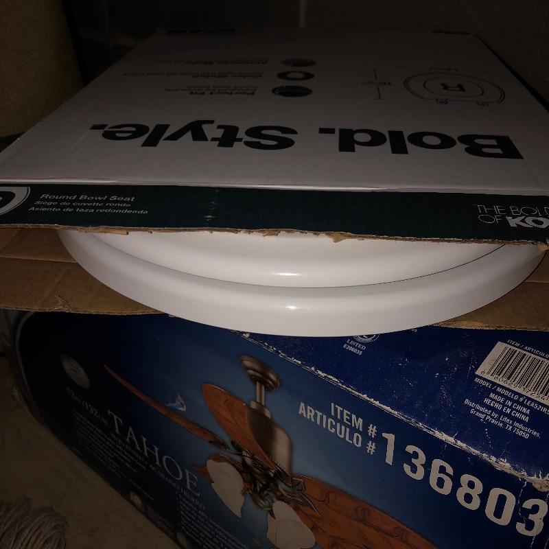 This lot includes one white toilet seat by Koehler that measures 15.5h x14w. Also includes a new white ceiling fan! This has been kept in a box that is not the original but it looks like it hasn't been used. Five Fan blades measure 21.5” long. FaN is all white and doesn’t have a light. Looks like all parts are there. No shipping.