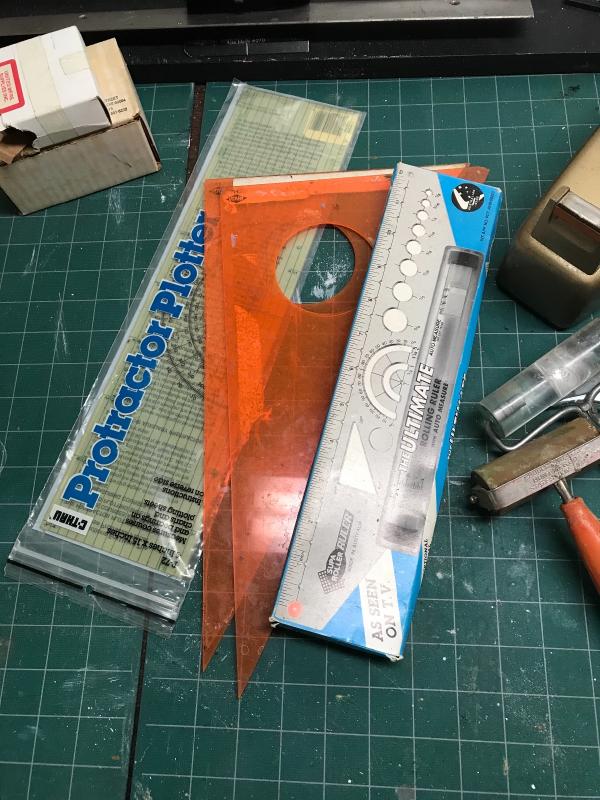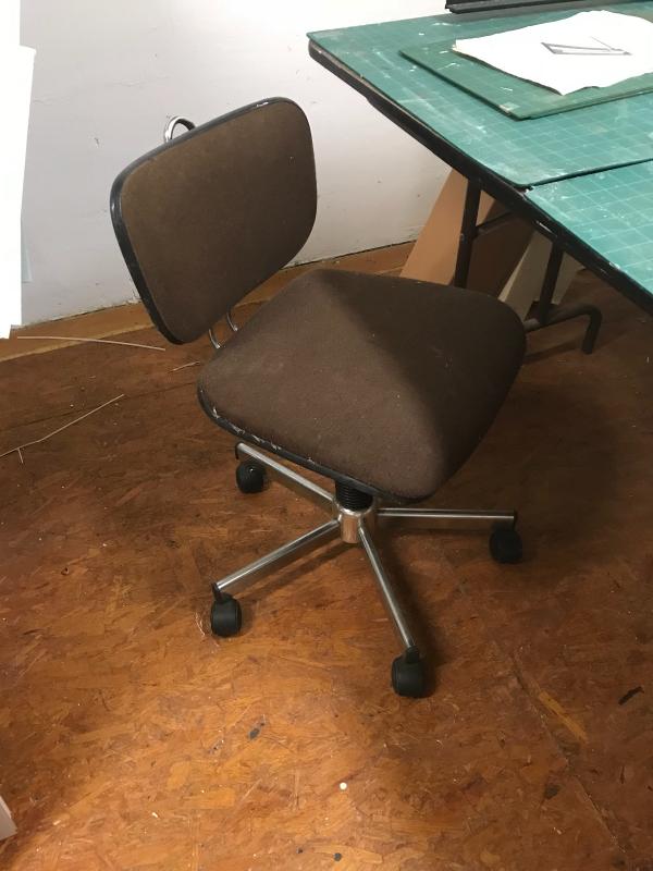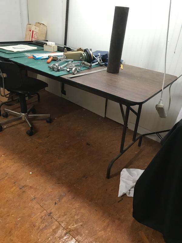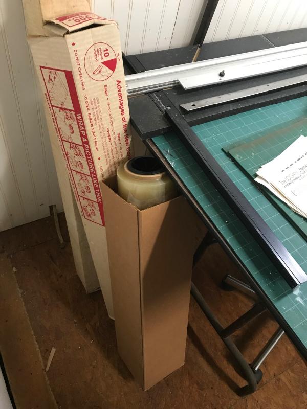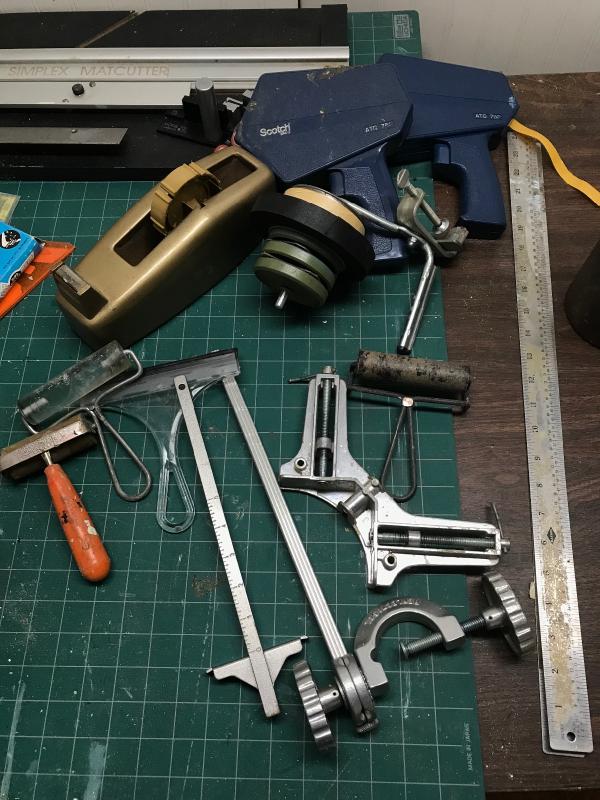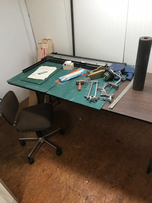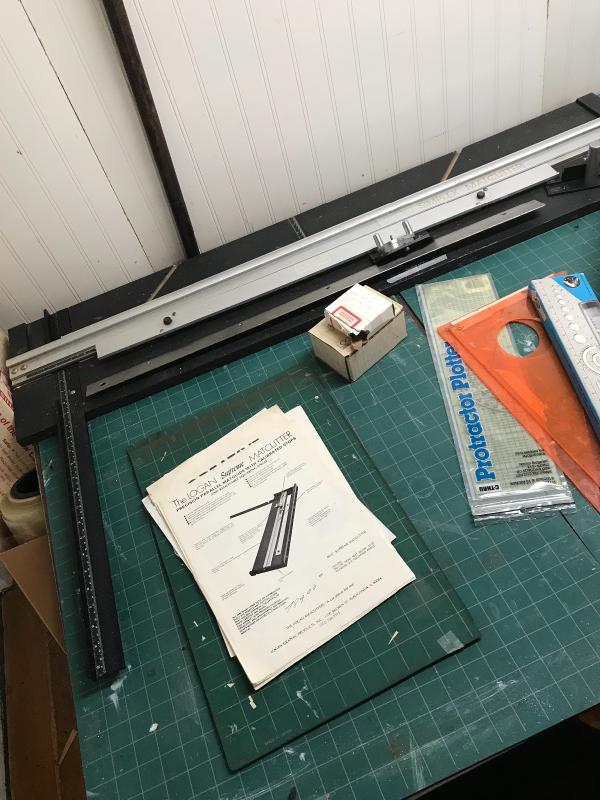 Simplex MatCutter with several boards, blades, rulers, tape dispensers, and plastic wrap for final project protection. Swivel chair and folding table included. This lot is available for local pick up in Asheville, NC only.