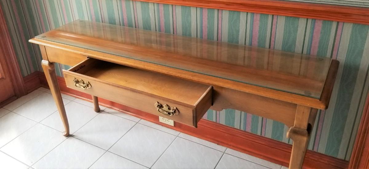 Nice Ethan Allen sofa table with drawer, finished on the back. Tempered glass top (removeable). 16" deep, 5 feet across, 27" tall. Good condition.