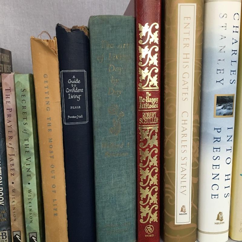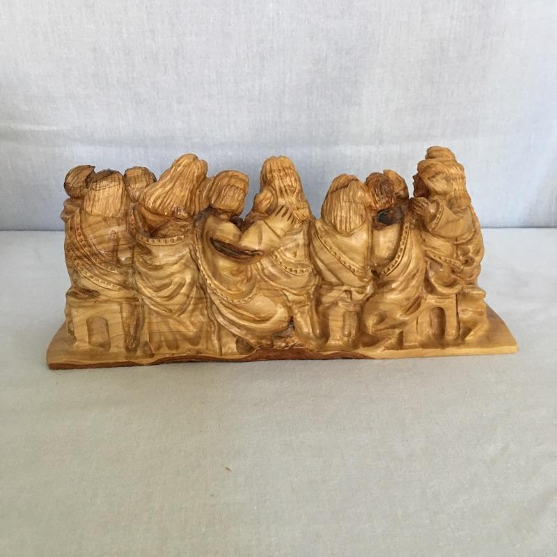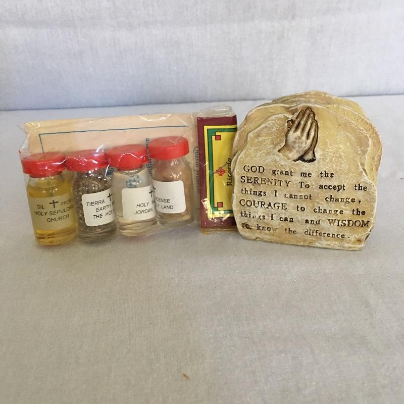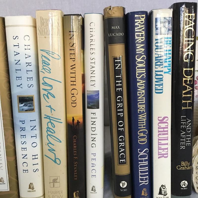 Faith books and more includes books by Billy Graham, Robert Schuller, Max Lucado and more, two small pillows, wooden statuette, wooden depiction of the last supper and more. Statuette measure 9.5” tall.