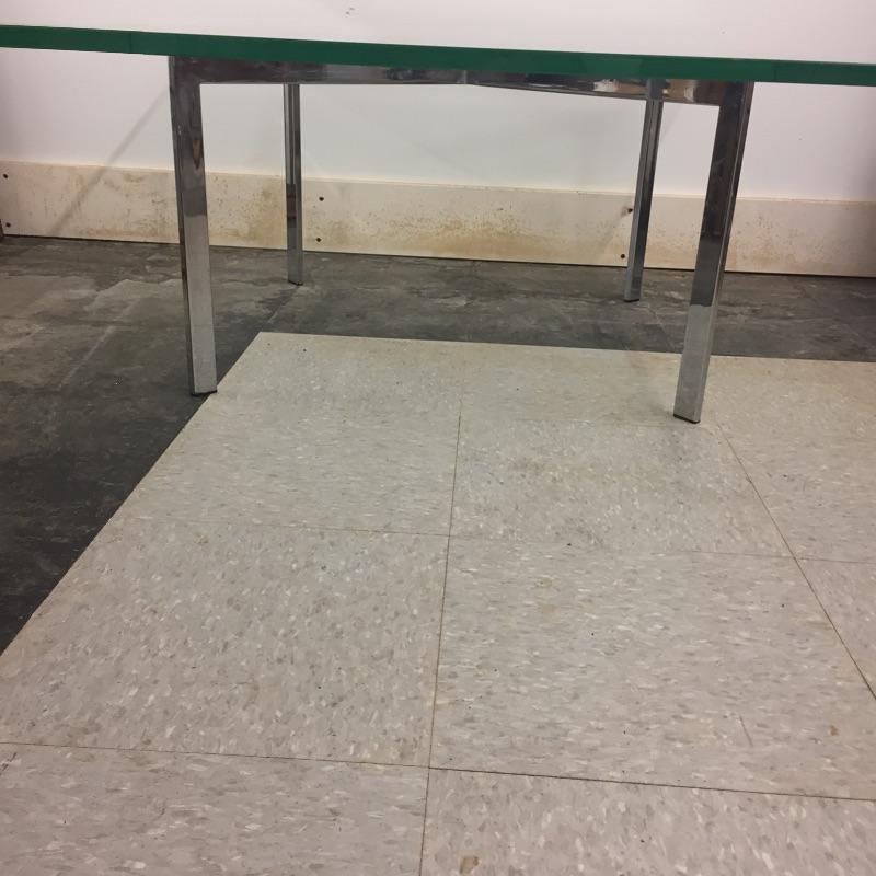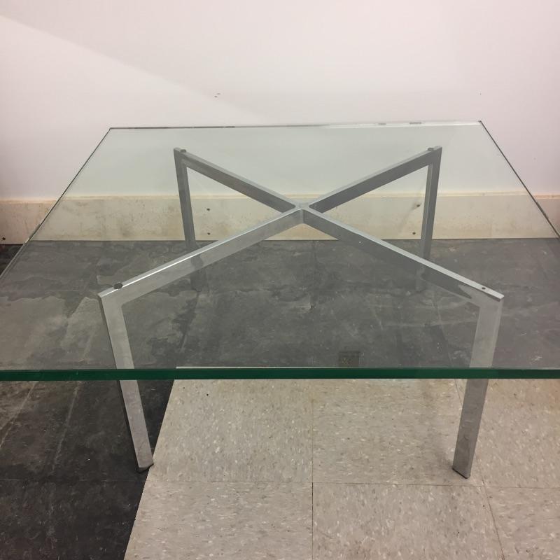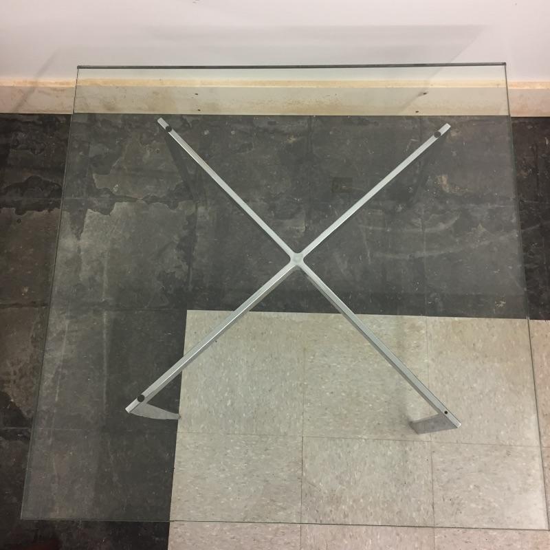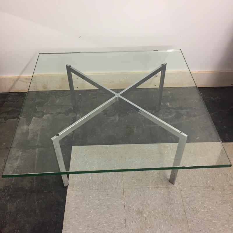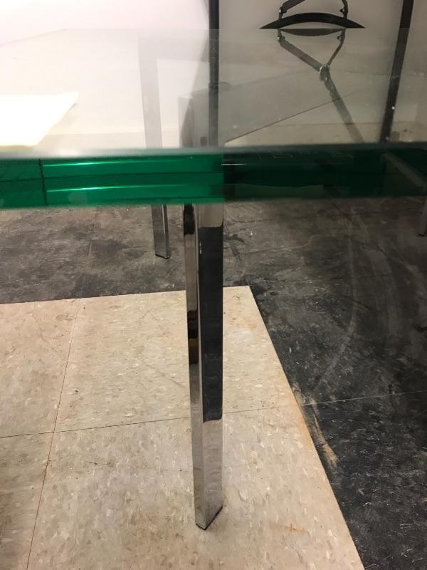 Heavy Glass and chrome coffee table. This modern table measures 36” x 36” x 16”. Glass is heavy and about 1/2” thick and it can be taken off for moving.