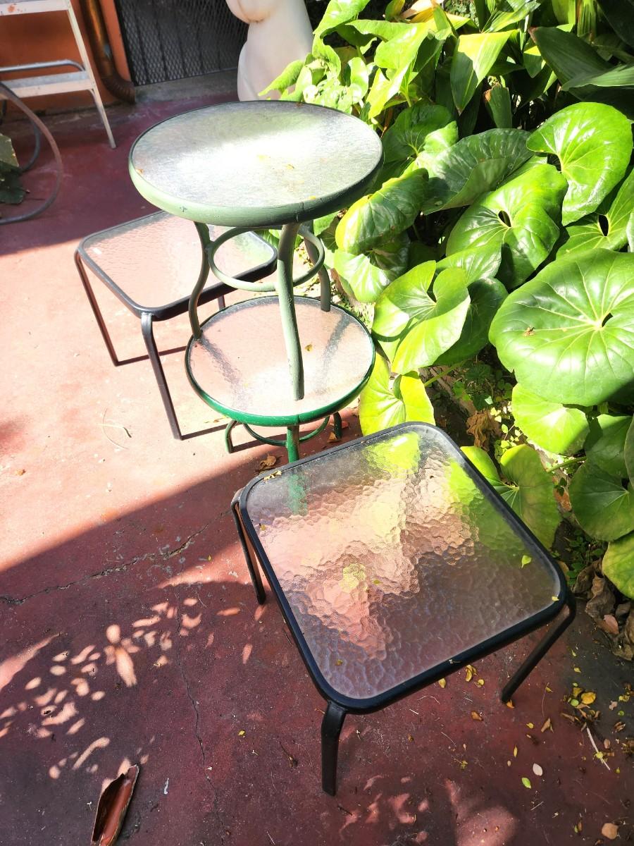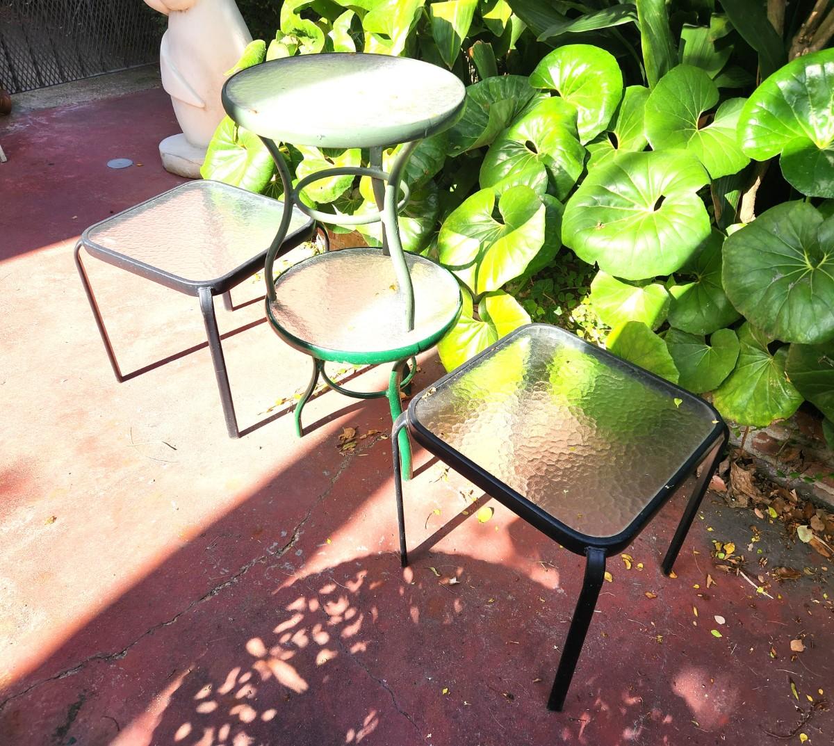 Group of 4 tempered glass small patio tables - good used condition. Round tables are 16" tall, 16" across. Squares are 17" tall and 16" x 16".